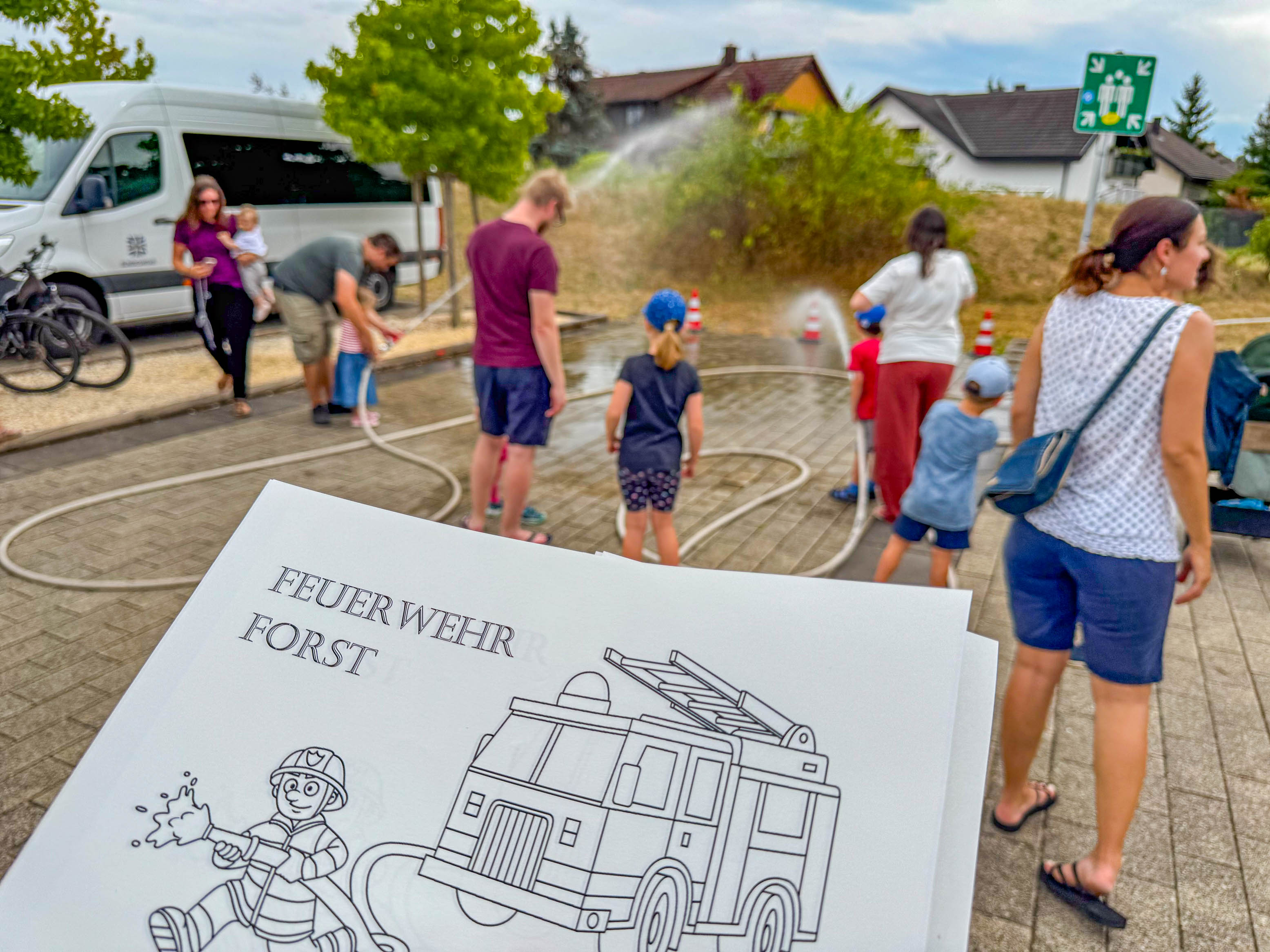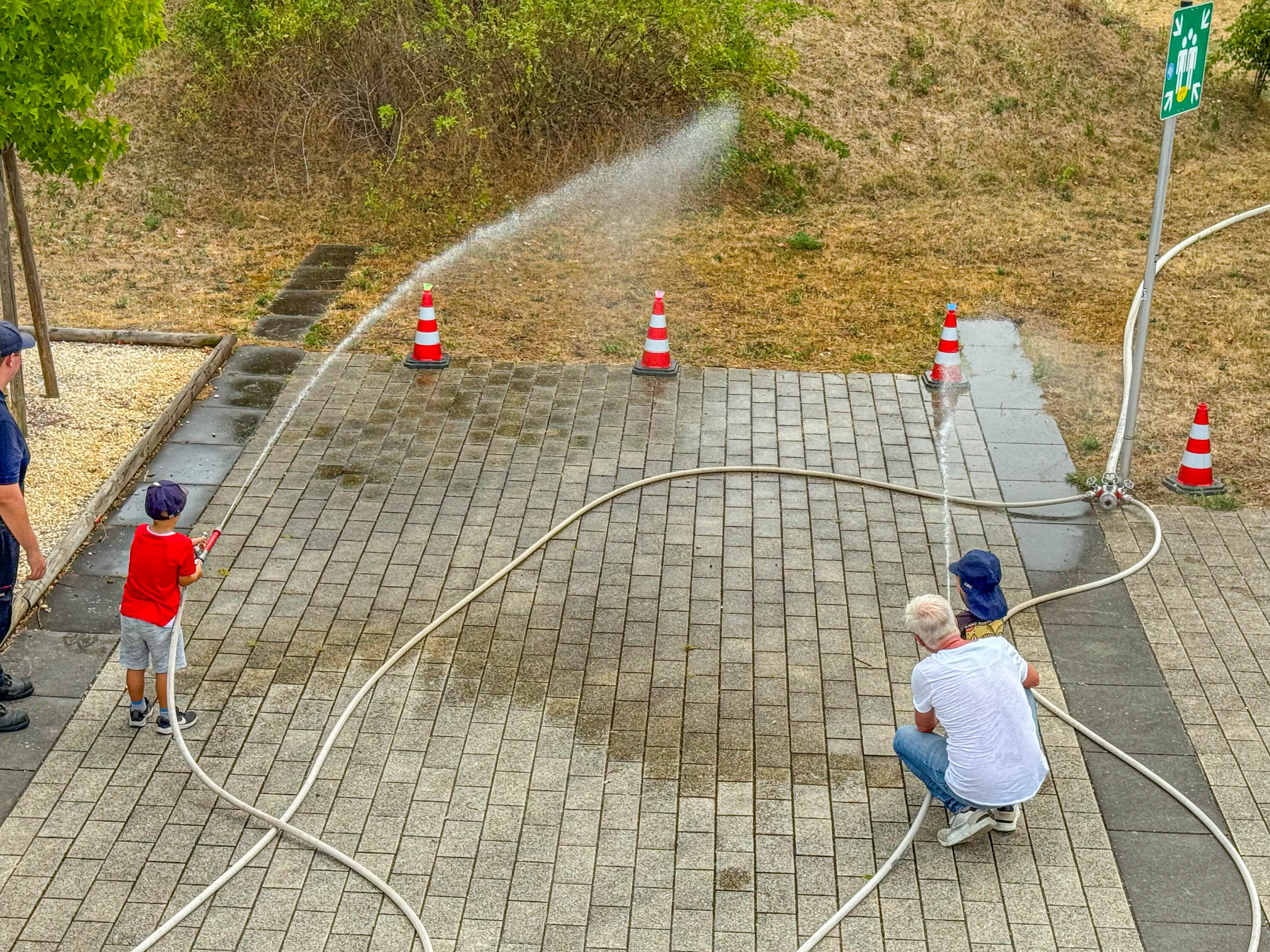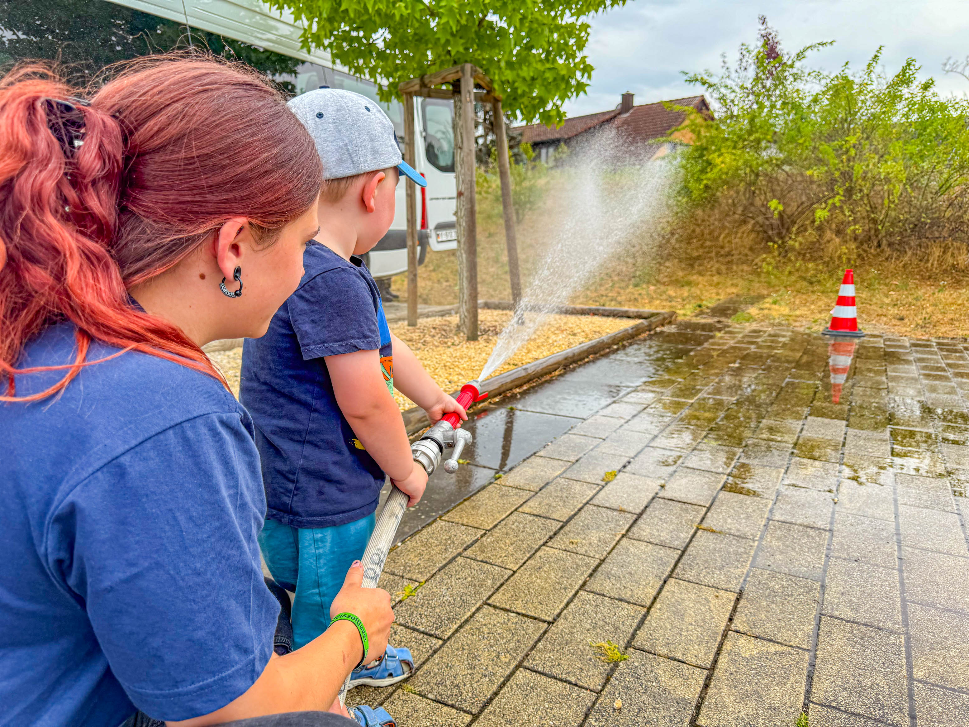 Bei schwülwarmen Temperaturen war unser Angebot besonders willkommen: Die Wasserspiele der Feuerwehr sorgten für Abkühlung und begeisterten insbesondere die Kinder und Jugendlichen, die sich mit Freude austobten. Parallel konnten Groß und Klein unser Löschfahrzeug aus nächster Nähe bestaunen und einen Einblick in unsere Technik und Ausrüstung gewinnen. Für die jüngsten Besucherinnen und Besucher gab es außerdem Feuerwehr-Ausmalbilder – ein kreatives Mitbringsel und eine schöne Erinnerung an das Wochenende.