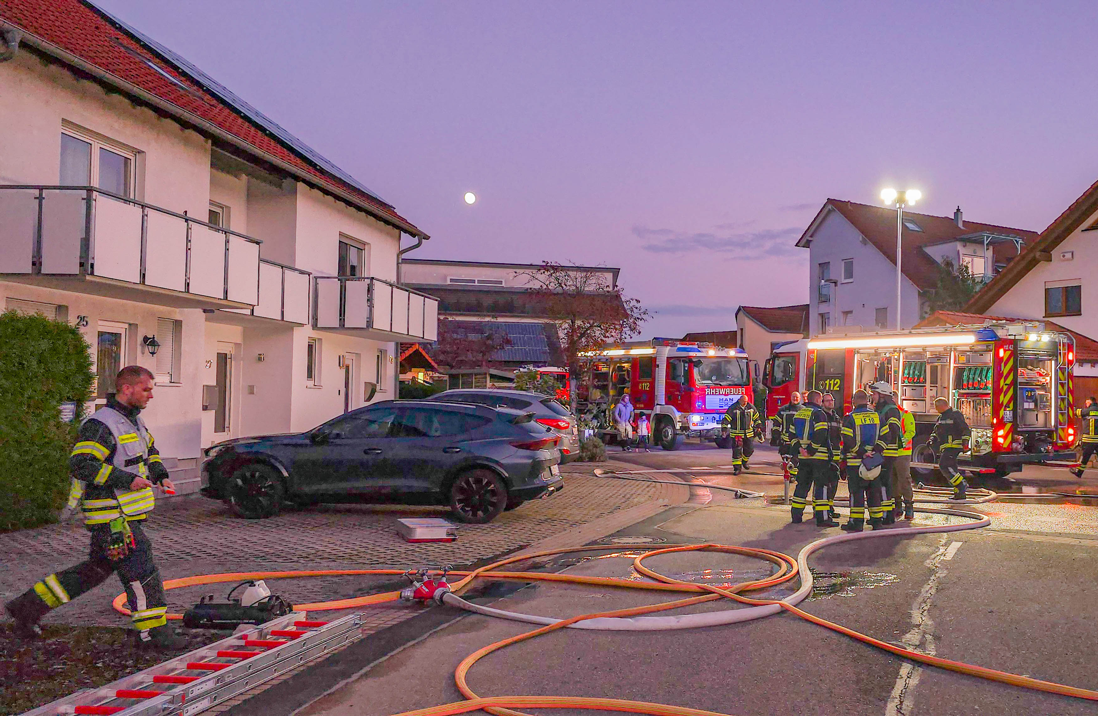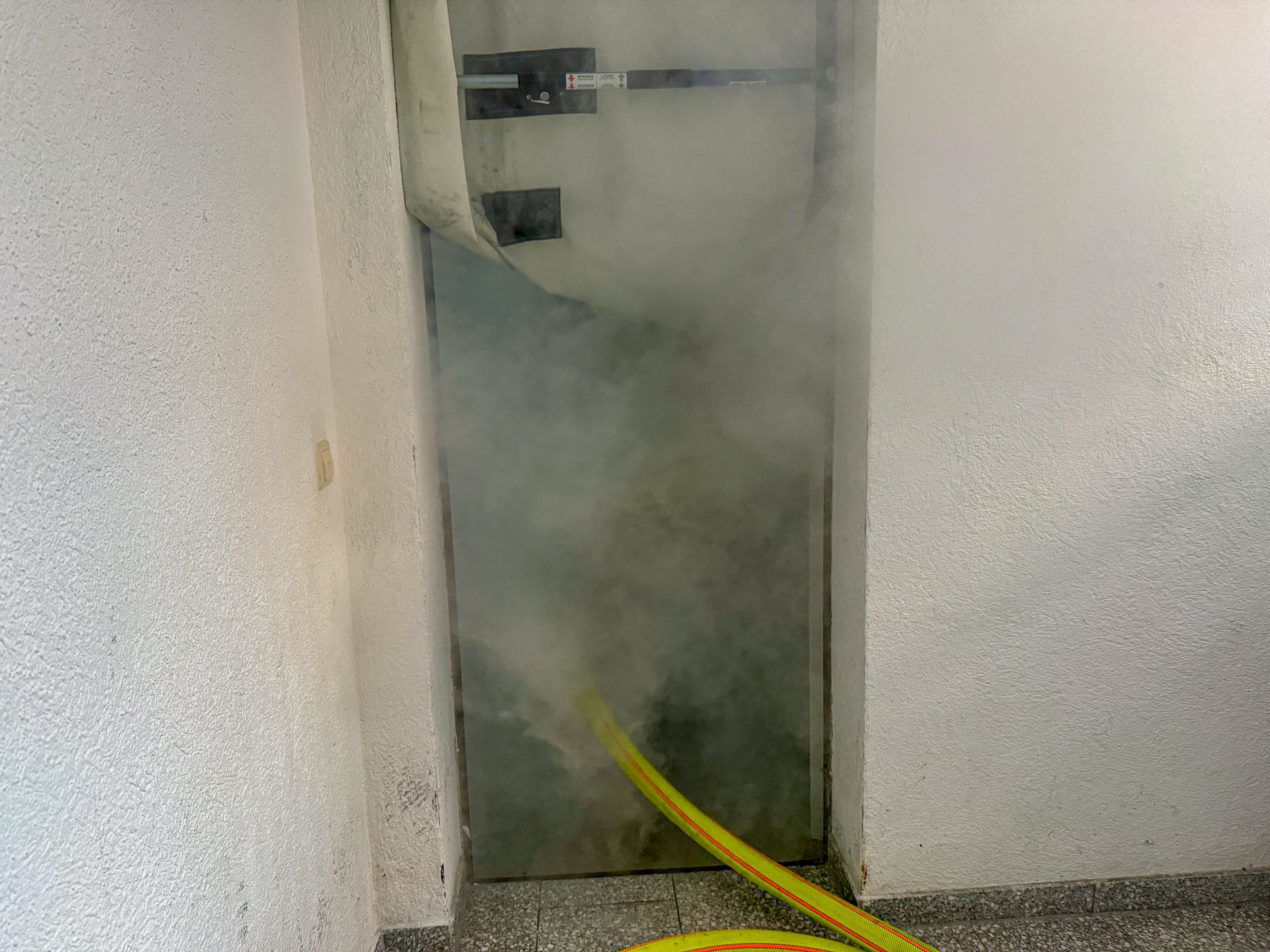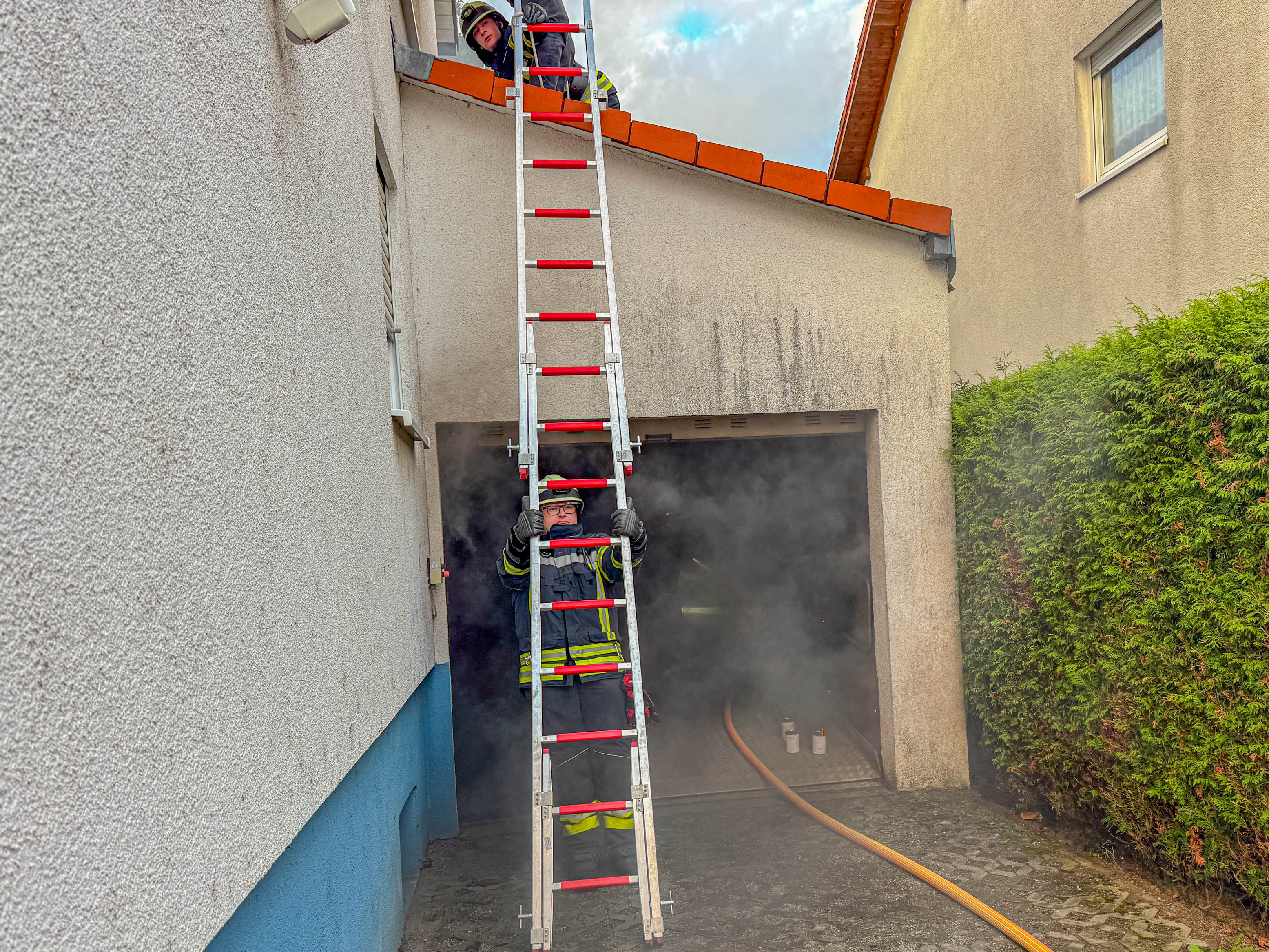 Unter dem Stichwort „Brand 4 – Feuer, Menschenleben in Gefahr“ probten die Einsatzkräfte ein äußerst realitätsnahes Szenario: Nach einer angenommenen Explosion während einer Grillparty stand eine an ein Mehrfamilienhaus angebaute Garage in Vollbrand. Die Flammen hatten bereits über ein Kellerfenster auf die Kellerräume des Hauses übergegriffen, dichter Rauch drang aus mehreren Öffnungen und erschwerte die Orientierung erheblich. Insgesamt mussten drei Personen aus lebensbedrohlichen Situationen gerettet werden – eine Person befand sich auf dem Dach der Garage, eine Übungspuppe wurde in der stark verrauchten Garage vermisst, und eine weitere Person galt im mit Kunstnebel gefüllten Keller als verschollen.