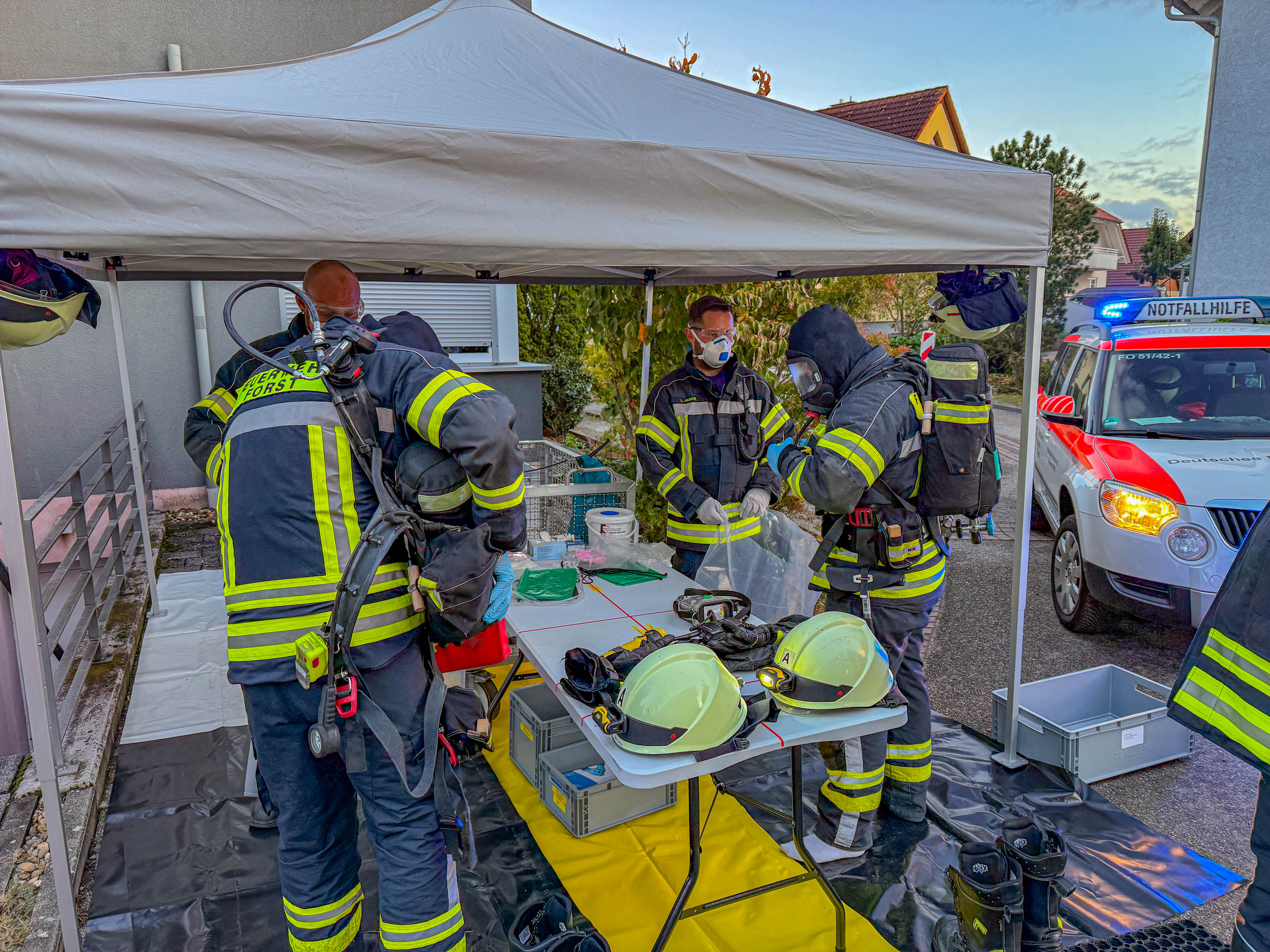 Das Übungsszenario stellte sich als besonders anspruchsvoll heraus, da gleich drei Personen an verschiedenen Orten in akuter Lebensgefahr waren und gleichzeitig eine Brandausbreitung auf das Wohnhaus sowie benachbarte Gebäude verhindert werden musste. Aufgrund der Komplexität wurde das Alarmstichwort fiktiv von „Brand 4“ auf „Brand 5“ erhöht.