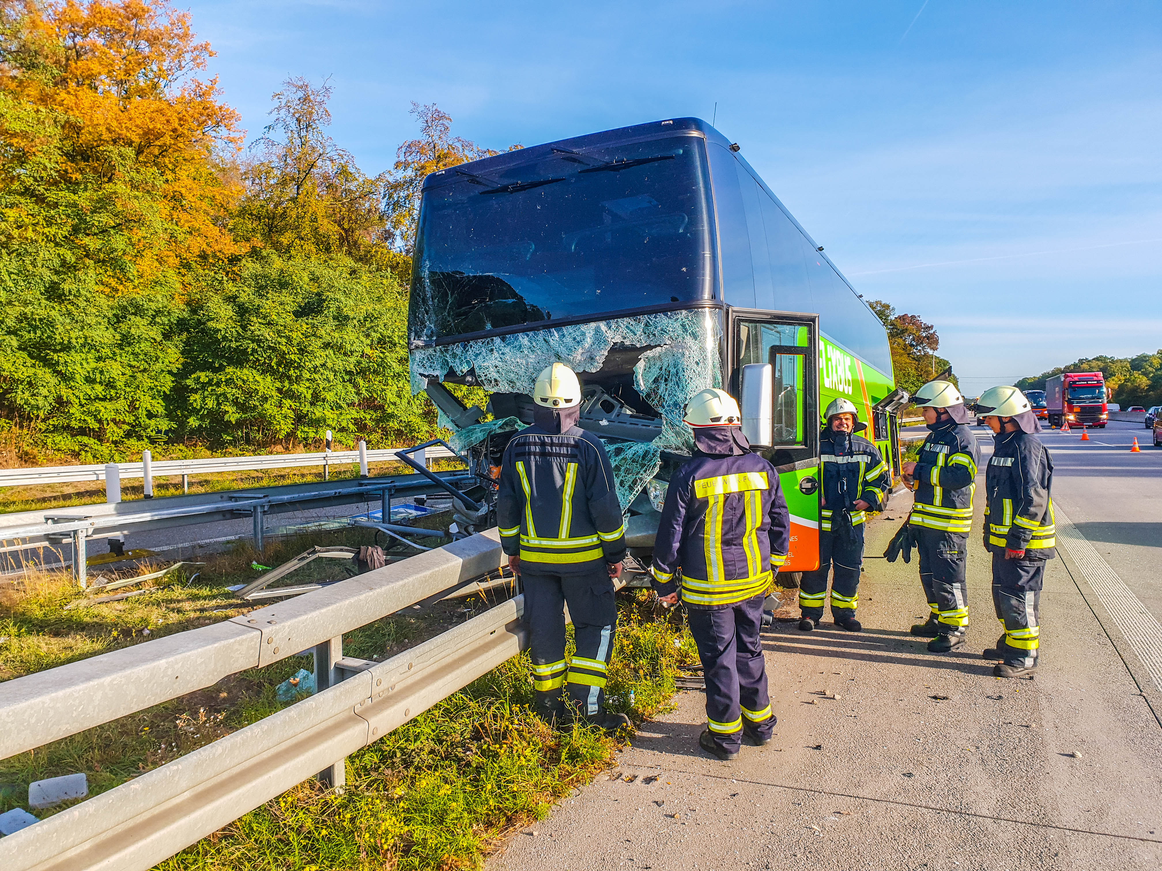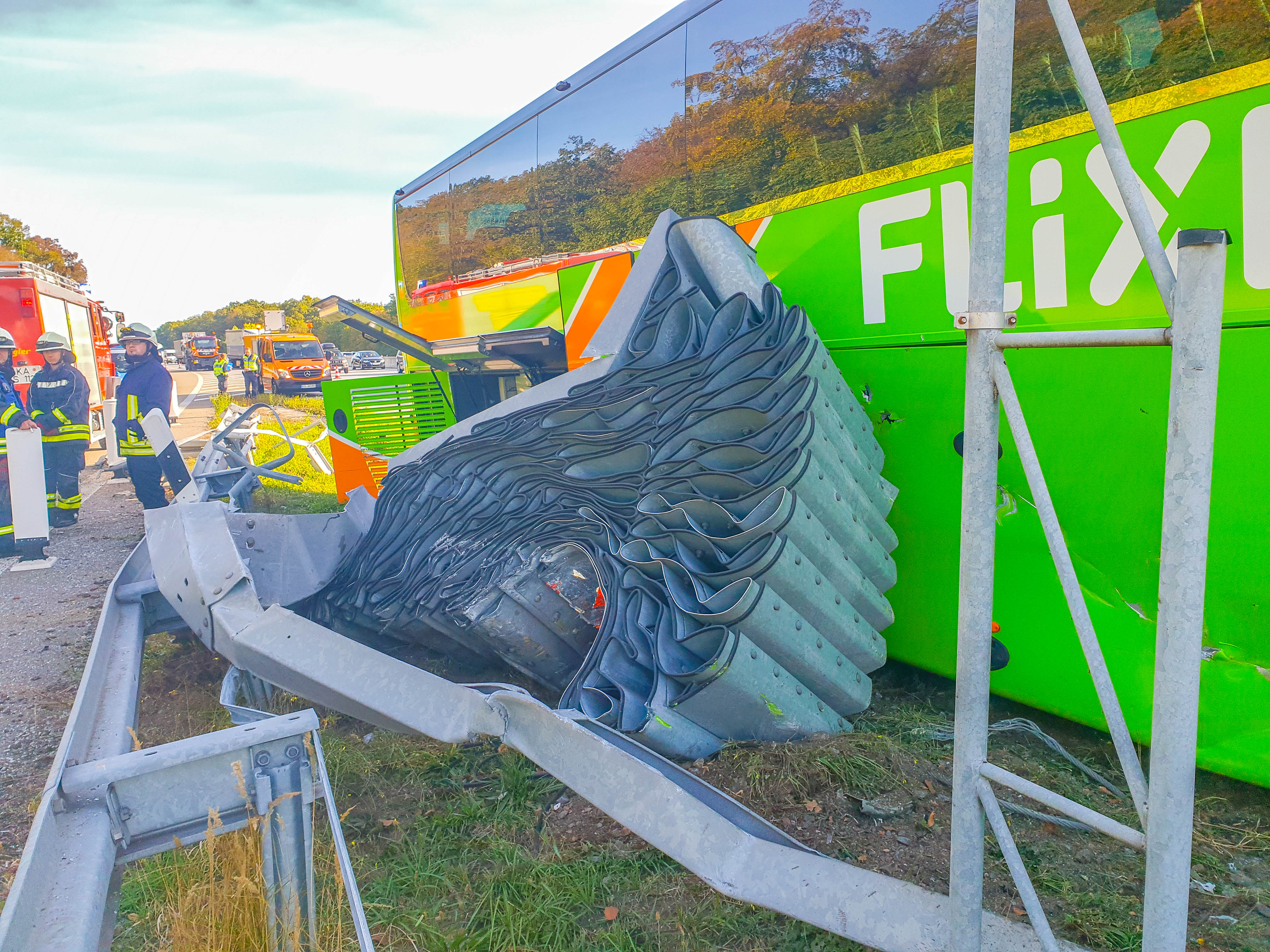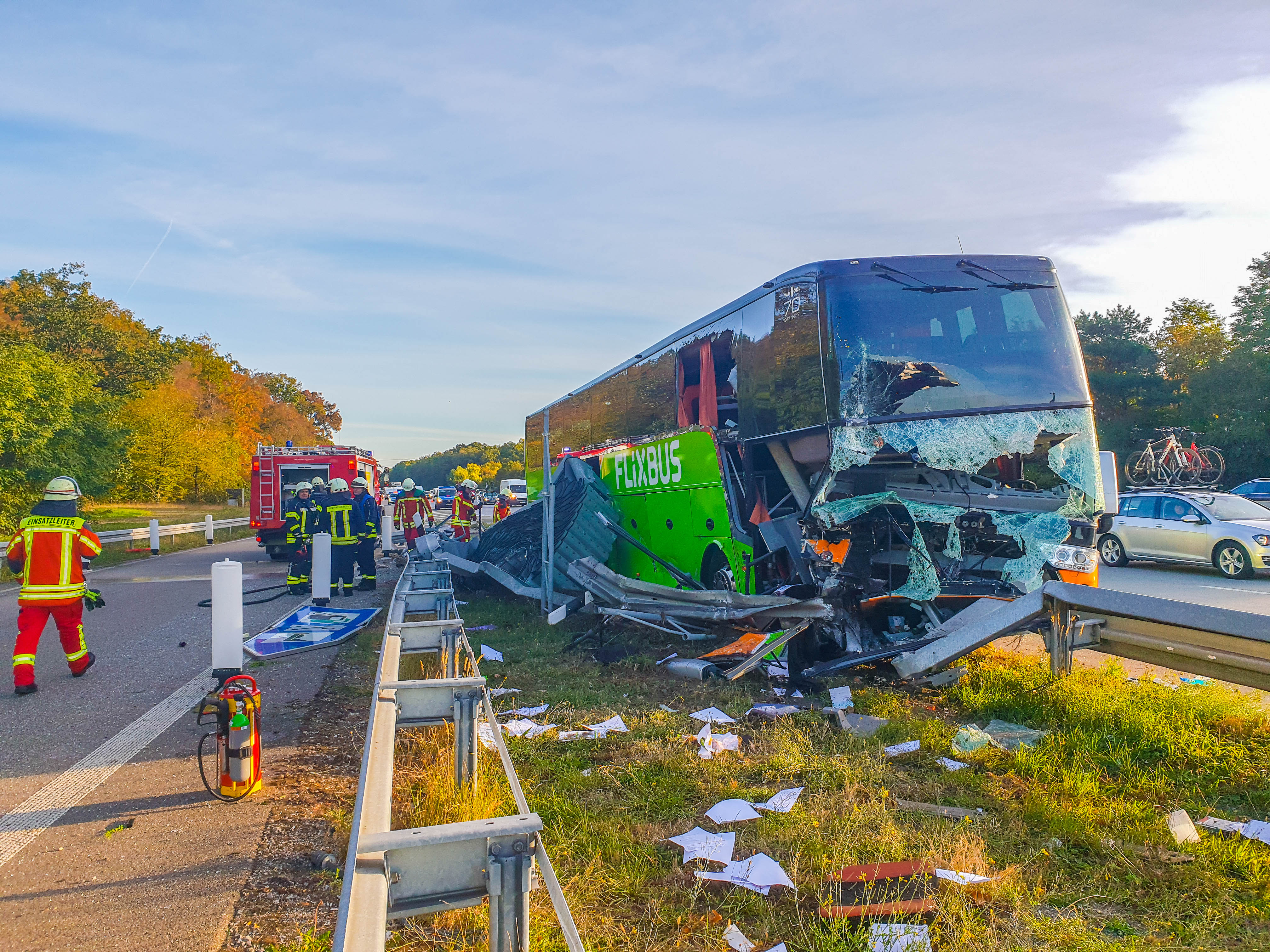 Ein mit etwa 43 Personen besetzter Reisebus eines Fernbusunternehmens befuhr die Bundesautobahn BAB5 in Fahrtrichtung Karlsruhe. Auf Höhe des Rasthofes Bruchsal West krachte der Reisebus aus bislang ungeklärter Ursache in die Leitplanken, schob diese zusammen und kam schließlich völlig zerstört zum Stehen.