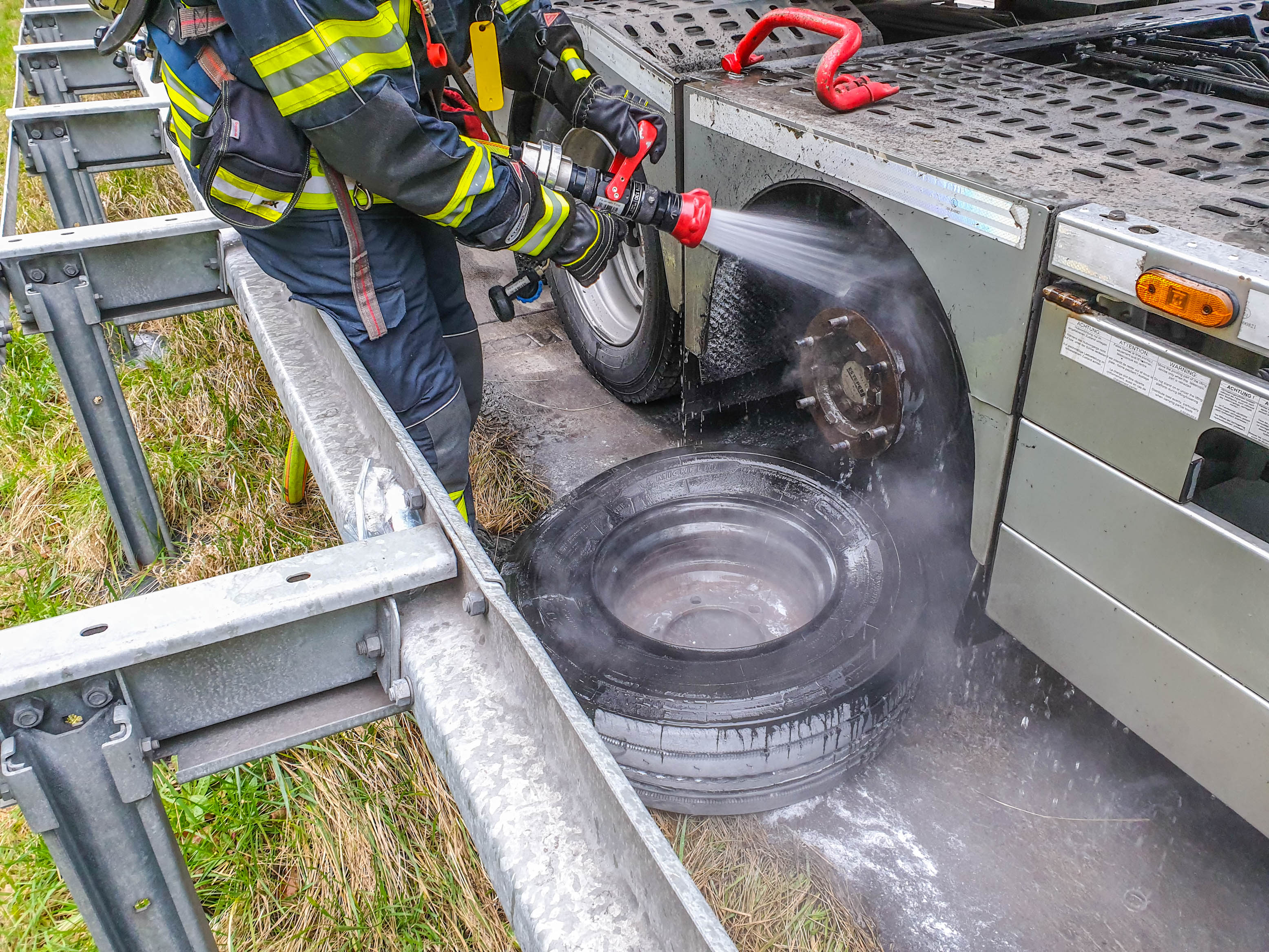 Die Freiwilligen Feuerwehren aus Forst und Bruchsal wurden daraufhin alarmiert und konnten eine leichte Rauchentwicklung beim Eintreffen an der Einsatzstelle feststellen. Mit einem Trupp unter Atemschutz ging die Freiwillige Feuerwehr Forst vor und konnte den Reifen und die Fahrzeugumgebung herunterkühlen. Der Reifen wurde im Anschluss demontiert und mit der Wärmebildkamera kontrolliert.