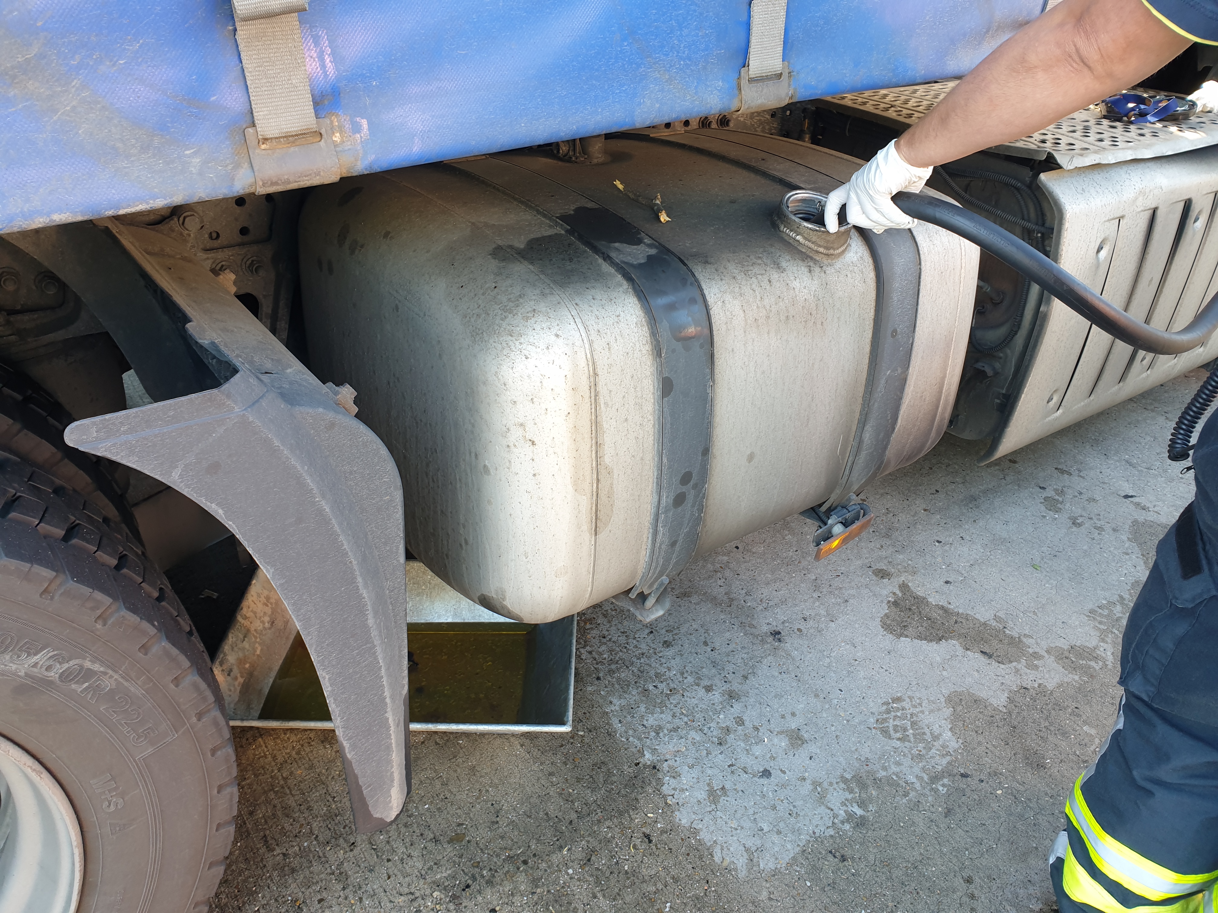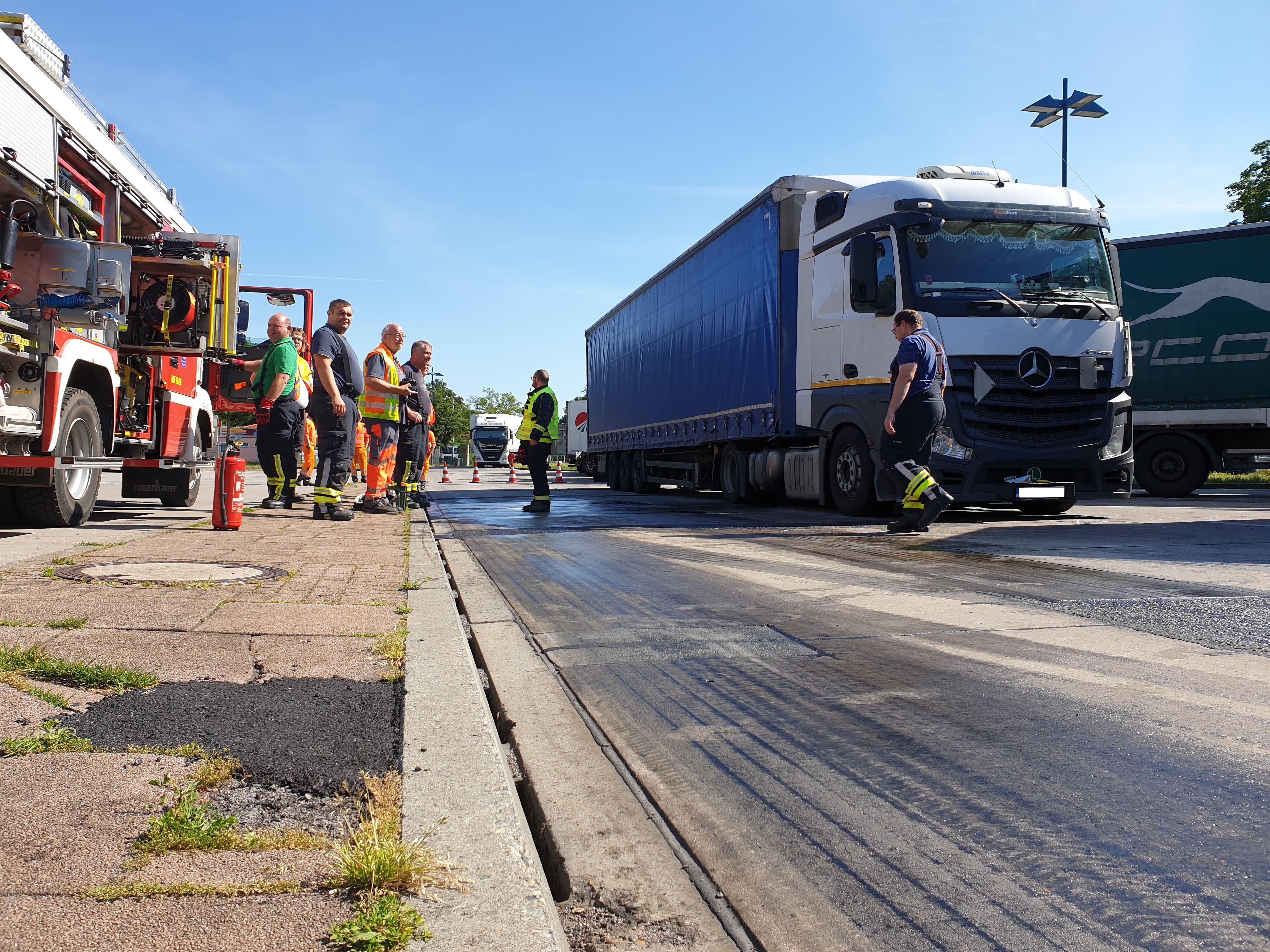 An der Einsatzstelle erwartete bereits die Polizei das Eintreffen der Feuerwehr. Ein Sattelzug hatte auf der Autobahn einen Gegenstand überfahren und sich dabei seinen Kraftstofftank beschädigt. In der Folge liefen größere Mengen Dieselkraftstoff ungehindert auf die Fahrbahn des Rasthofes. Die Lage wurde erkundet und das Leck zunächst mittels Dichtpaste abgedichtet. Im weiteren Verlauf musste der Kraftstofftank durch die Feuerwehr umgepumpt werden.