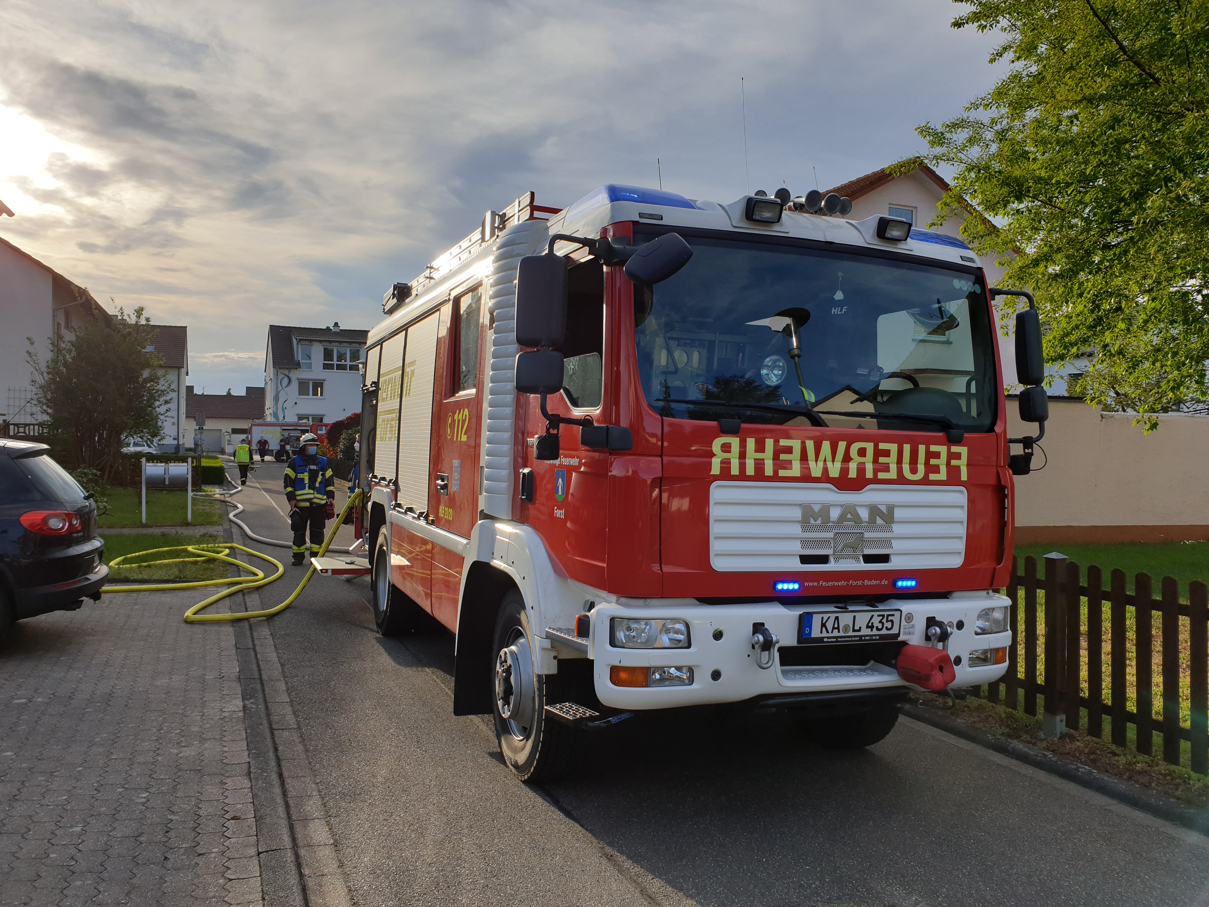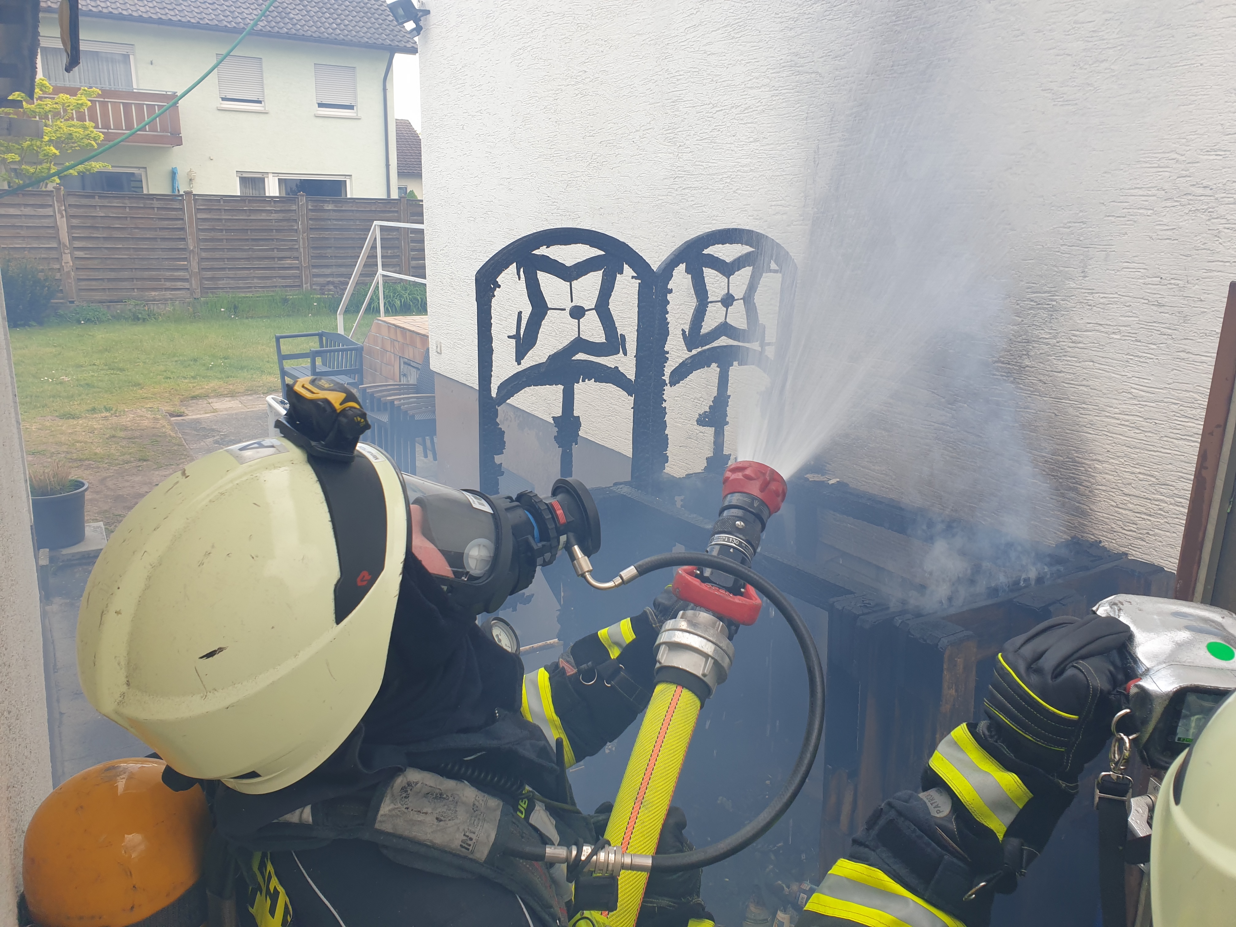 Beim Eintreffen war bereits eine entsprechende Rauchentwicklung sichtbar und die Feuerwehr wurde durch Bewohner bereits eingewiesen. Ein kleiner Holzverschlag zwischen einem Wohngebäude und einer Garage war in Brand geraten. Durch den Flammenschlag und die Rauchentwicklung war bereits die Hausfassade in Mitleidenschaft gezogen worden. Mit einem Rohr unter Atemschutz konnte der Brand rasch gelöscht und ein Flammenübergriff bei sommerlich warmen Temperaturen verhindert werden.