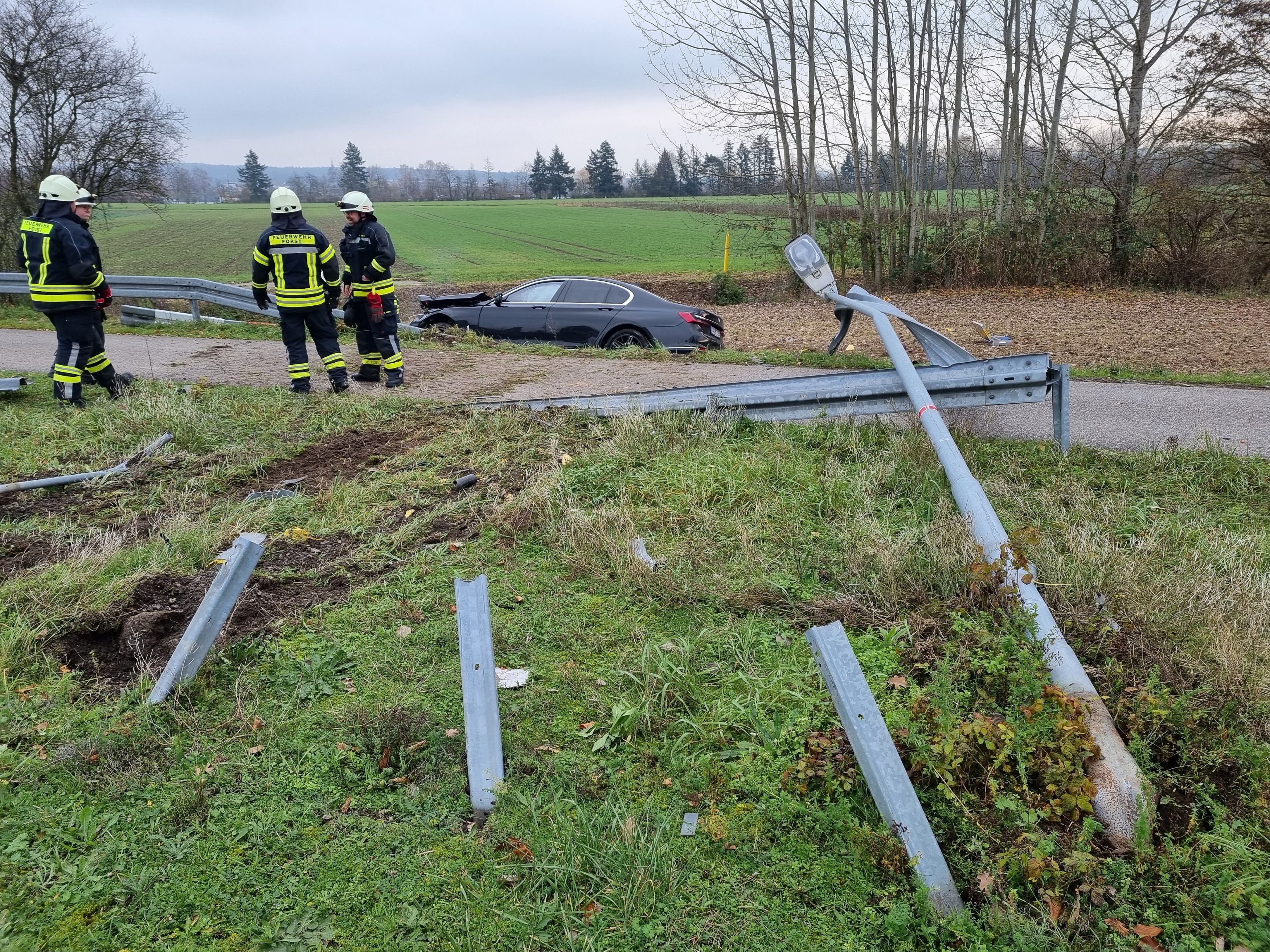 Ein BMW kam offenbar aufgrund überhöhter Geschwindigkeit von der Fahrbahn ab und durchbrach die Leitplanken ehe das Fahrzeug im angrenzenden Feld zum Stehen kam. Die Insassen blieben glücklicherweise weitestgehend unverletzt. Der BMW und die Leitplanken, sowie eine Laterne wurden jedoch stark beschädigt. Der Rettungsdienst rückte sicherheitshalber mit drei Rettungsfahrzeugen an.