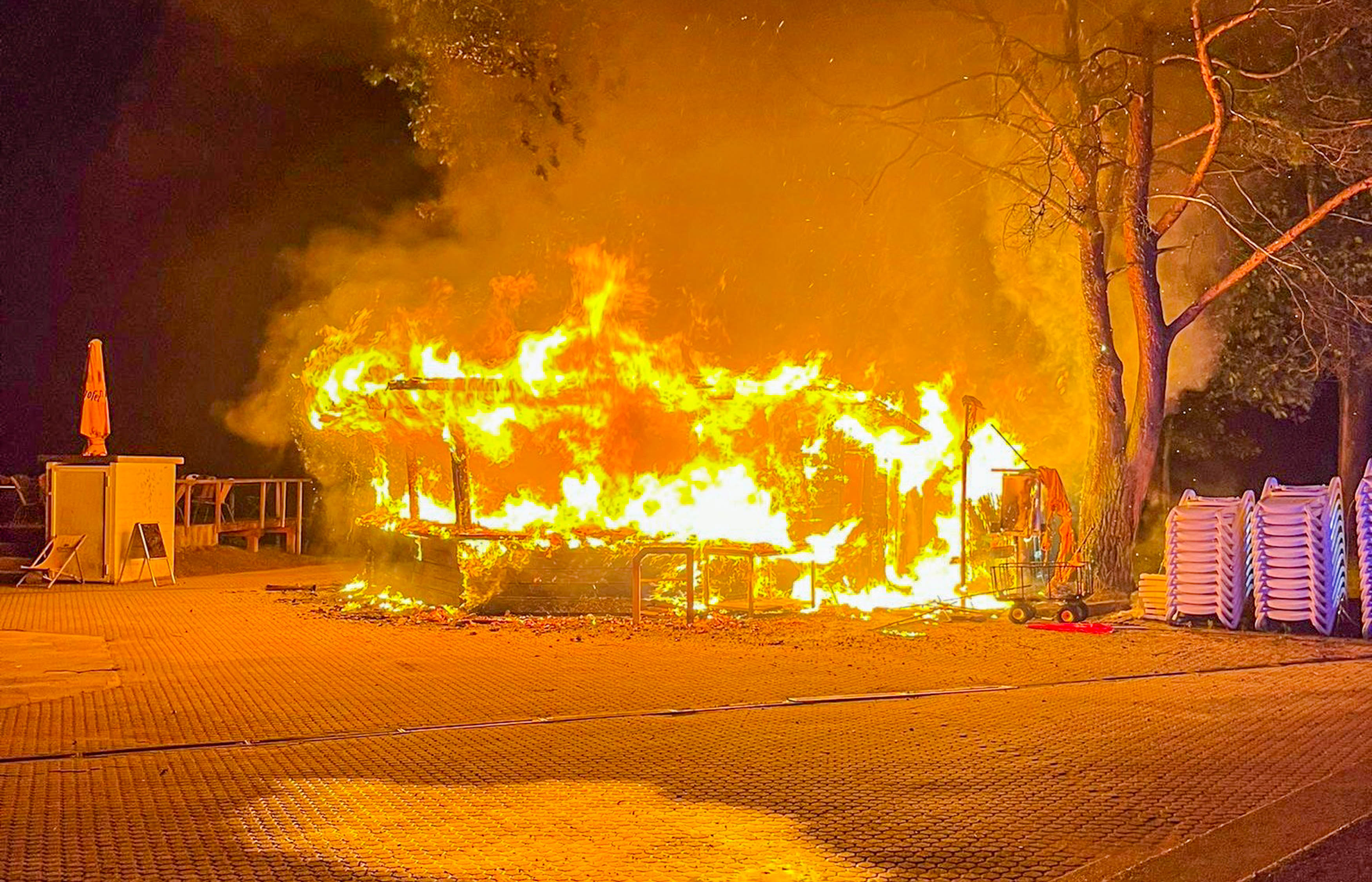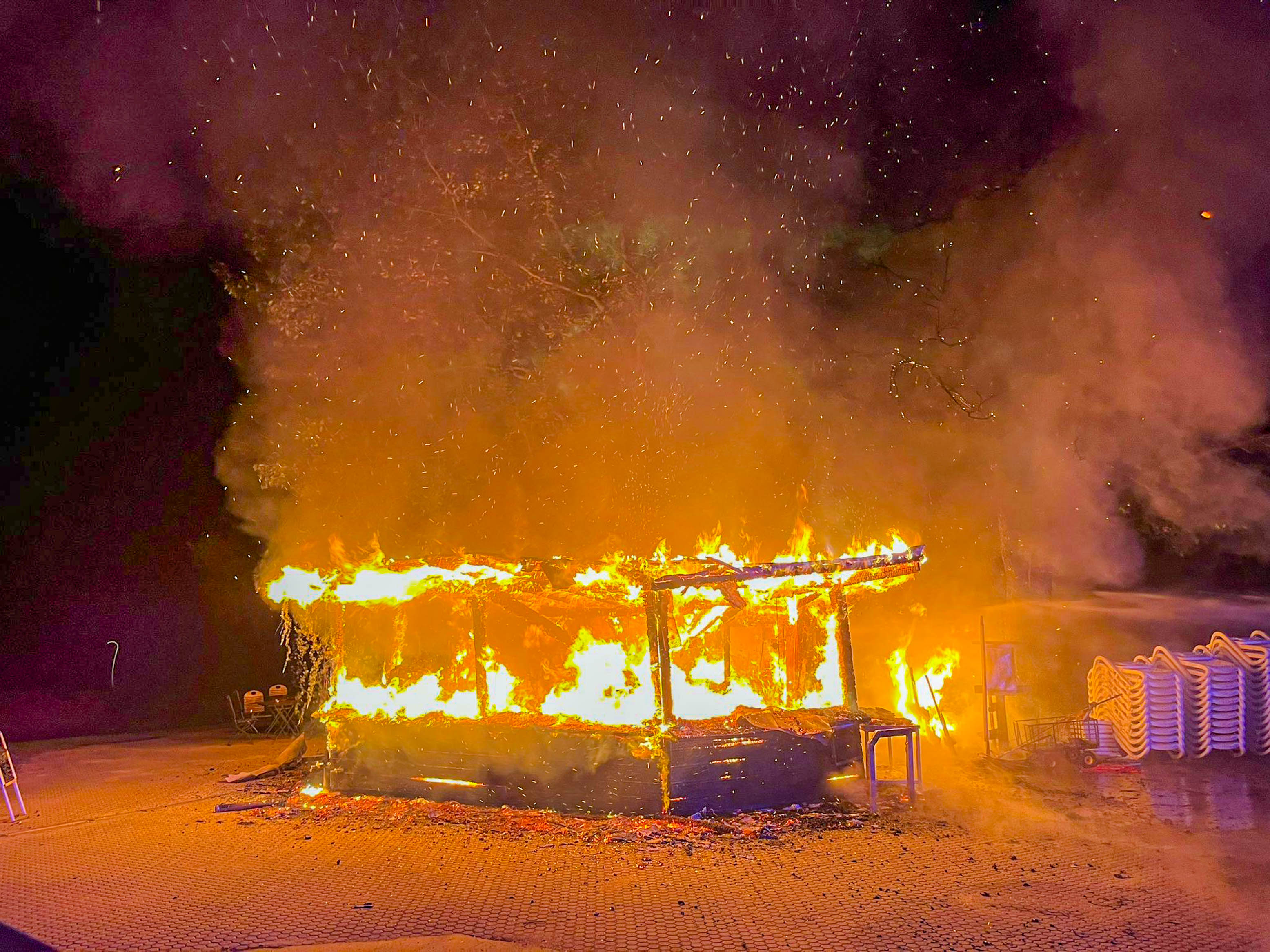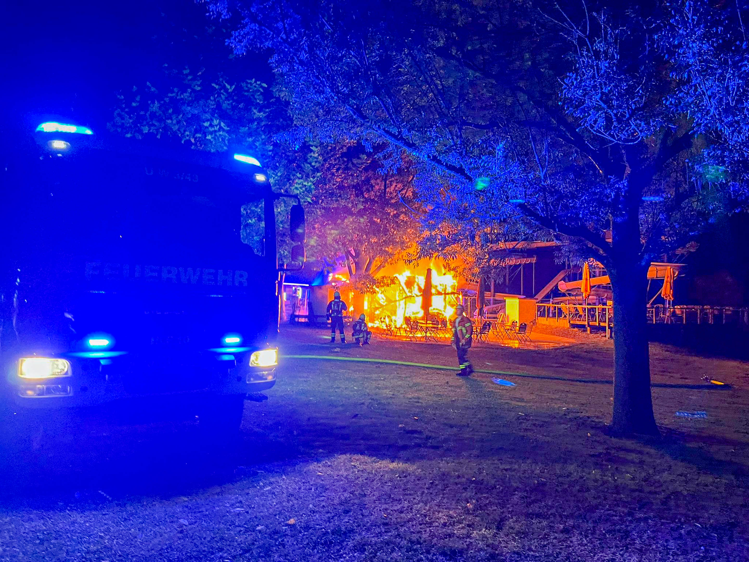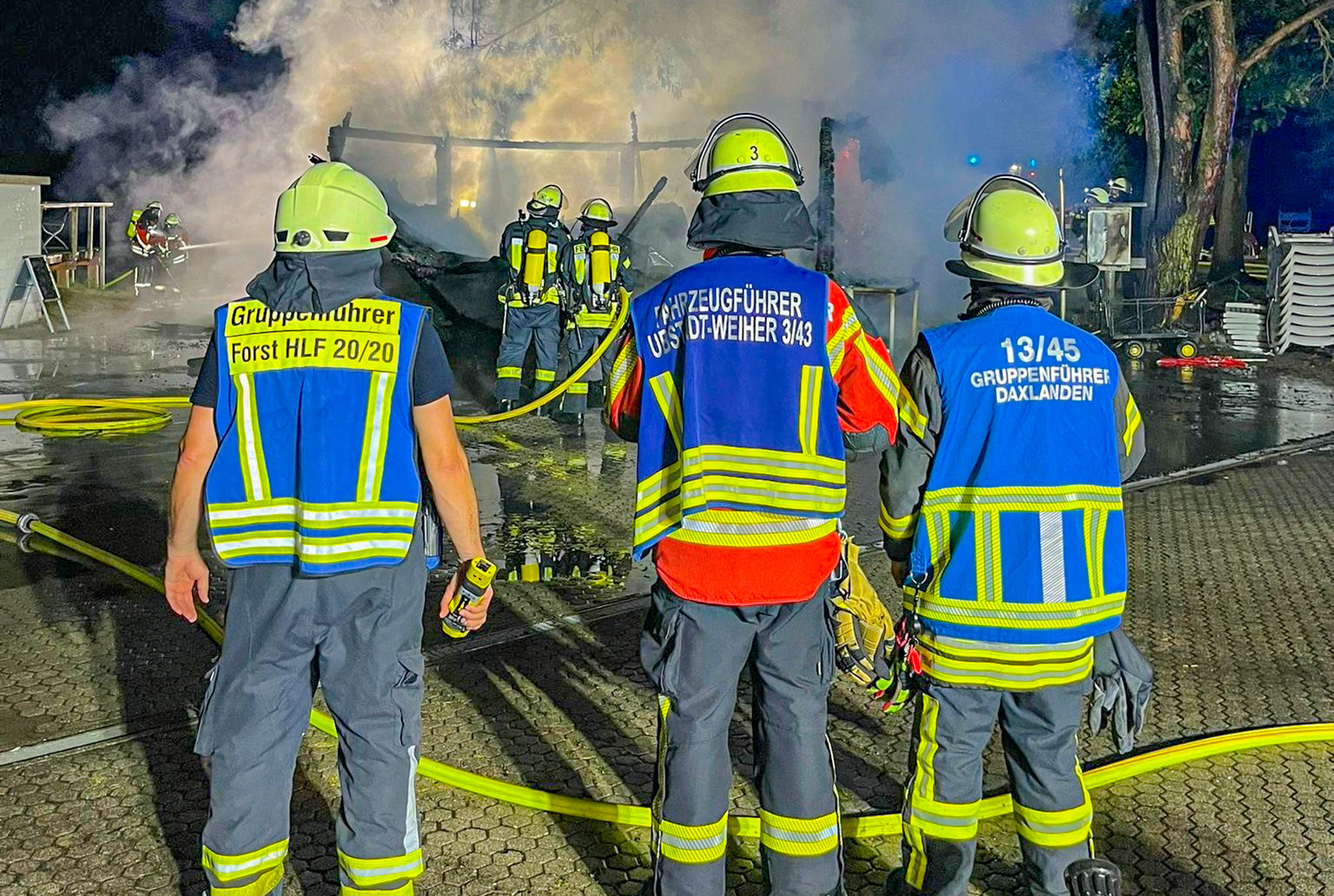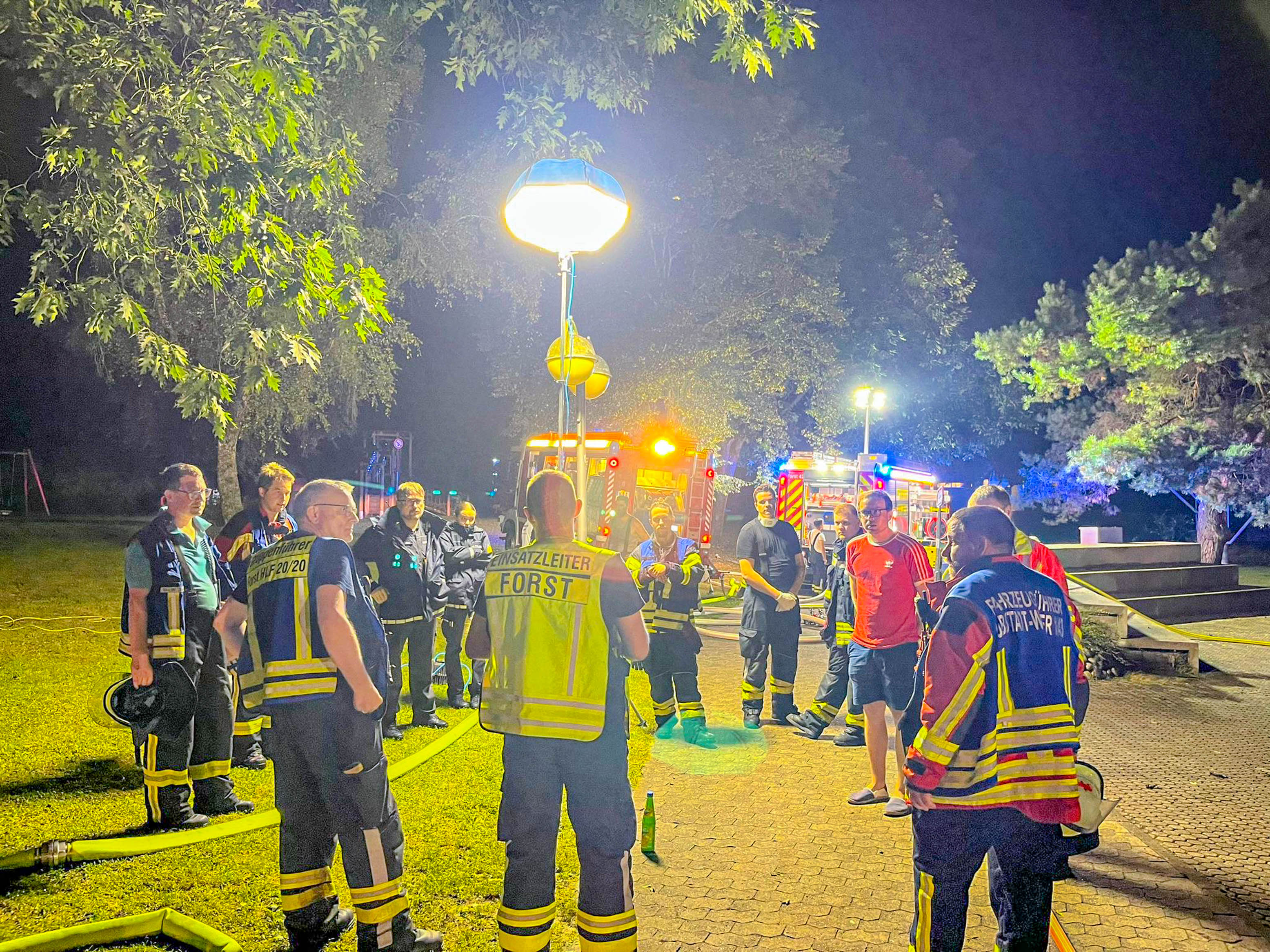 Besonders hervorzuheben war eine zeitkritische Einsatzmeldung gegen kurz nach 23.30 Uhr vom Heidesee in Forst. Notrufteilnehmer meldeten einen Feuerschein im Bereich des Badesees. Umgehend wurden die Forster Einsatzkräfte ausgelöst und an den Heidesee entsandt. Schnell wurde klar, dass es sich um einen größeren Brand handelte. Der Kiosk auf dem Heideseegelände stand lichterloh in Vollbrand. Ein dahinterliegender Gastank war akut gefährdet. Das Alarmstichwort wurde erhöht und kurzerhand neben einem Löschfahrzeug der ebenfalls im Ort eingesetzten Feuerwehr KA-Daxlanden, sowie drei weitere Löschfahrzeuge der Feuerwehren aus Weiher, Ubstadt und Stettfeld nachgefordert.