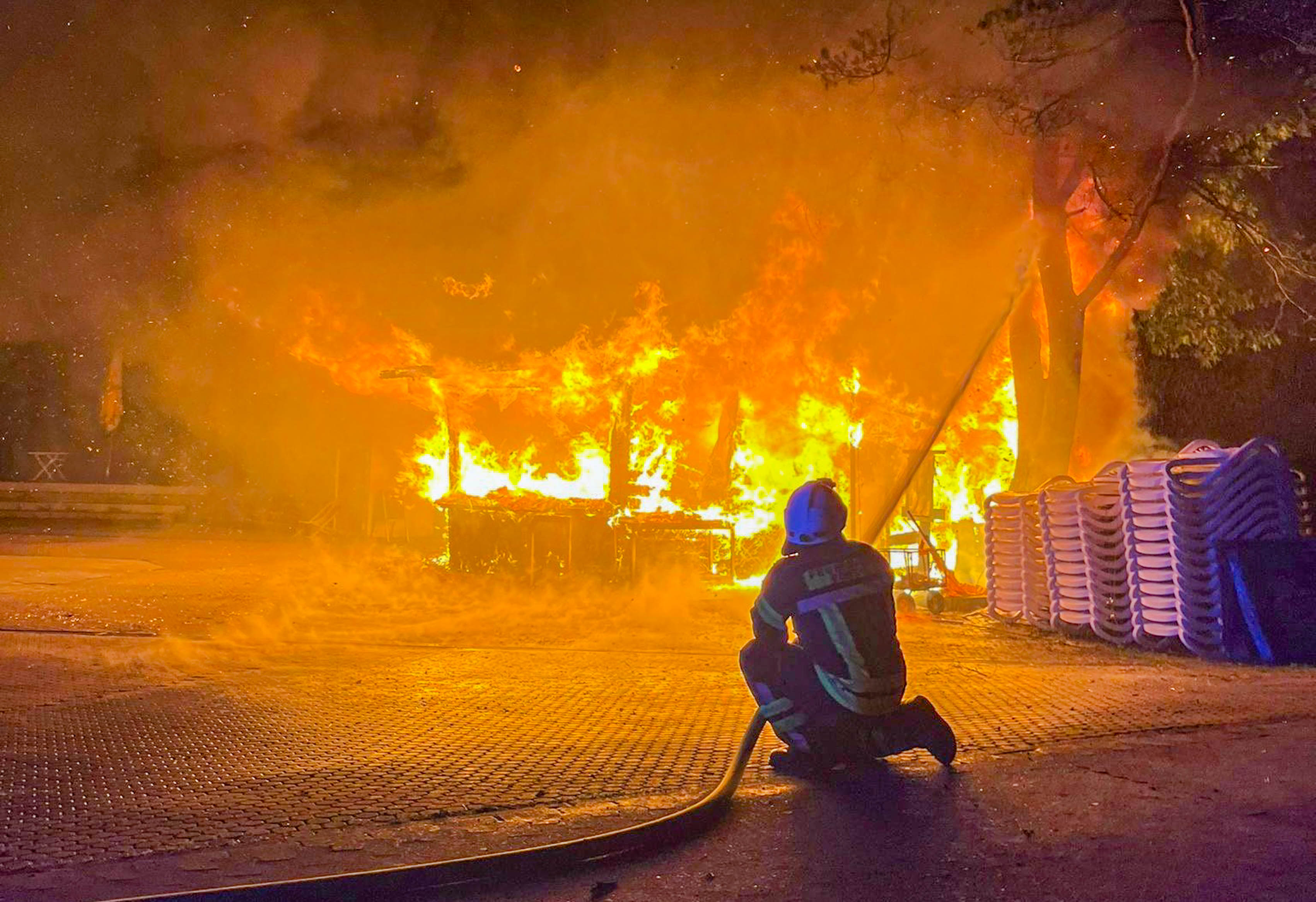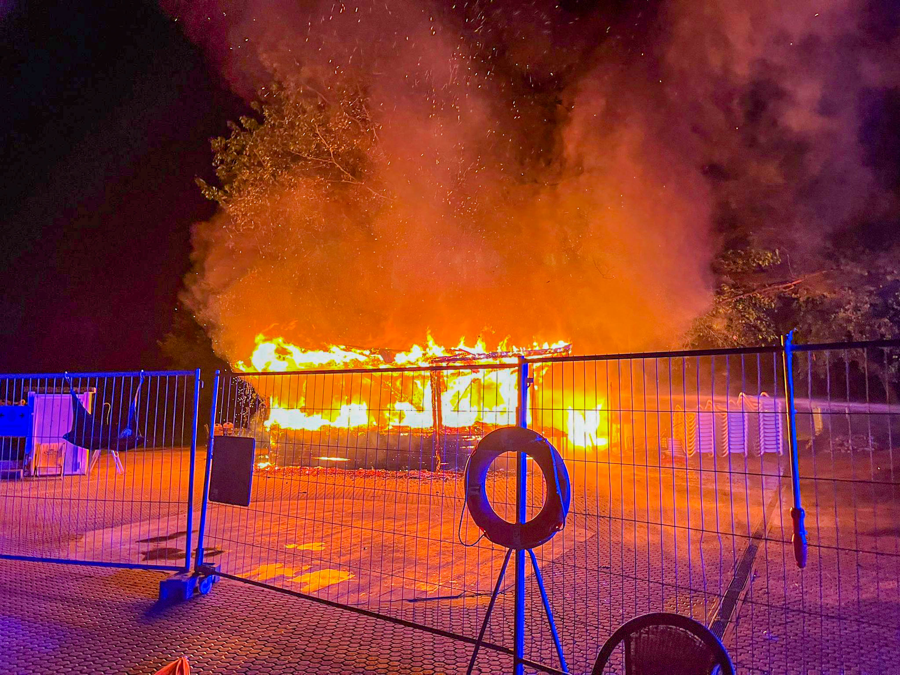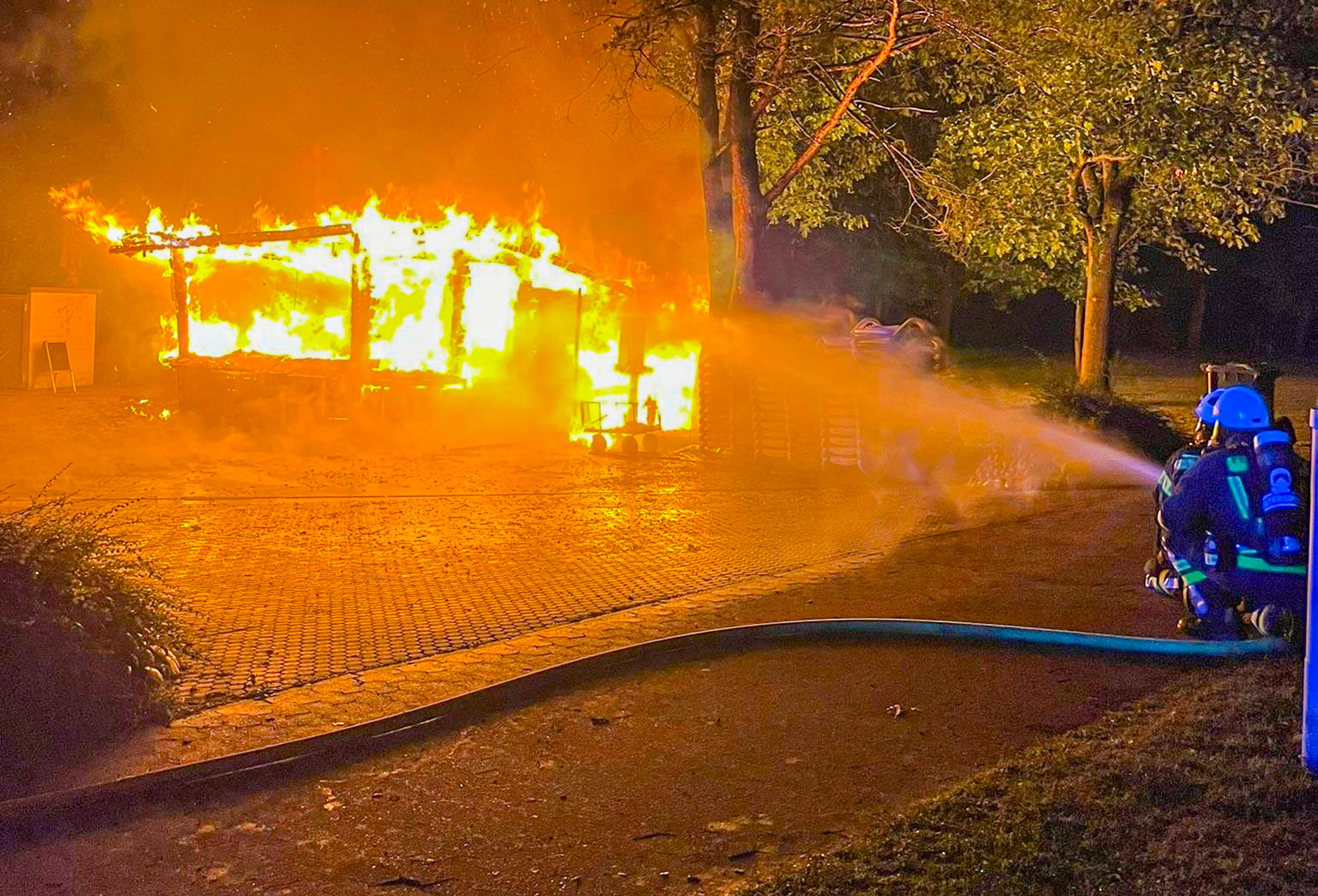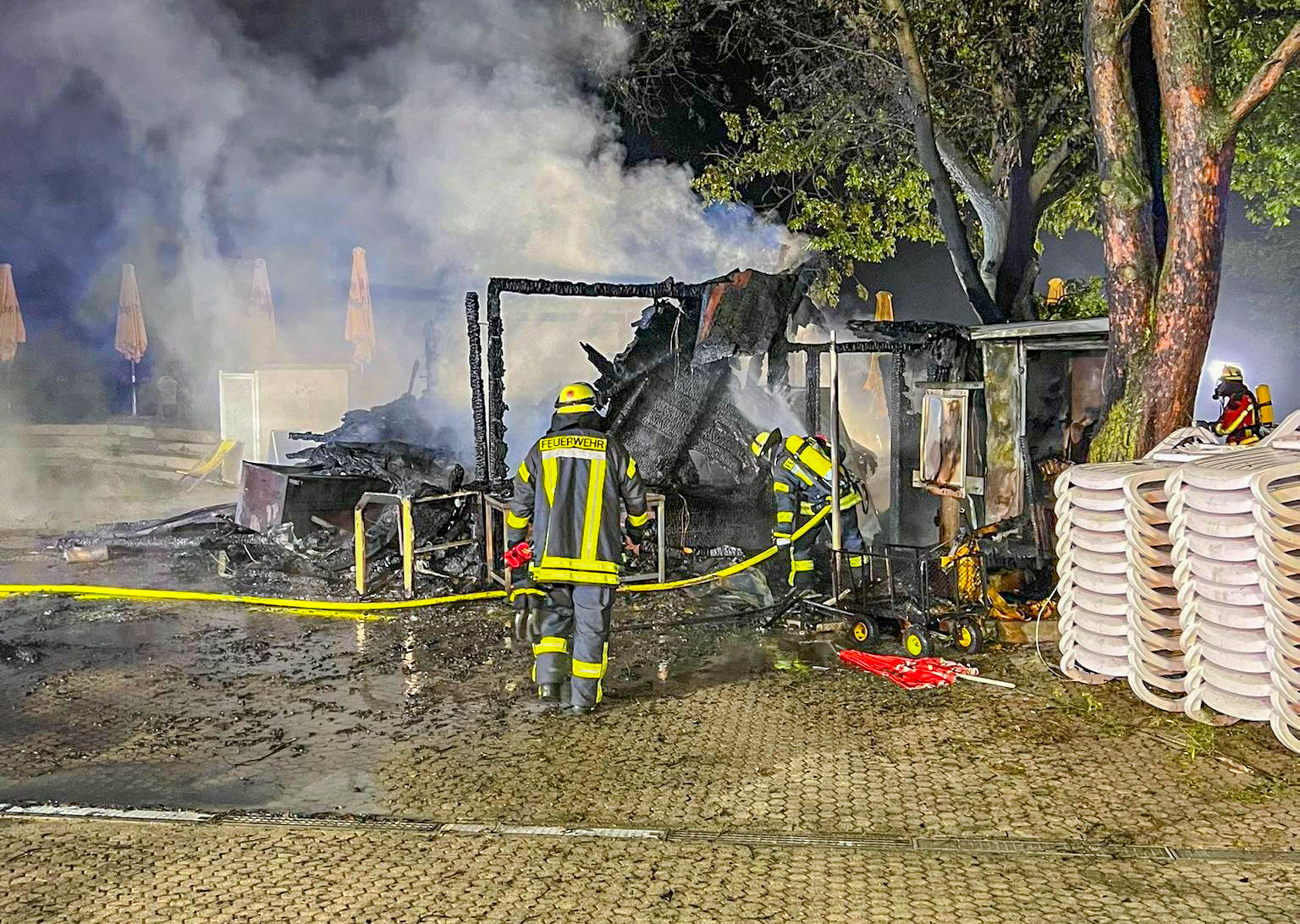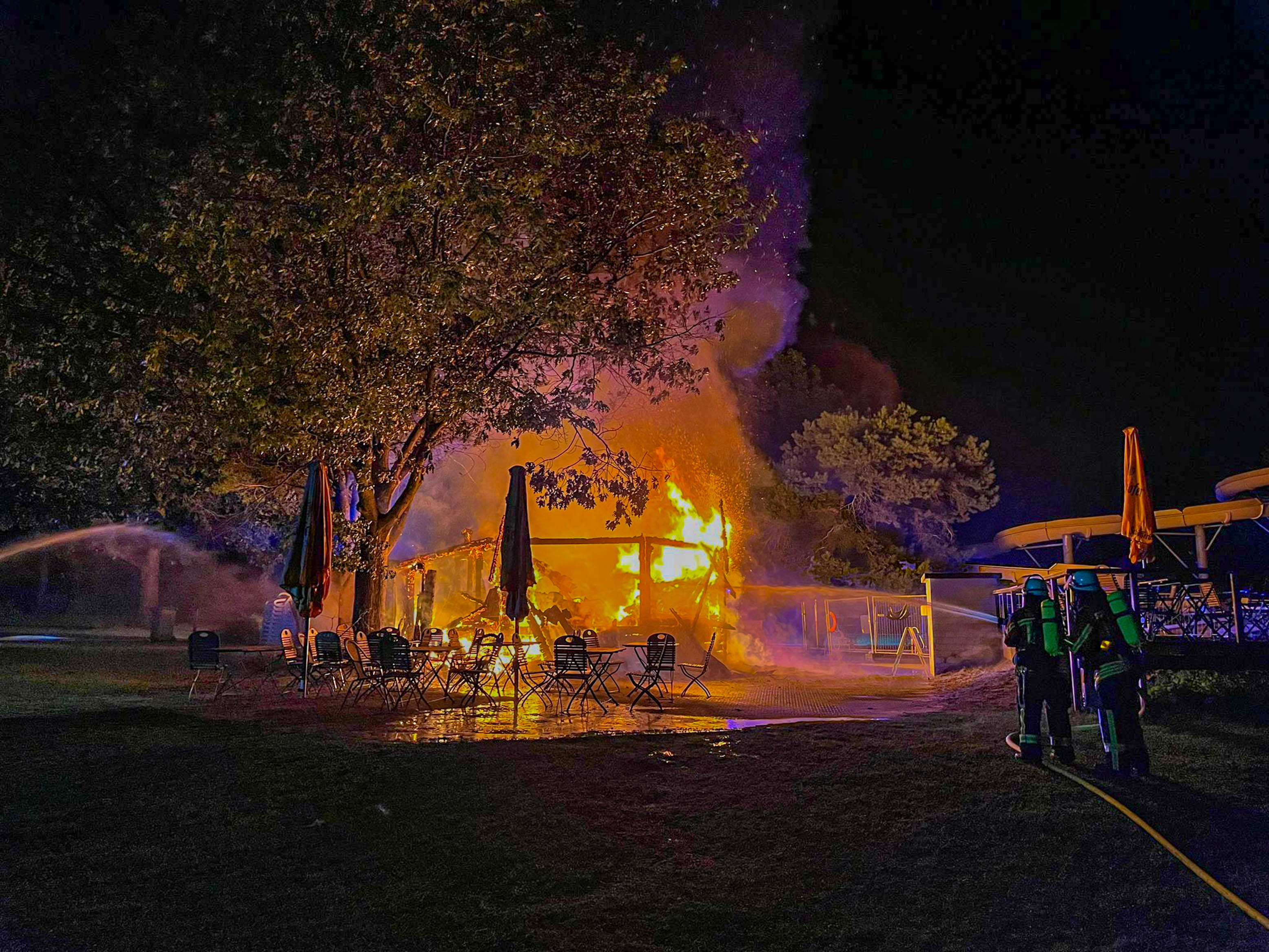Besonders hervorzuheben war eine zeitkritische Einsatzmeldung gegen kurz nach 23.30 Uhr vom Heidesee in Forst. Notrufteilnehmer meldeten einen Feuerschein im Bereich des Badesees. Umgehend wurden die Forster Einsatzkräfte ausgelöst und an den Heidesee entsandt. Schnell wurde klar, dass es sich um einen größeren Brand handelte. Der Kiosk auf dem Heideseegelände stand lichterloh in Vollbrand. Ein dahinterliegender Gastank war akut gefährdet. Das Alarmstichwort wurde erhöht und kurzerhand neben einem Löschfahrzeug der ebenfalls im Ort eingesetzten Feuerwehr KA-Daxlanden, sowie drei weitere Löschfahrzeuge der Feuerwehren aus Weiher, Ubstadt und Stettfeld nachgefordert.