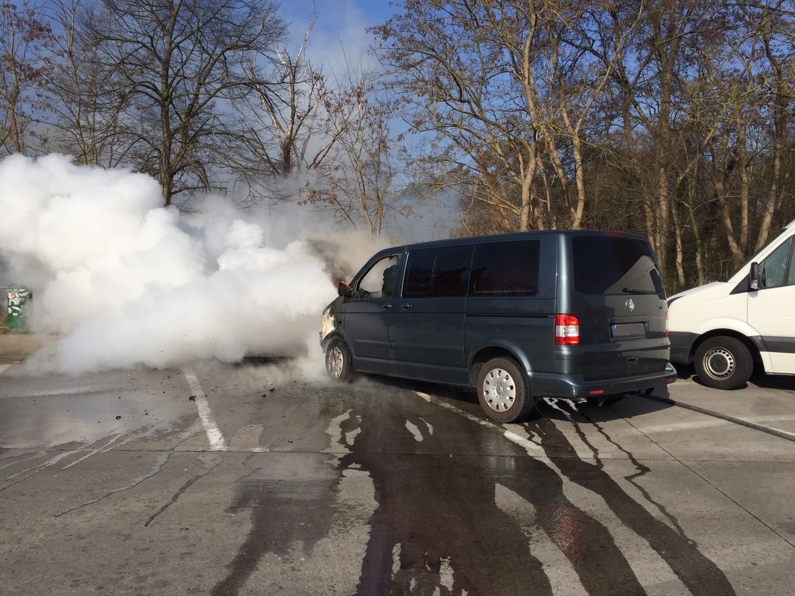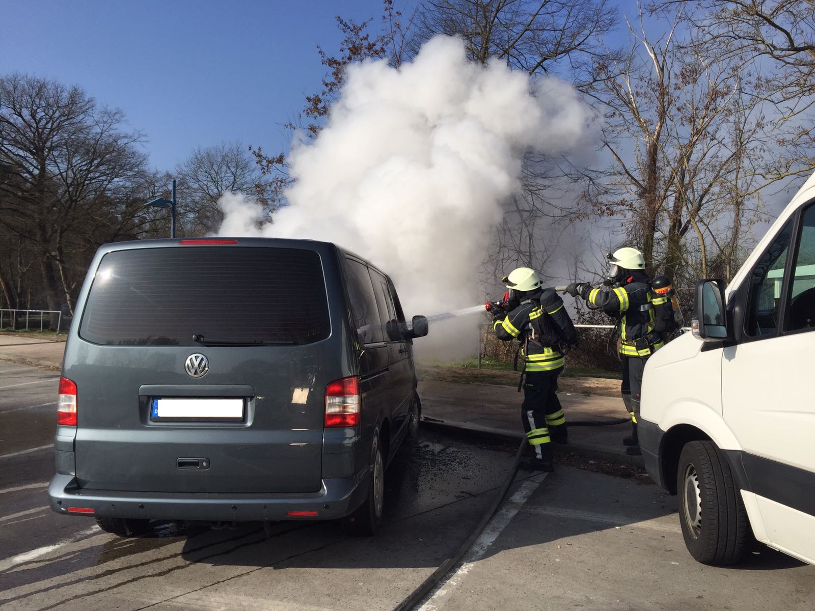Beim Eintreffen der Einsatzkräfte stand der vordere Bereich eines auf dem Parkplatz abgestellten VW-Transporters bereits in Vollbrand. Sofort begann ein Trupp unter Atemschutz mit der Brandbekämpfung und konnte das Feuer schnell unter Kontrolle bringen. Am Transporter entstand jedoch ein Totalschaden. Verletzt wurde glücklicherweise niemand.