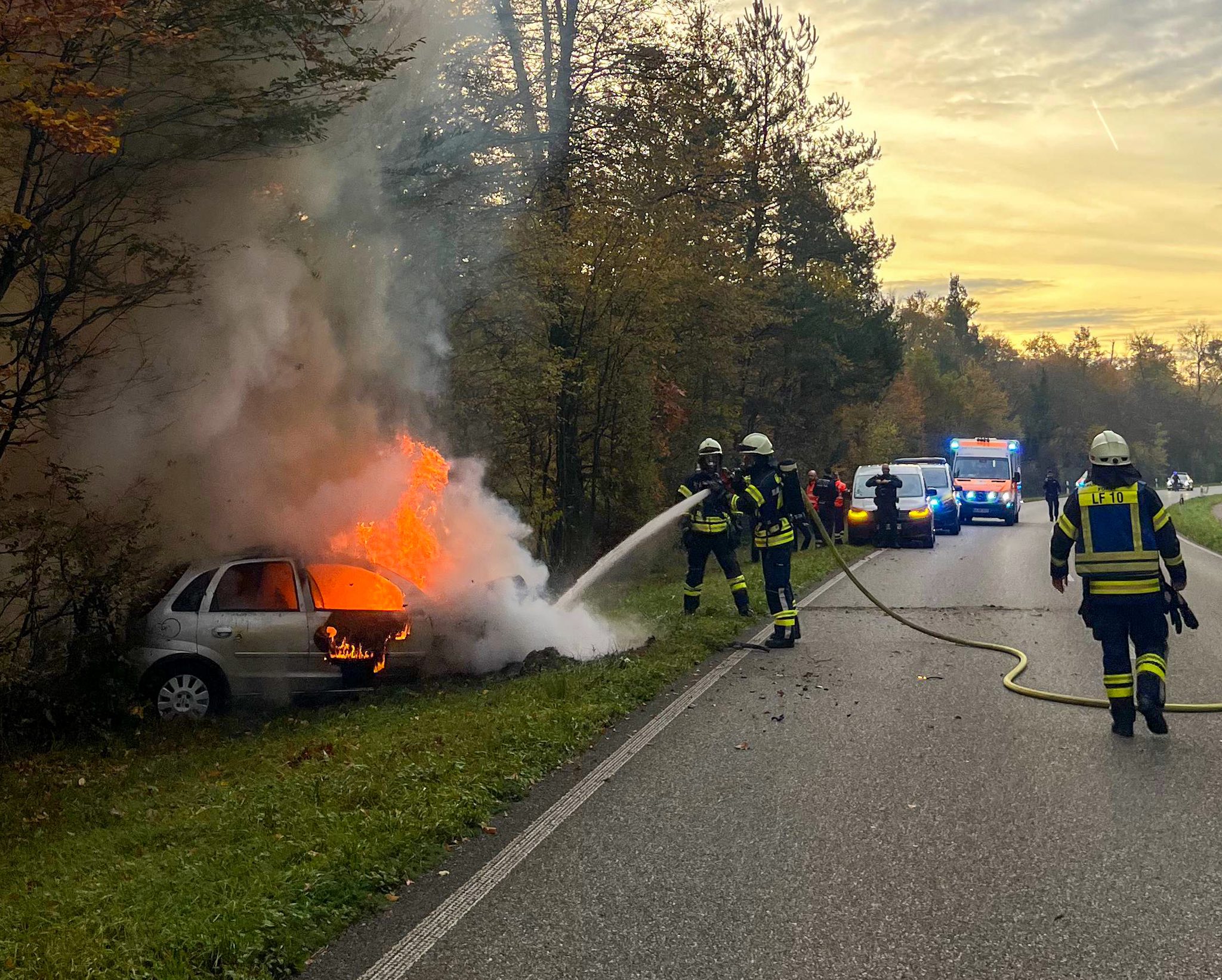 Die Feuerwehr Forst wurde am Morgen des Allerheiligen zu einem Pkw-Brand nach einem Verkehrsunfall auf die L556 zwischen Forst und Hambrücken gerufen.