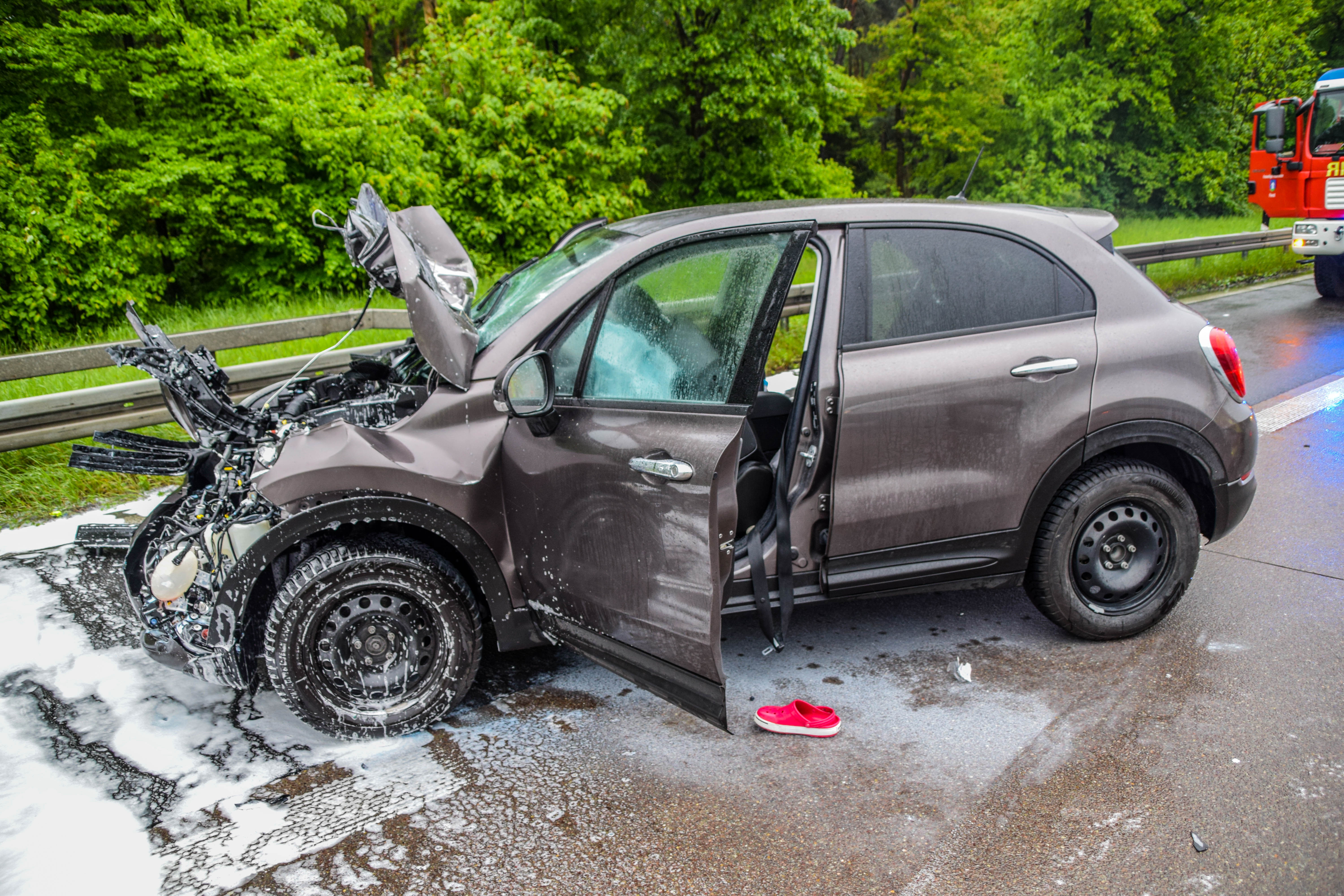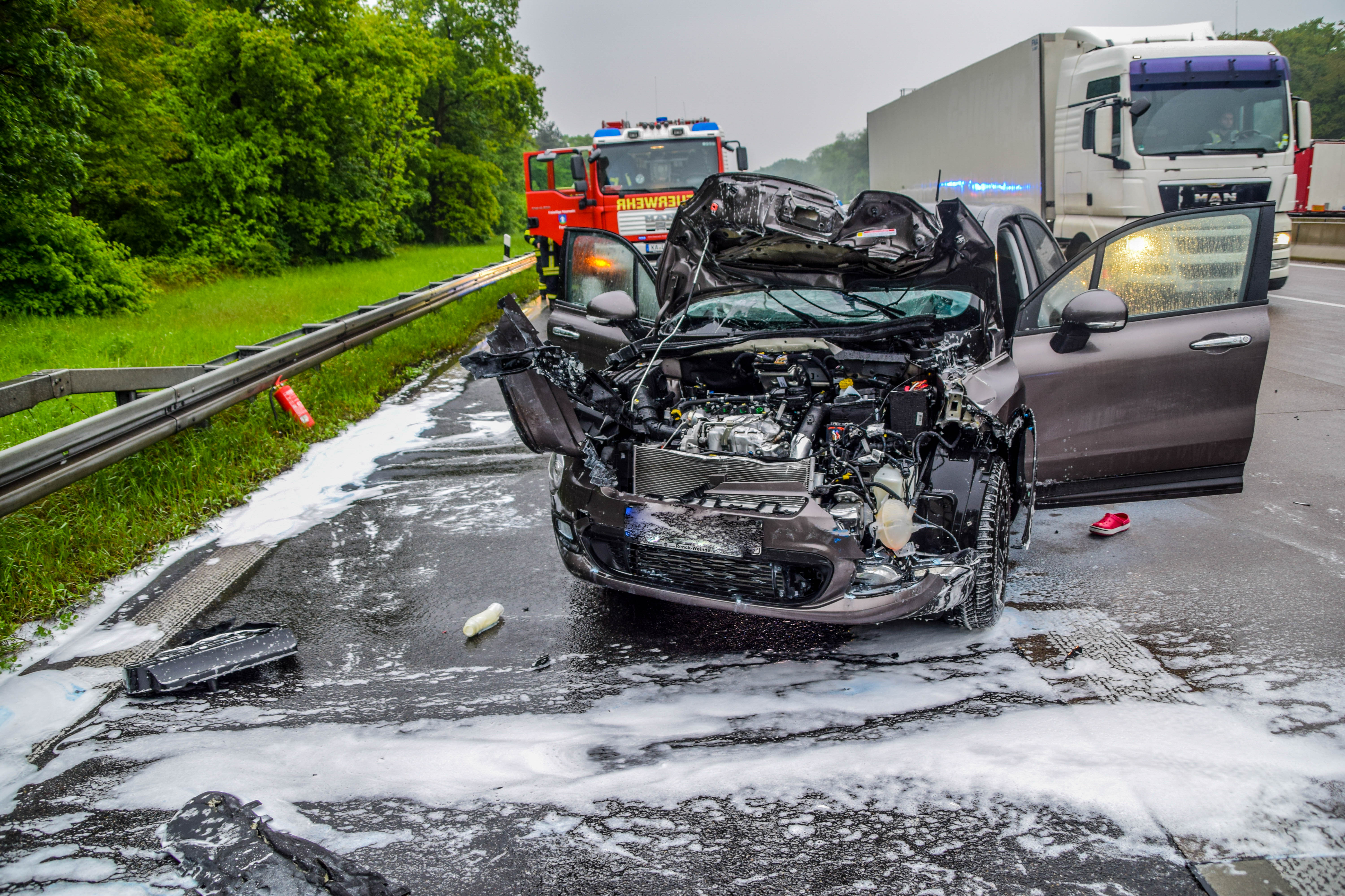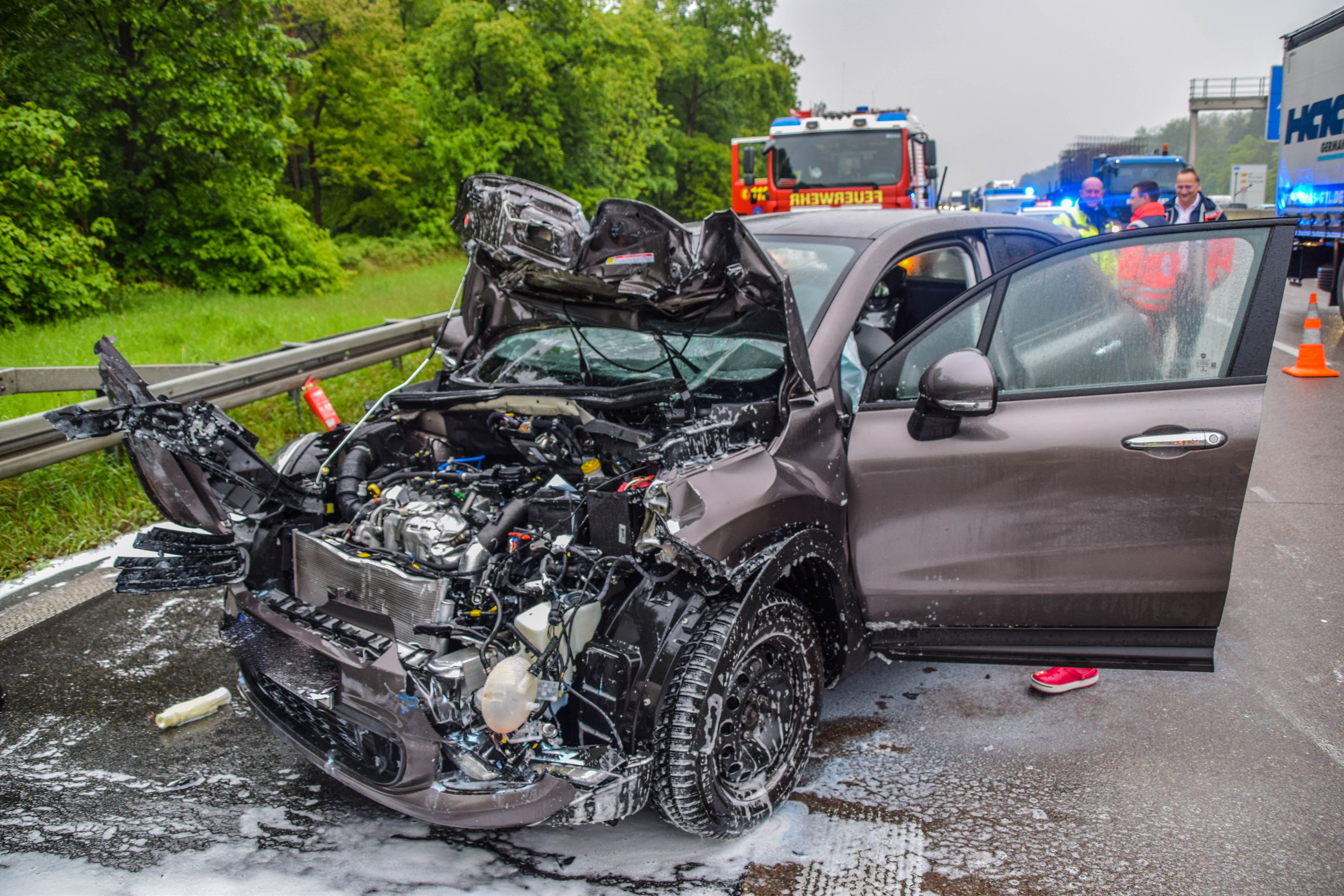 Ein mit drei Personen besetzter PKW fuhr aus bislang ungeklärter Ursache auf einen vorausfahrenden Sattelzug auf. Beim Eintreffen der ersten Einsatzkräfte stellte sich heraus, dass die Fahrerin des PKW in ihrem Fahrzeug eingeschlossen war. Zuvor hatte der PKW im Motorraum Feuer gefangen, welches durch die Polizei mit Feuerlöschern eingedämmt werden konnte. Die Frau wurde von der Feuerwehr aus ihrem Fahrzeug befreit und dem Rettungsdienst übergeben. Im Anschluss wurde das noch stark qualmende Fahrzeug vollständig abgelöscht.
