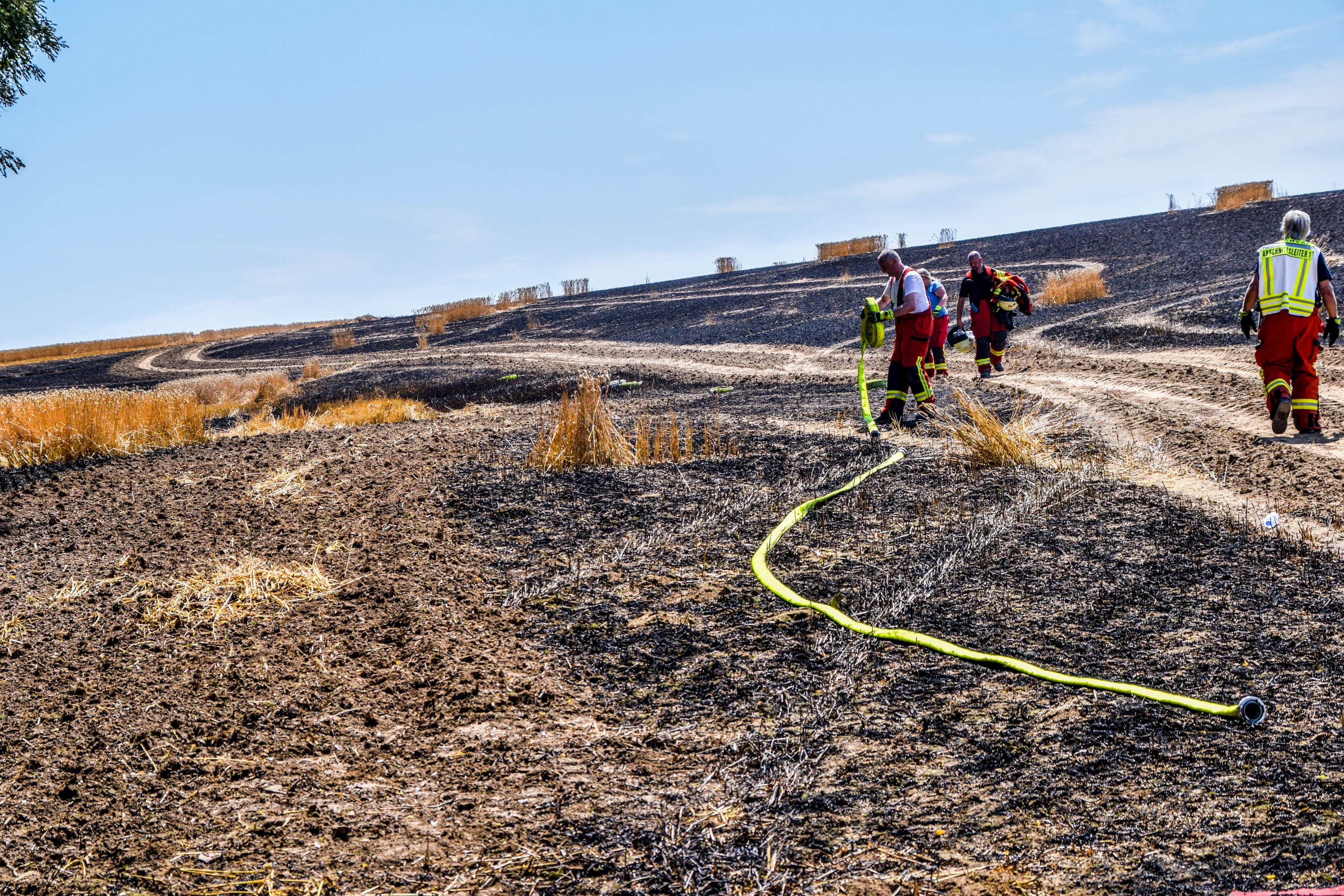 Beim Eintreffen stellte sich den ersten Einsatzkräften ein verheerendes Bild dar. Etwa 12 Hektar eines dortigen Weizenfeldes standen in Flammen. Das beschreibt eine Größe von etwa 16 Fußballfeldern. Aufgrund der enormen Trockenheit, breitete sich das Feuer rasend schnell aus. Die Flammen drohten auf ein direkt angrenzendes Gebäude des Hofes und an mehreren Stellen auf Bäume und Waldflächen überzugreifen.