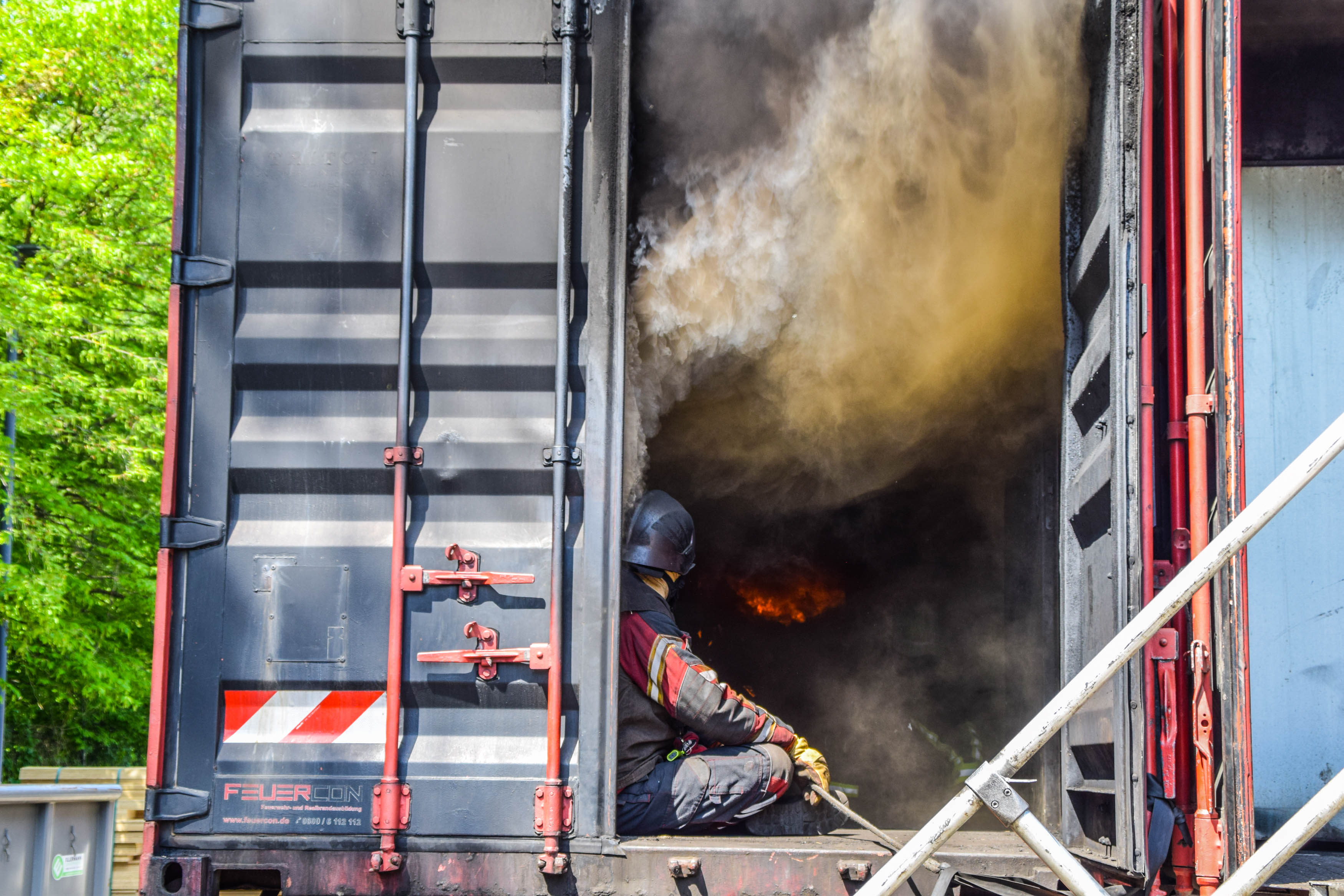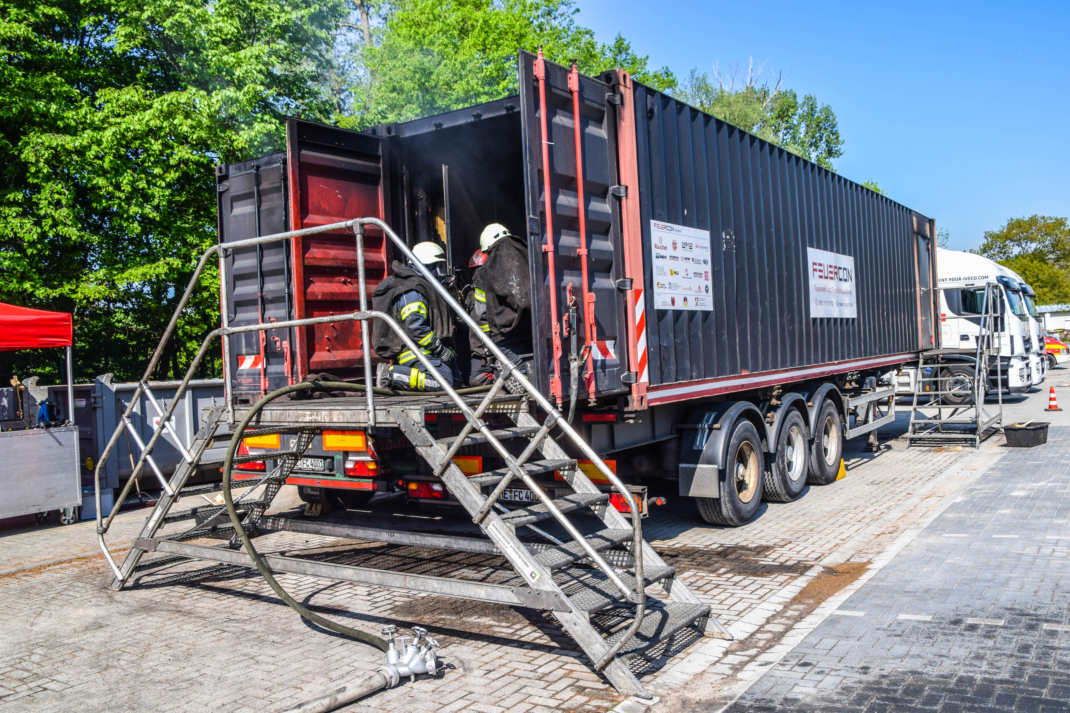 Die mobile Realbrand-Ausbildungsanlage von Feuercon wurde in Zusammenarbeit mit diversen Feuerwehrschulen, Feuerwehrverbänden, Unfallkassen und Arbeitskreisen konzipiert. Durch die Kombination von zwei unterschiedlich ausgebauten 40 Fuß Containern wird eine Übungsfläche von 60 m² erreicht.