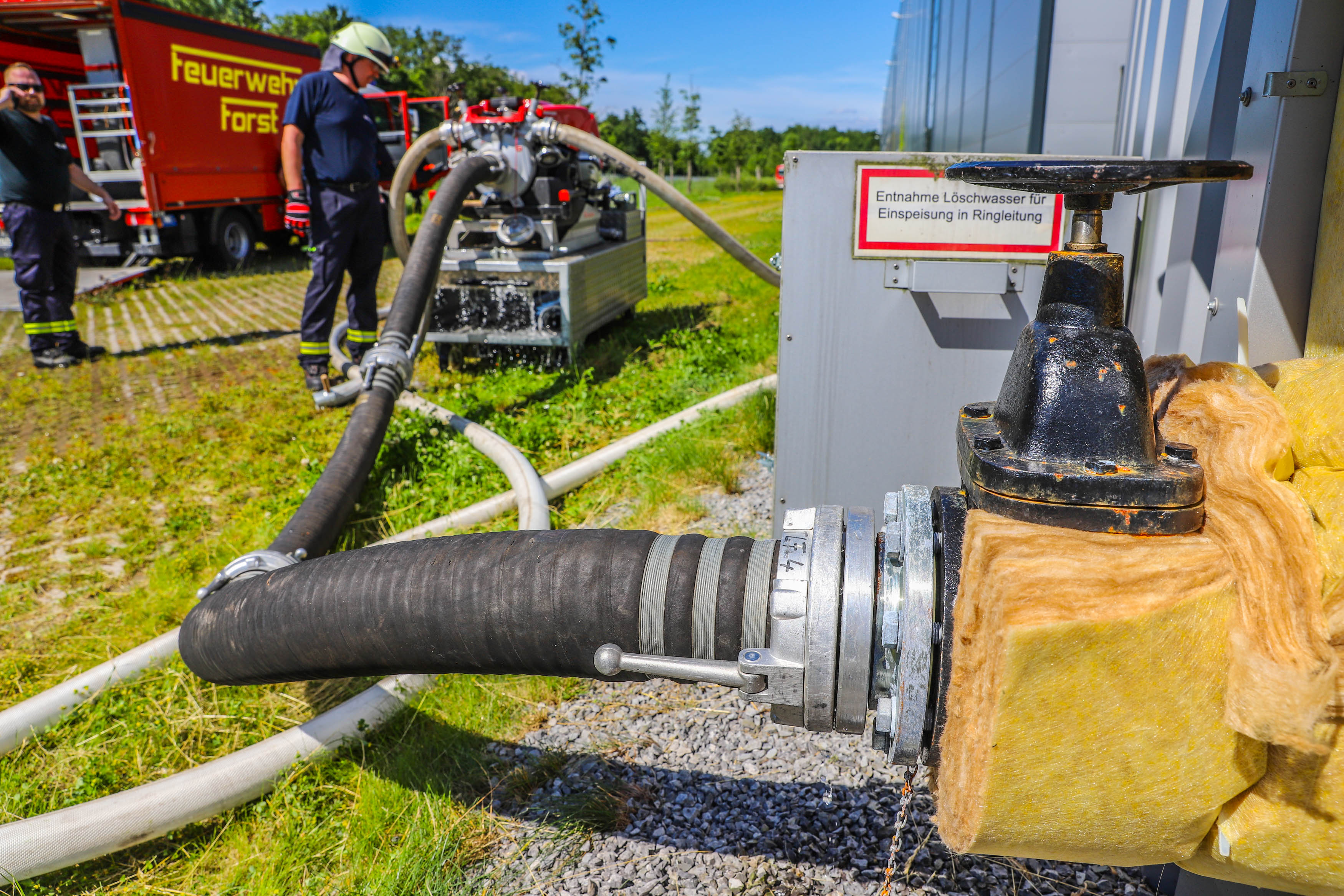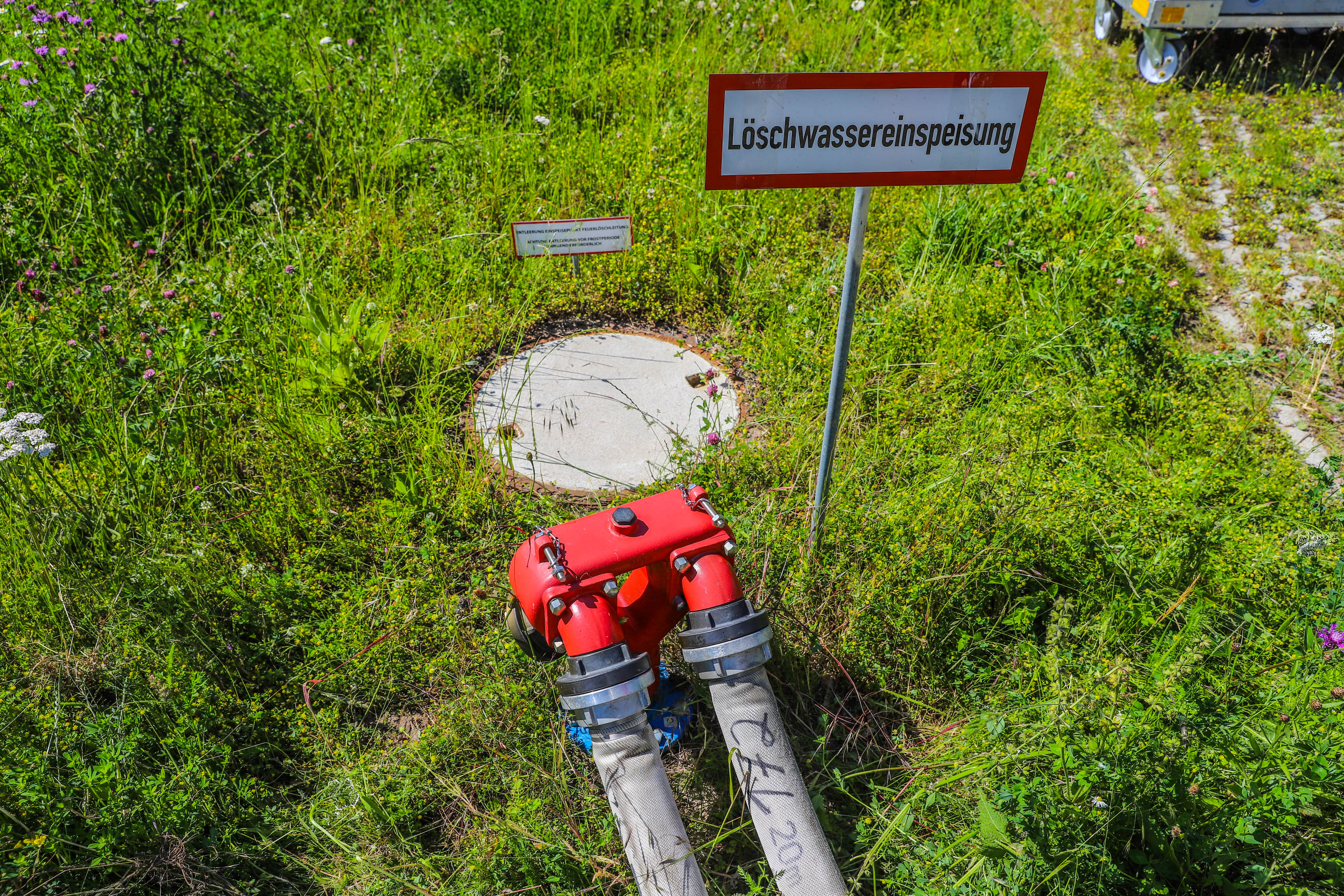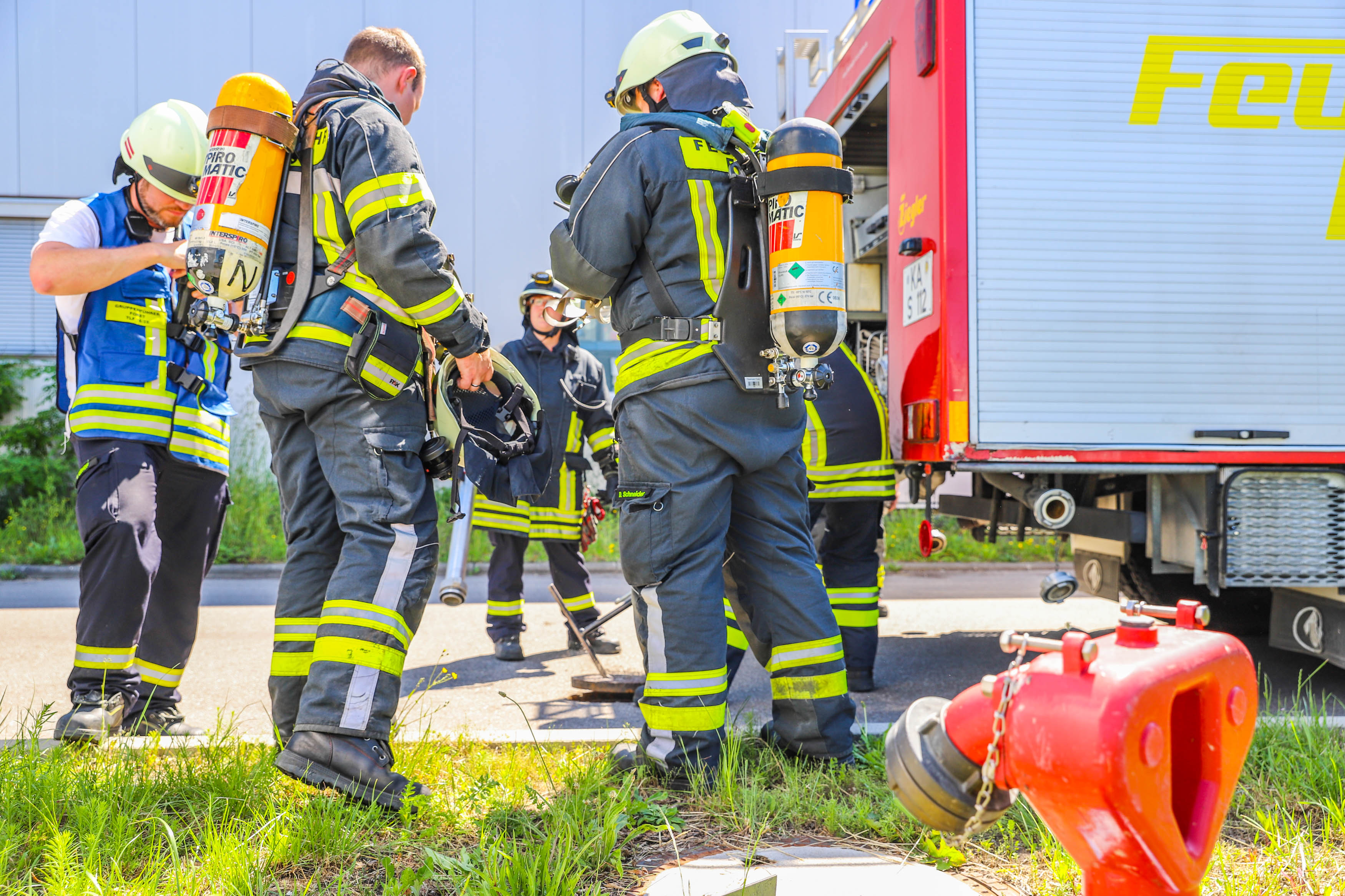 Während ein Trupp unter Atemschutz in das Hochregallager zur Menschenrettung vorging, wurde das Hydrantennetz auf dem Firmengelände über den örtlichen Löschwassertank eingespeist.
