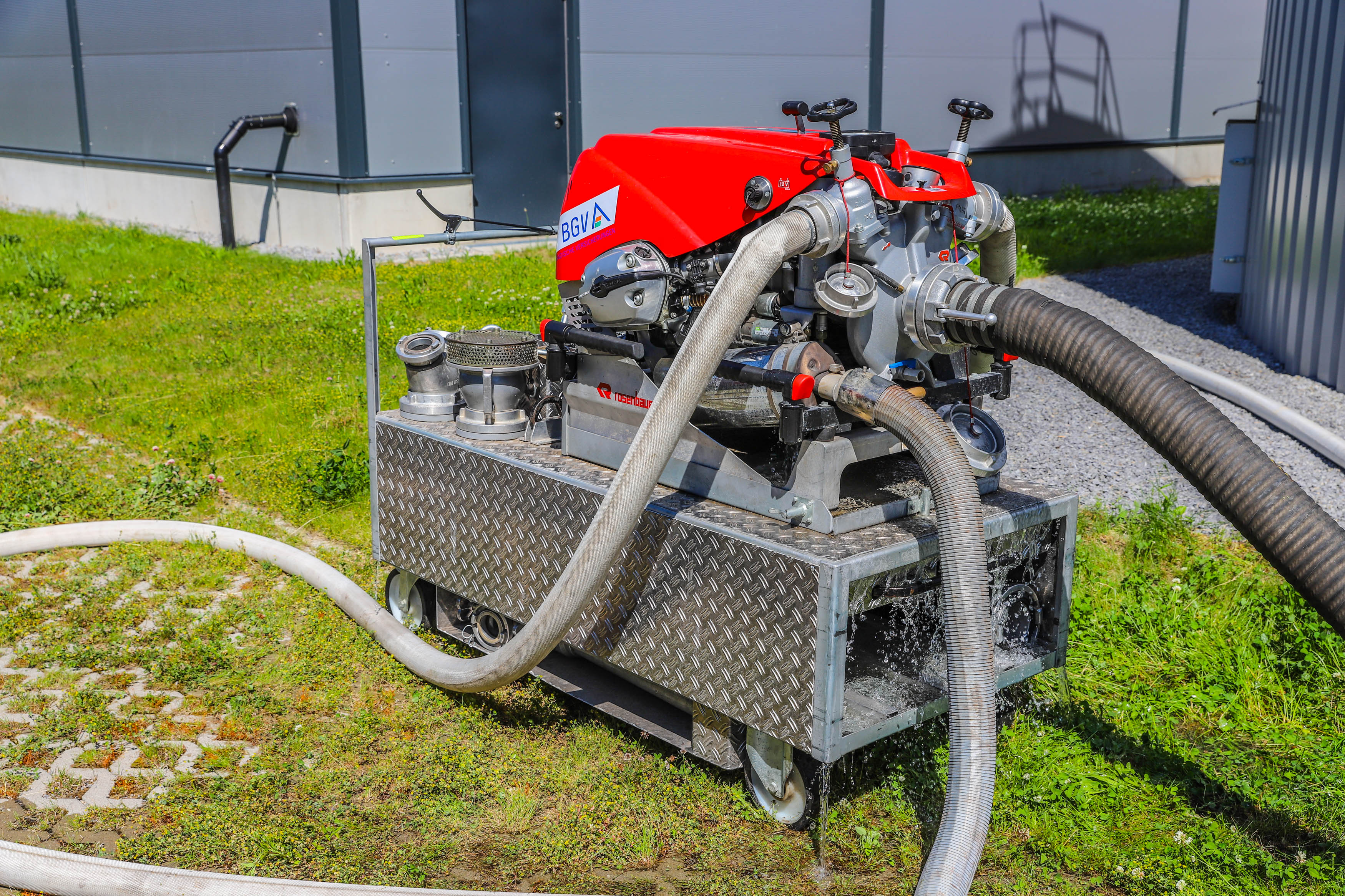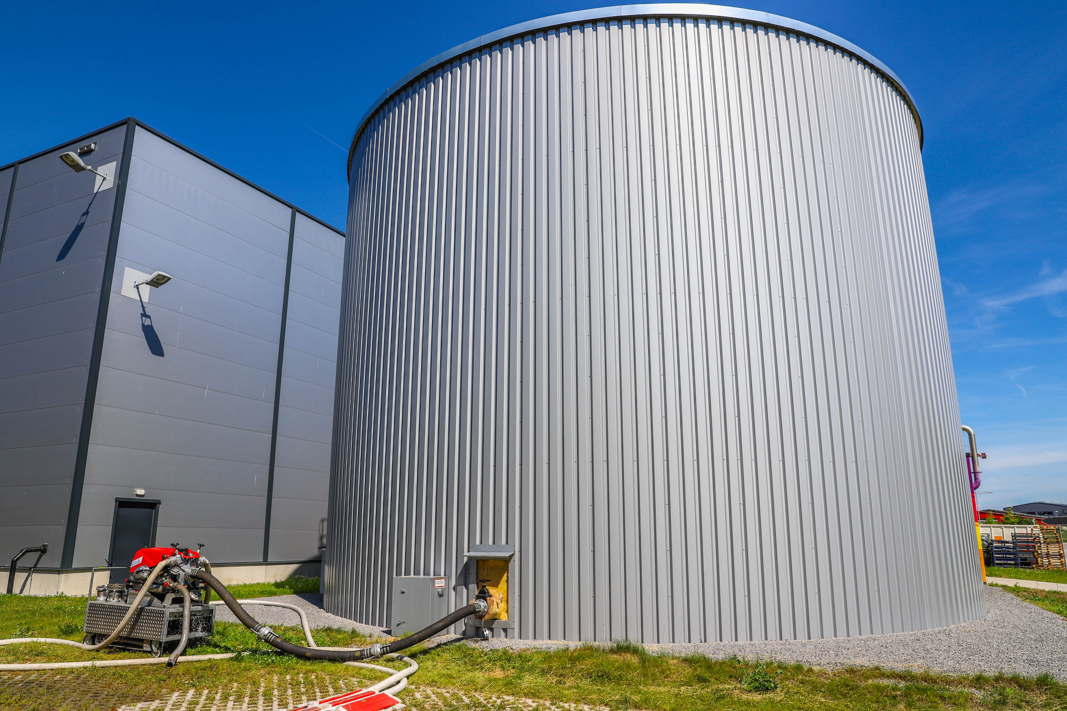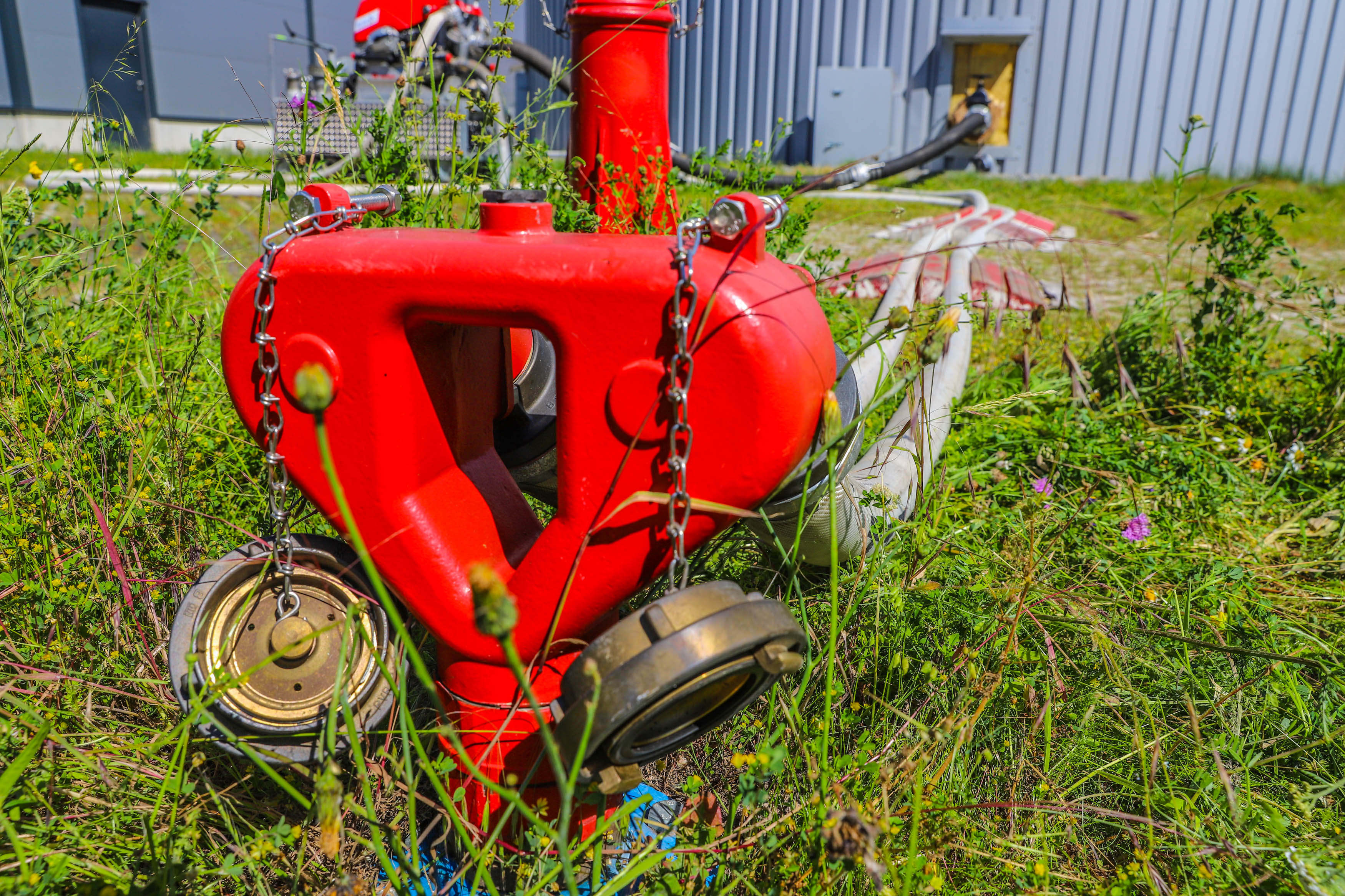 Während ein Trupp unter Atemschutz in das Hochregallager zur Menschenrettung vorging, wurde das Hydrantennetz auf dem Firmengelände über den örtlichen Löschwassertank eingespeist.