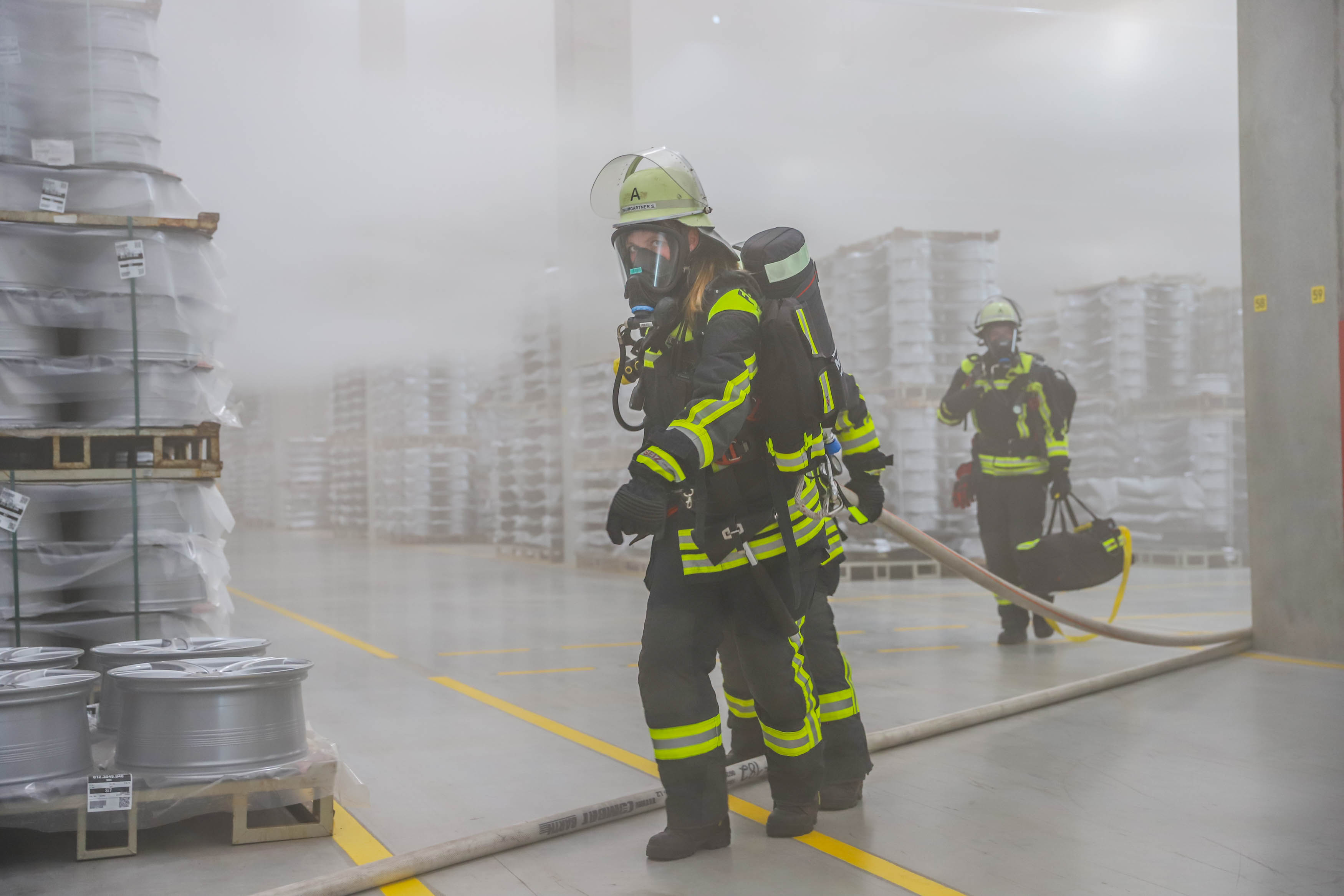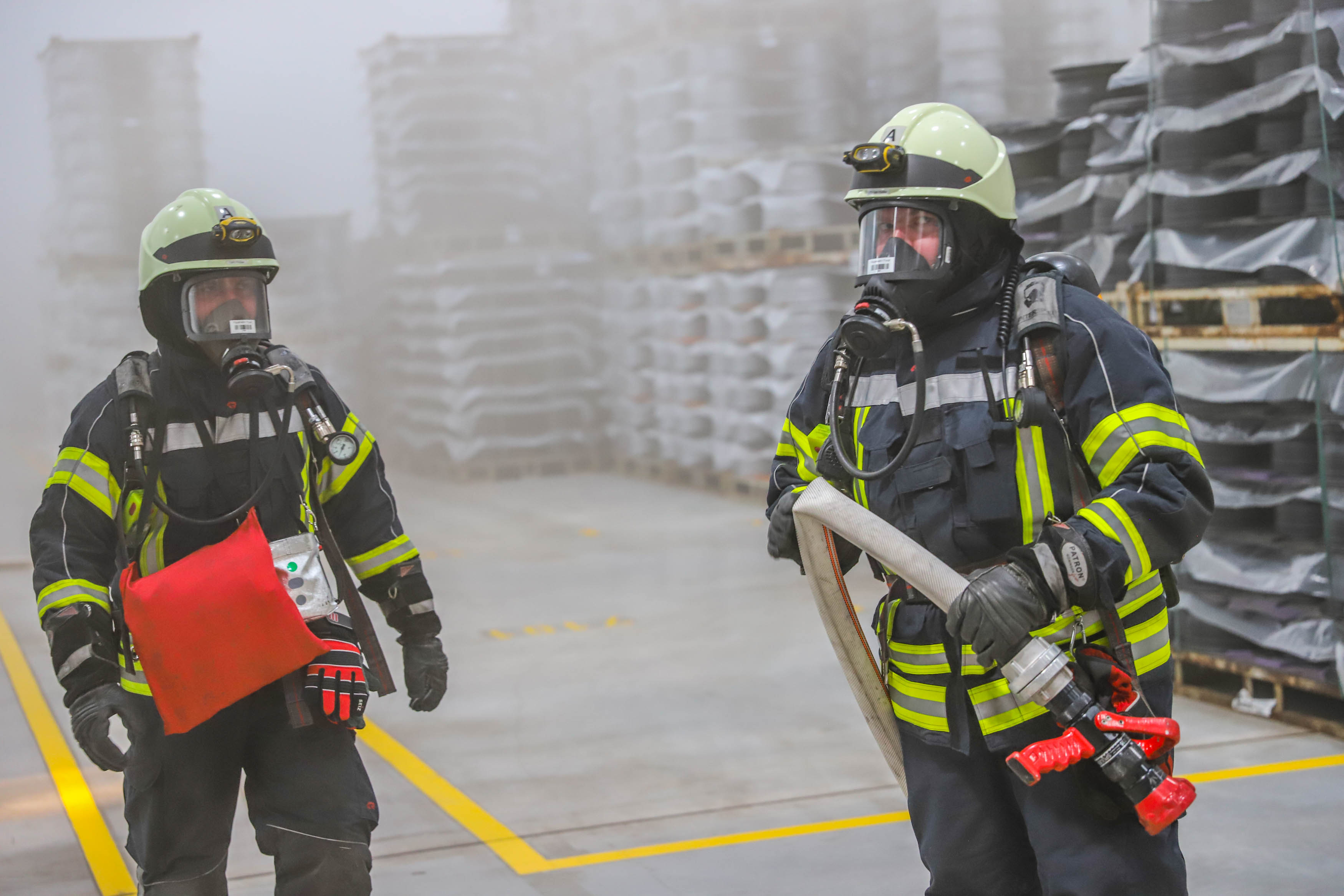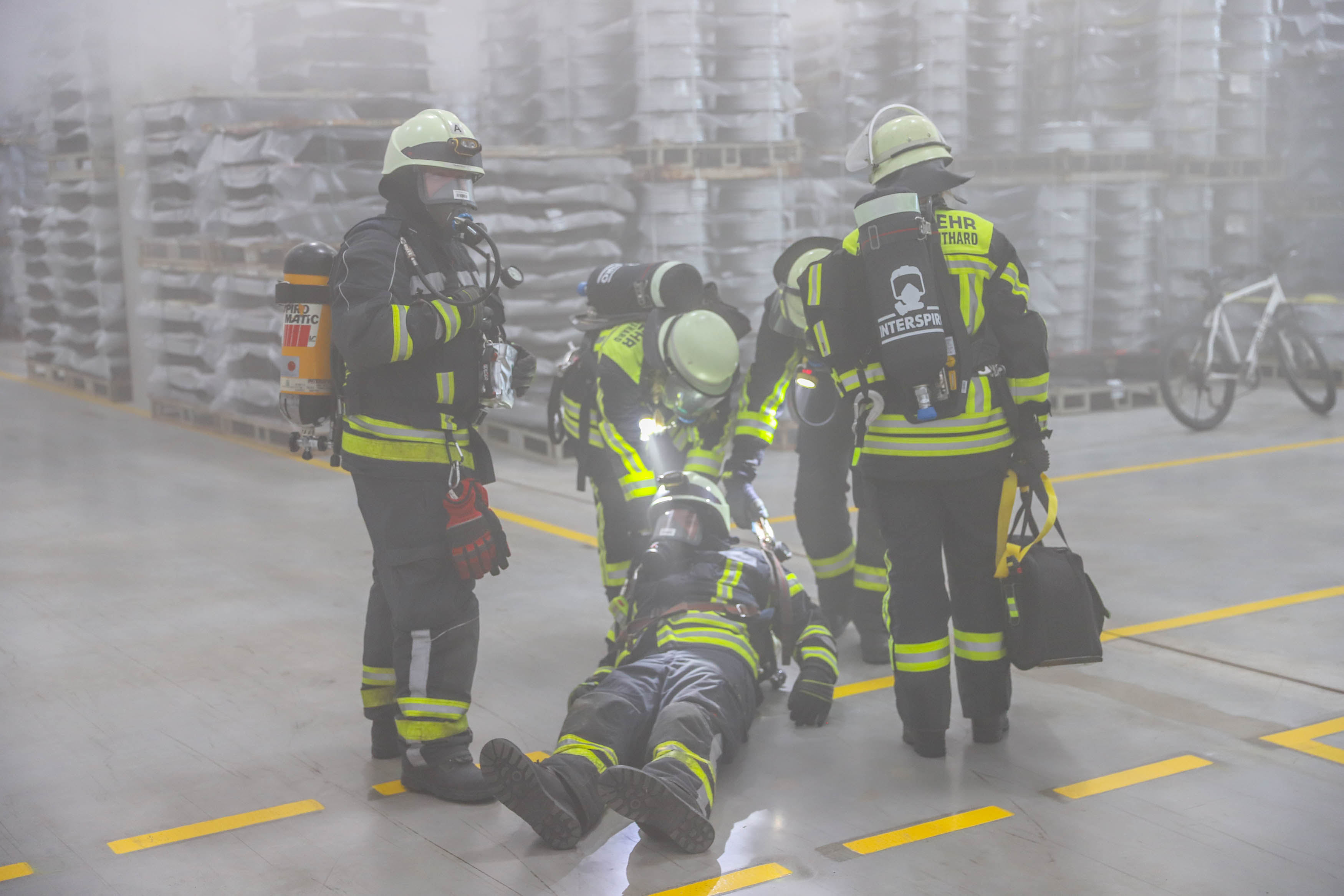 Unterdessen konnte der vermisste Staplerfahrer durch den Atemschutztrupp ins Freie gerettet werden, sodass der Trupp erneut in das Gebäude zur Brandbekämpfung vorgehen konnte. Während der Brandbekämpfungsmaßnahmen wurde ein Atemschutznotfall angenommen. Ein Feuerwehrmann brach unter Atemschutz zusammen und lag im unmittelbaren Gefahrenbereich.
