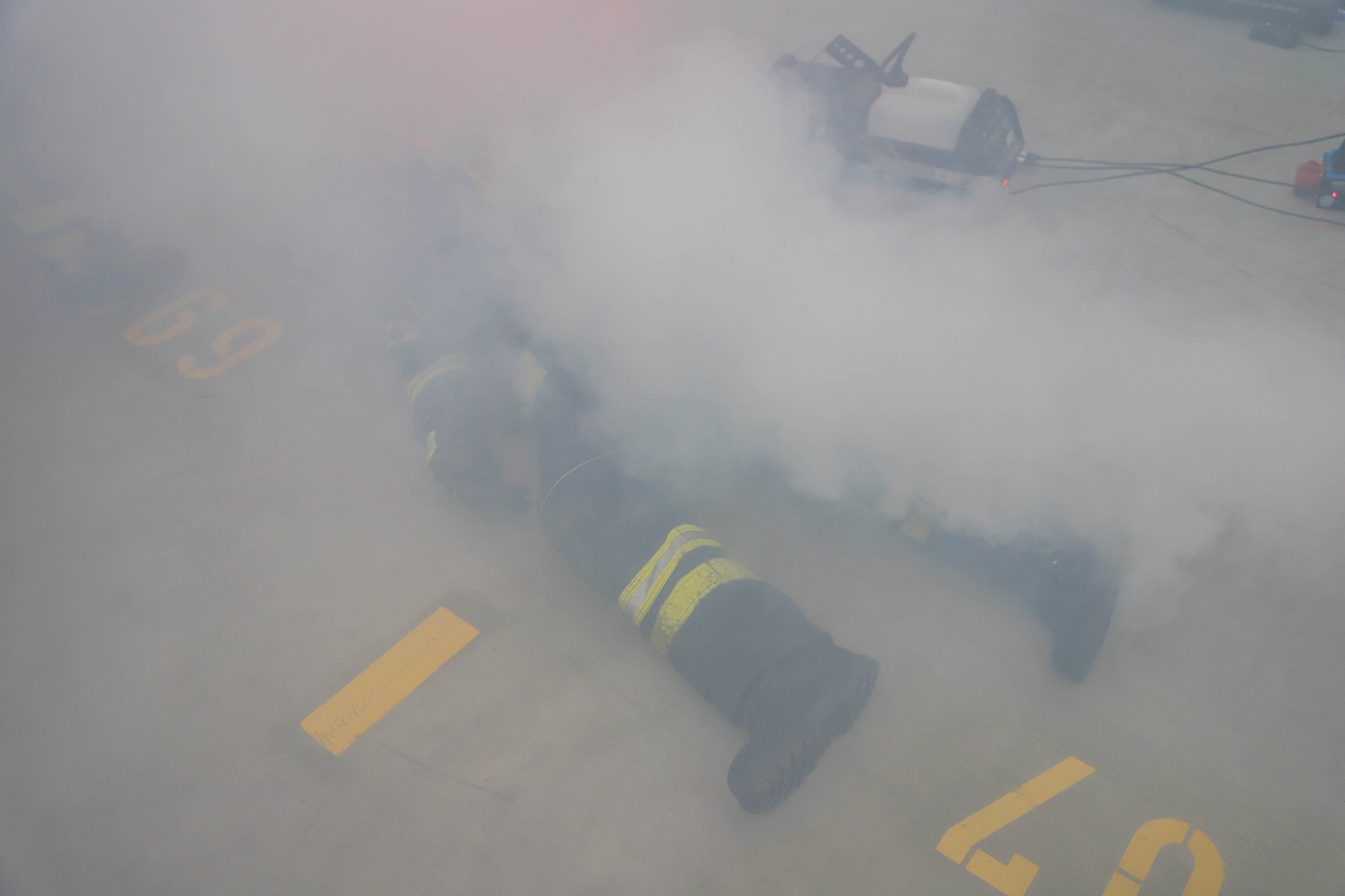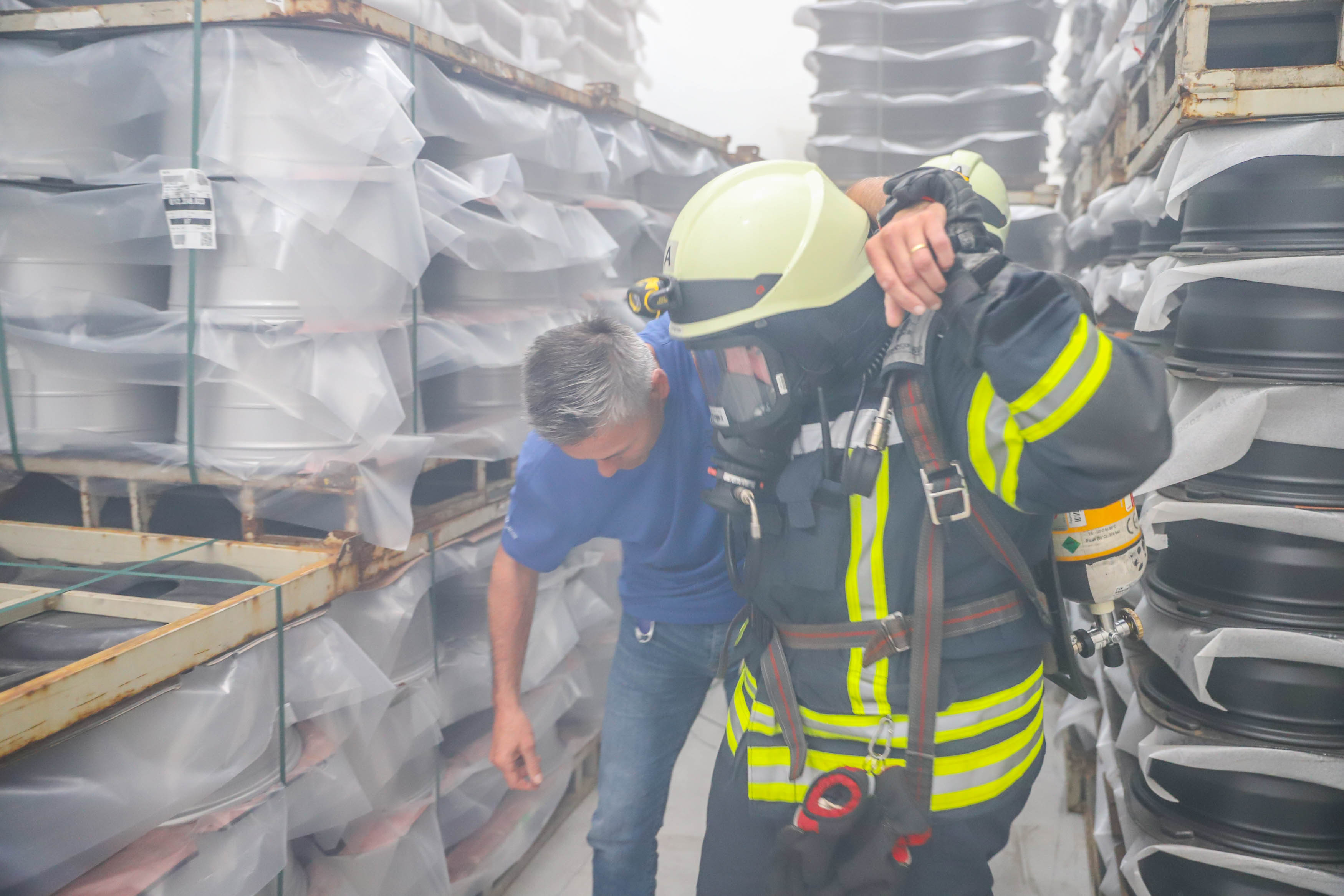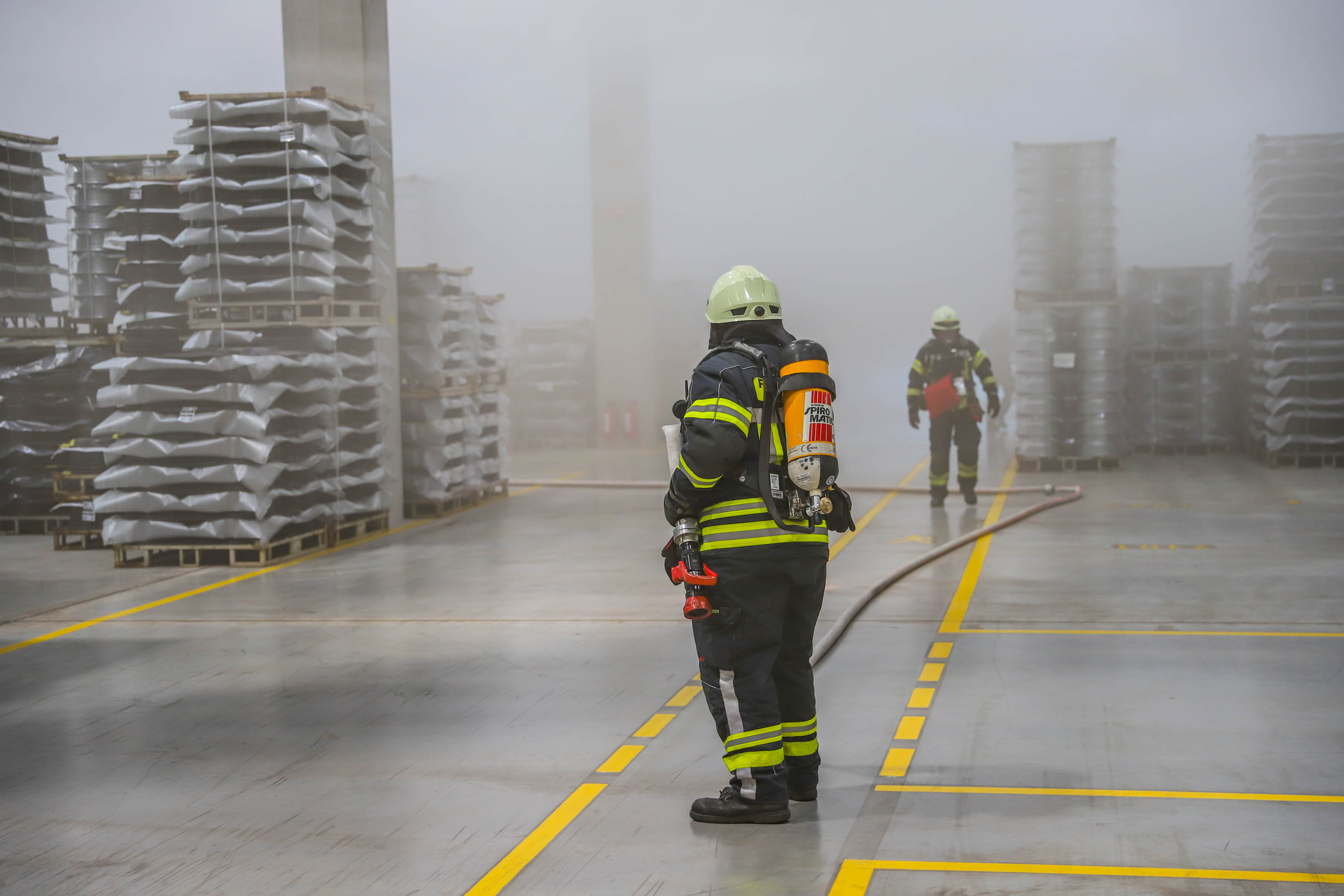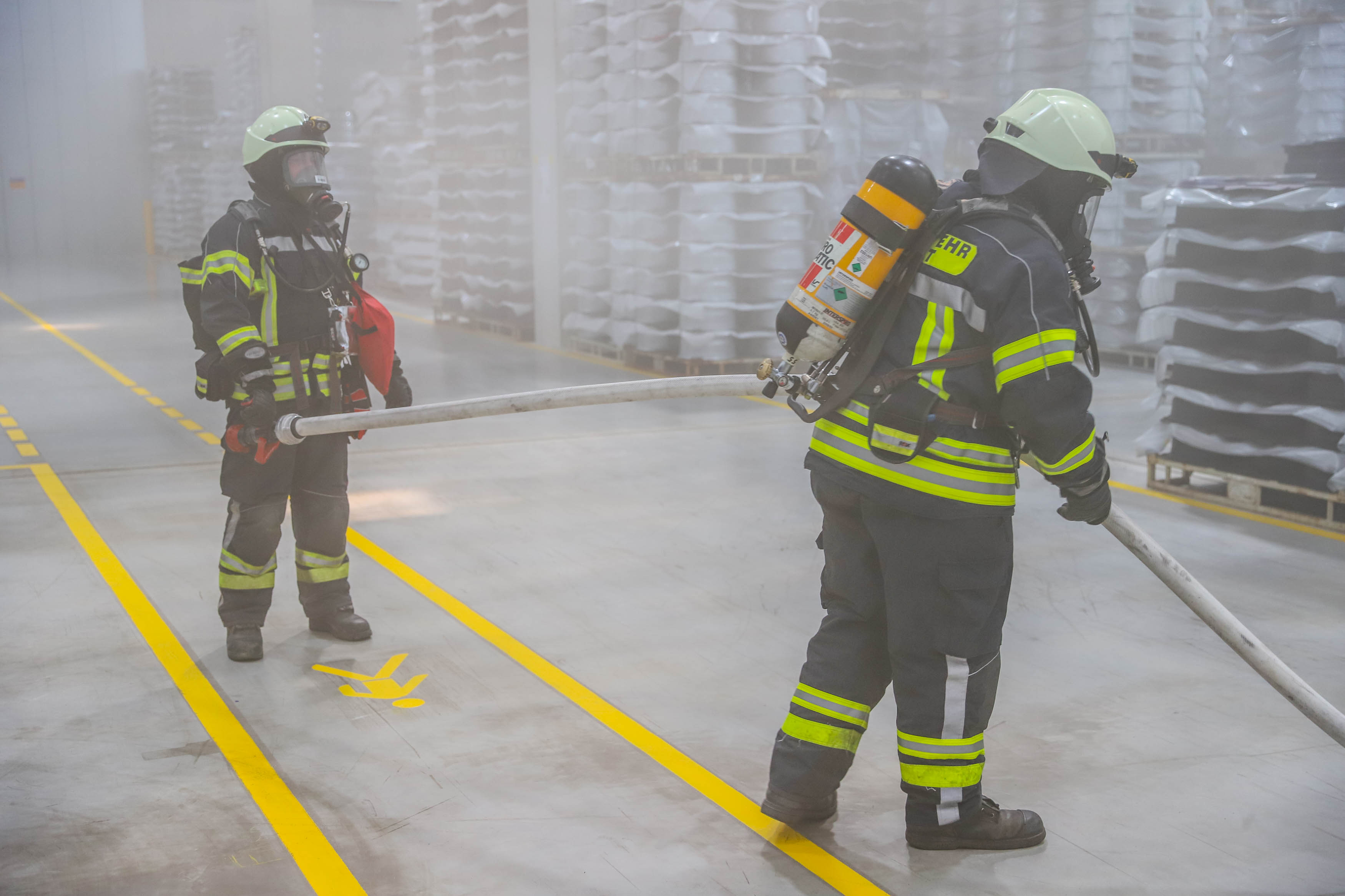 Unterdessen konnte der vermisste Staplerfahrer durch den Atemschutztrupp ins Freie gerettet werden, sodass der Trupp erneut in das Gebäude zur Brandbekämpfung vorgehen konnte. Während der Brandbekämpfungsmaßnahmen wurde ein Atemschutznotfall angenommen. Ein Feuerwehrmann brach unter Atemschutz zusammen und lag im unmittelbaren Gefahrenbereich.