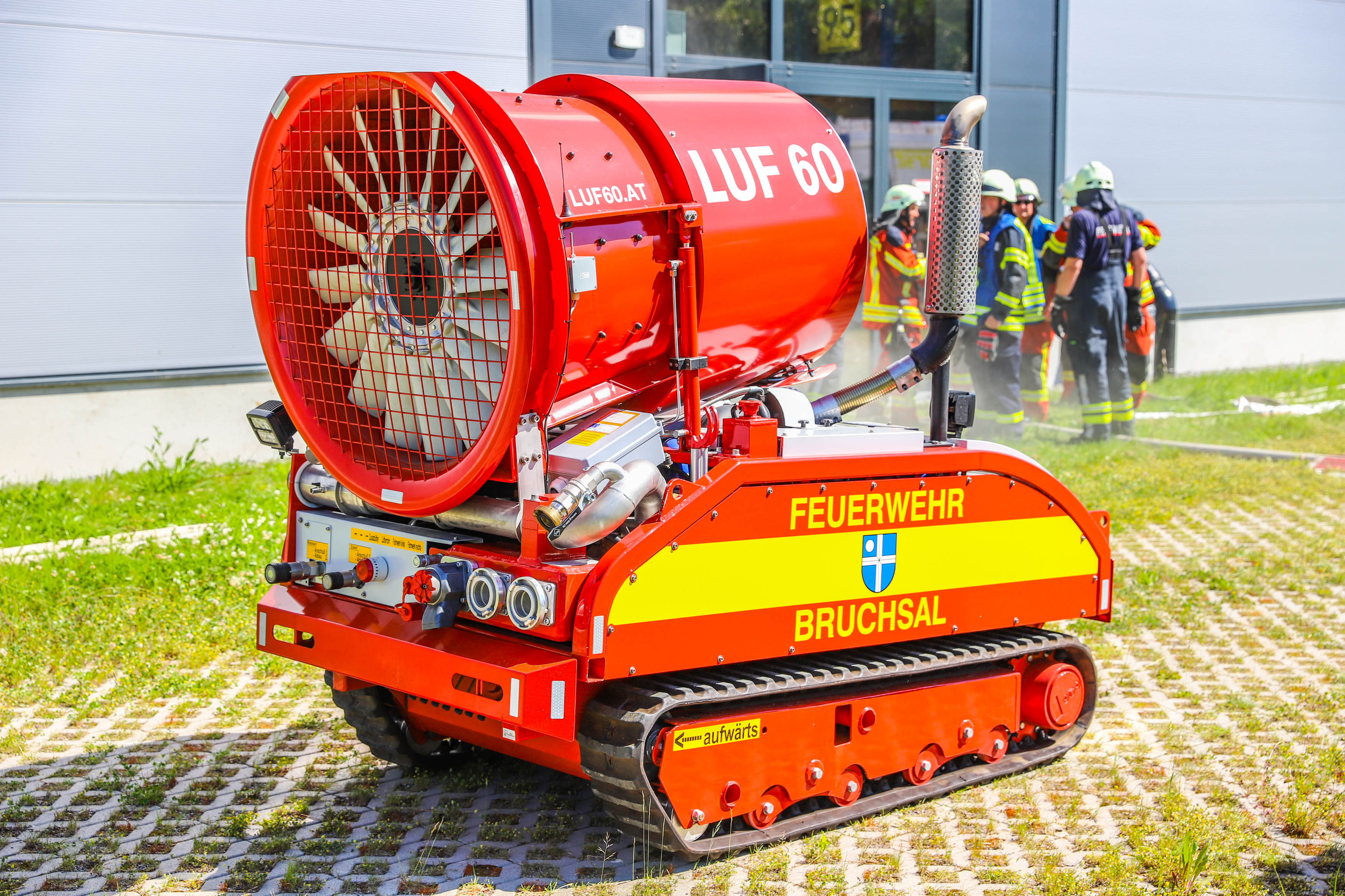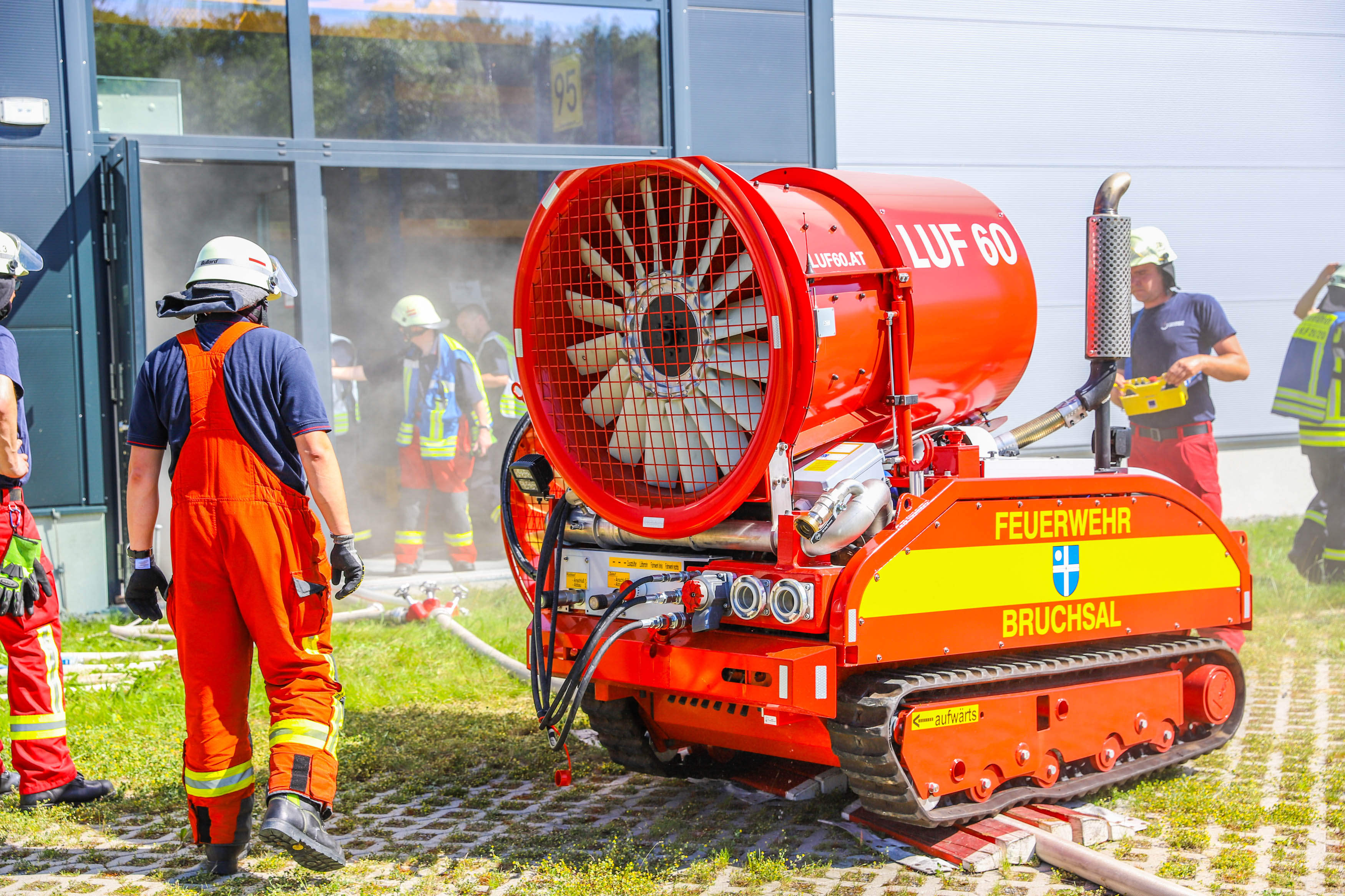 Zur Brandbekämpfung von außen kam neben dem Wenderohr der Drehleiter, auch das LUF 60 der Feuerwehr Bruchsal zum Einsatz. Das LUF 60 ist ein sogenanntes Löschunterstützungsfahrzeug. Neben der Brandbekämpfung wurde mit dessen eingebautem Lüfter die Lagerhalle vom Rauch befreit und belüftet.