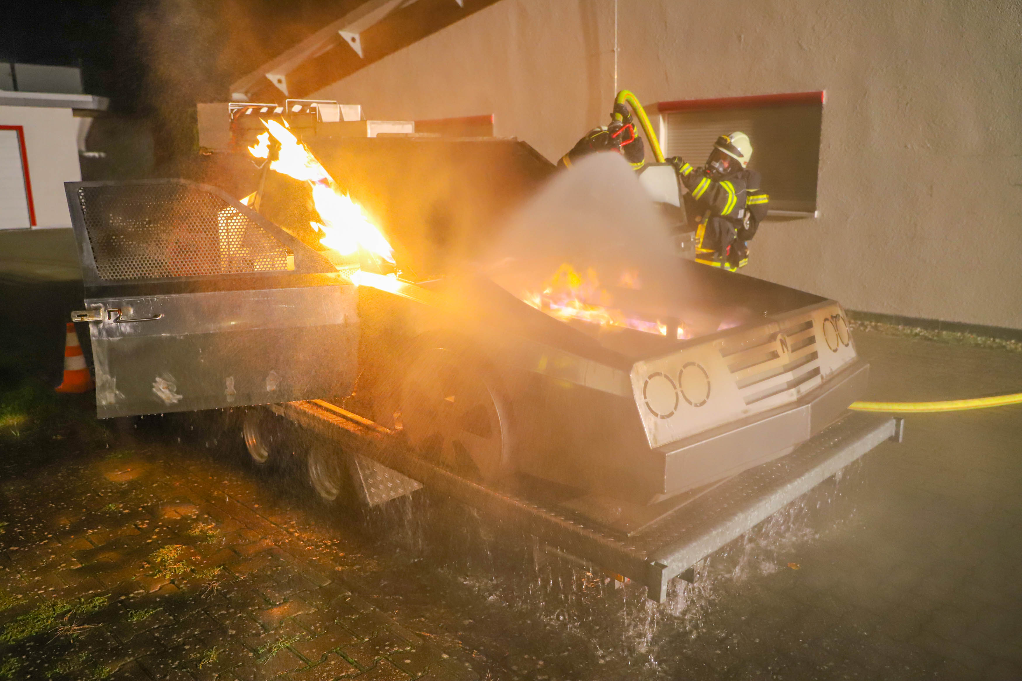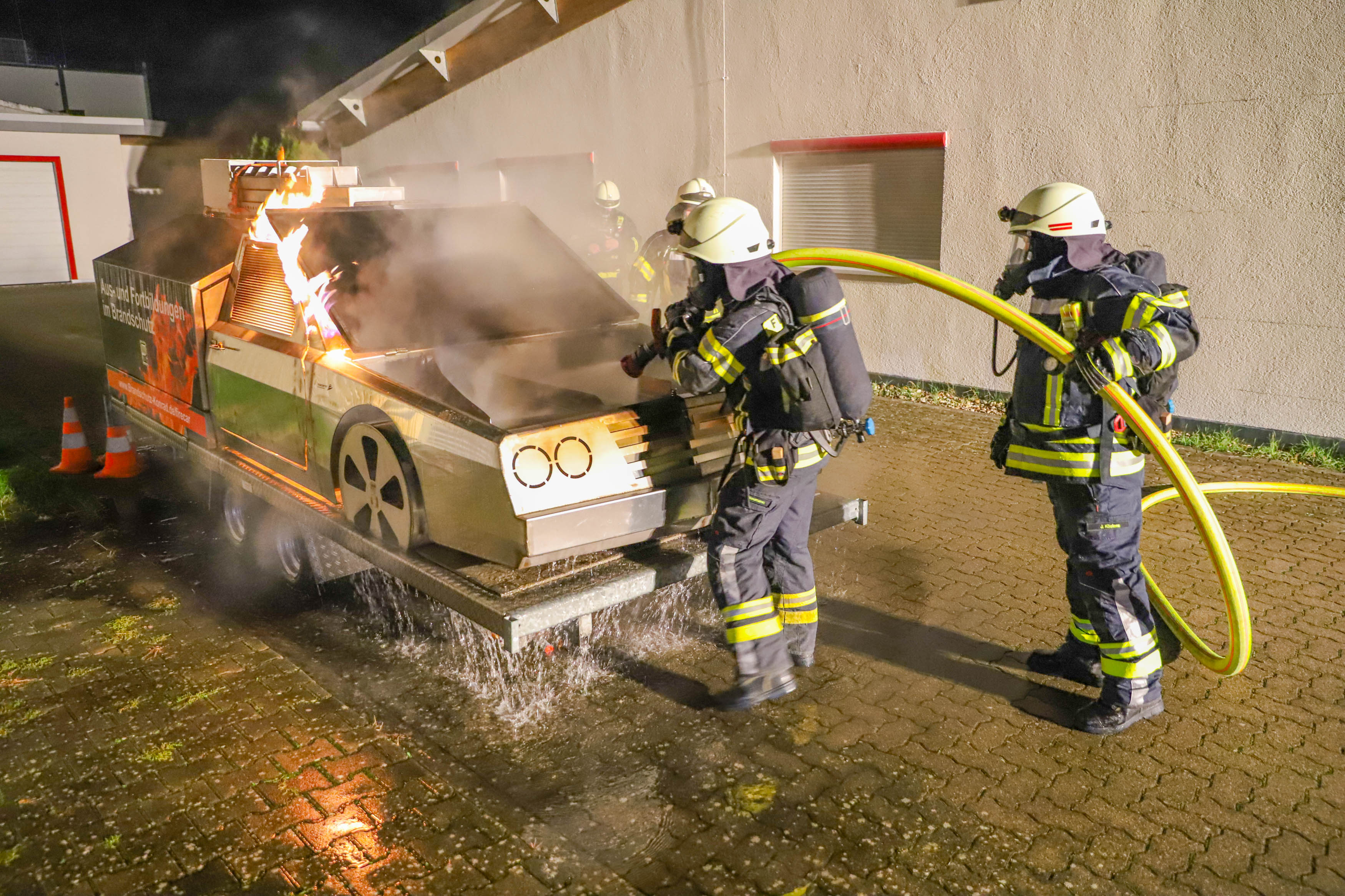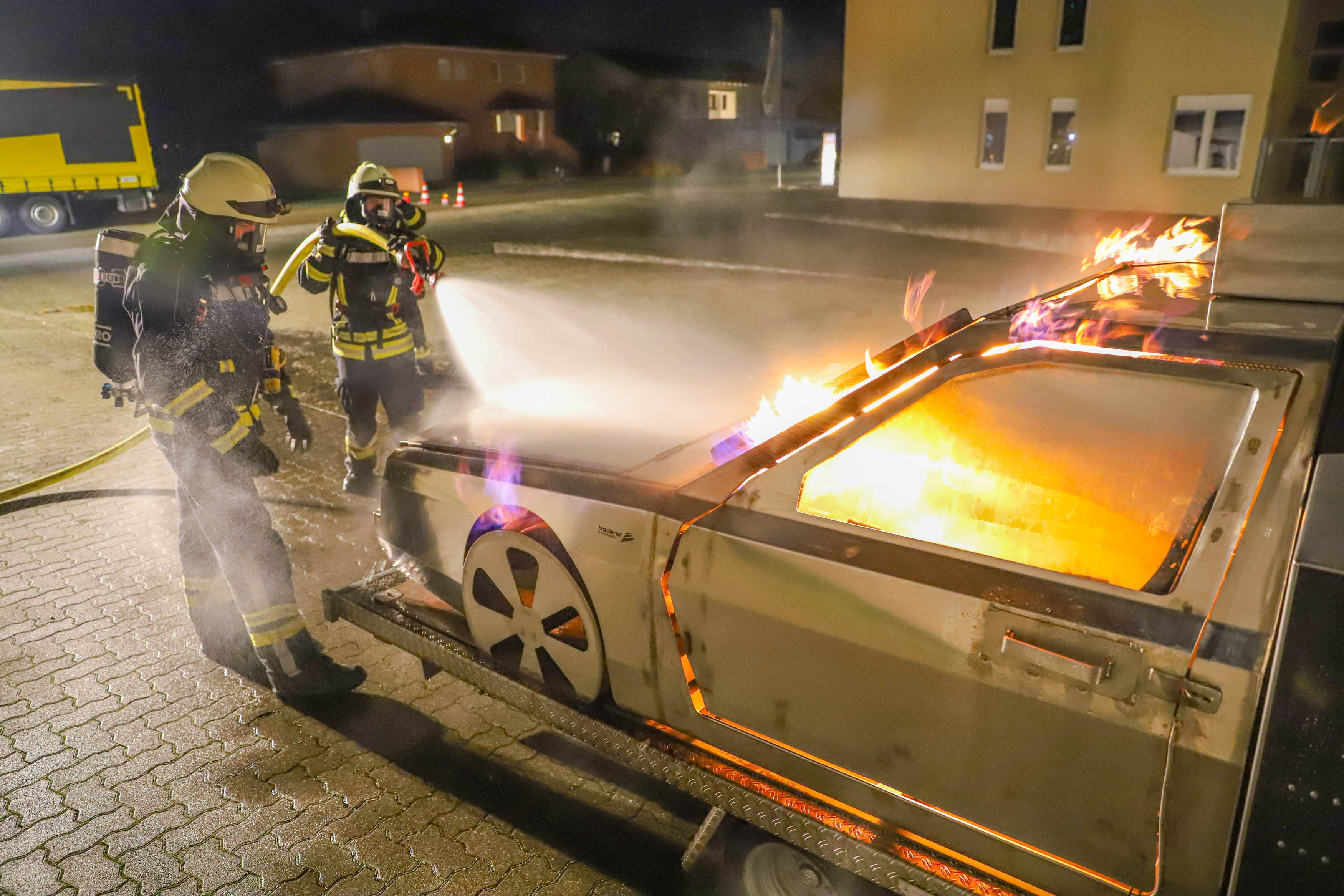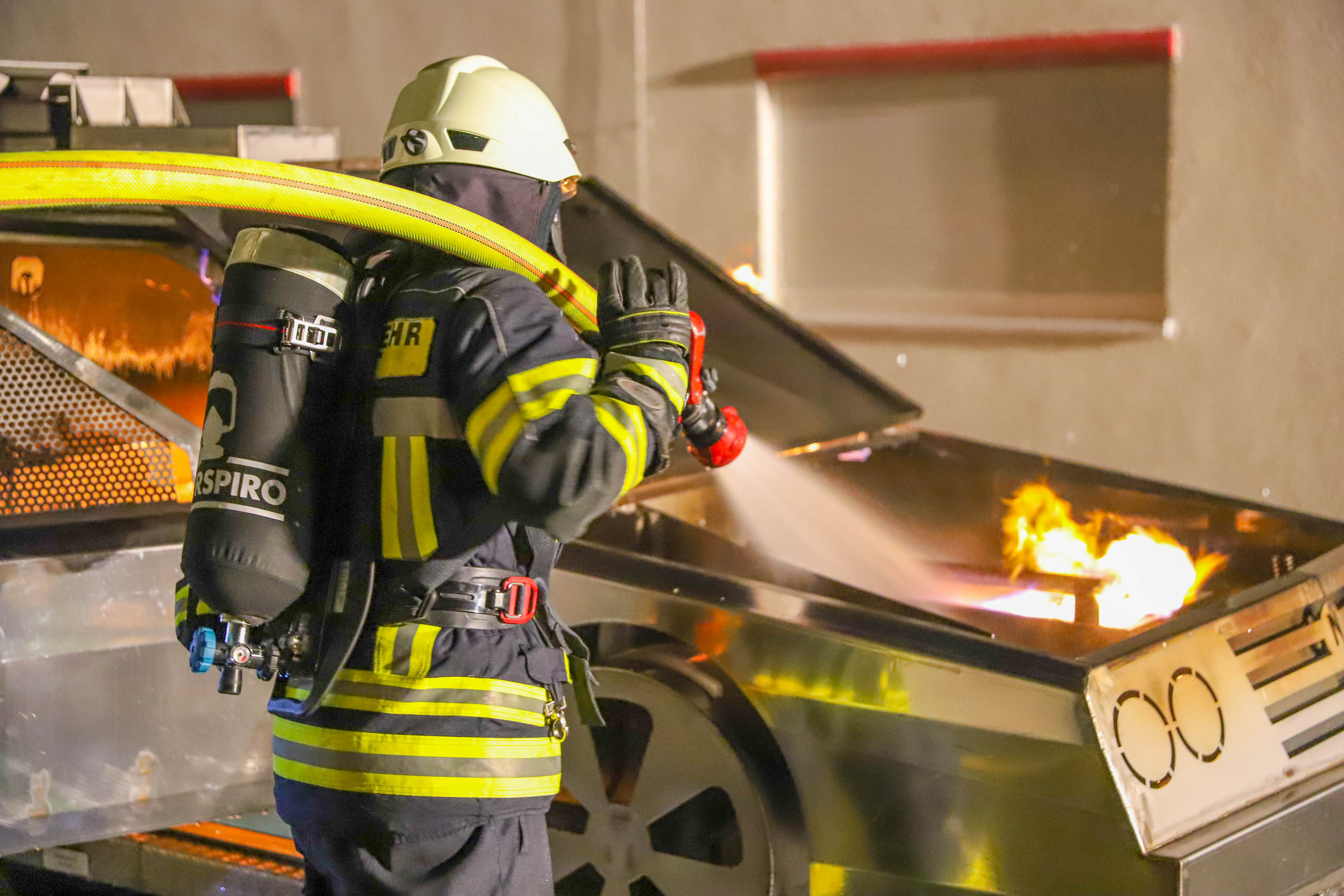 Dort konnten die Atemschutzgeräteträger aber auch die Einsatzmannschaft ohne Atemschutz mit Feuerlöschern einen Fahrzeugbrand – sowohl im Vollbrand, als auch im Entstehungsbrand – bekämpfen und verschiedene Verhaltensweisen im Vorgehen beim Löschangriff trainieren.