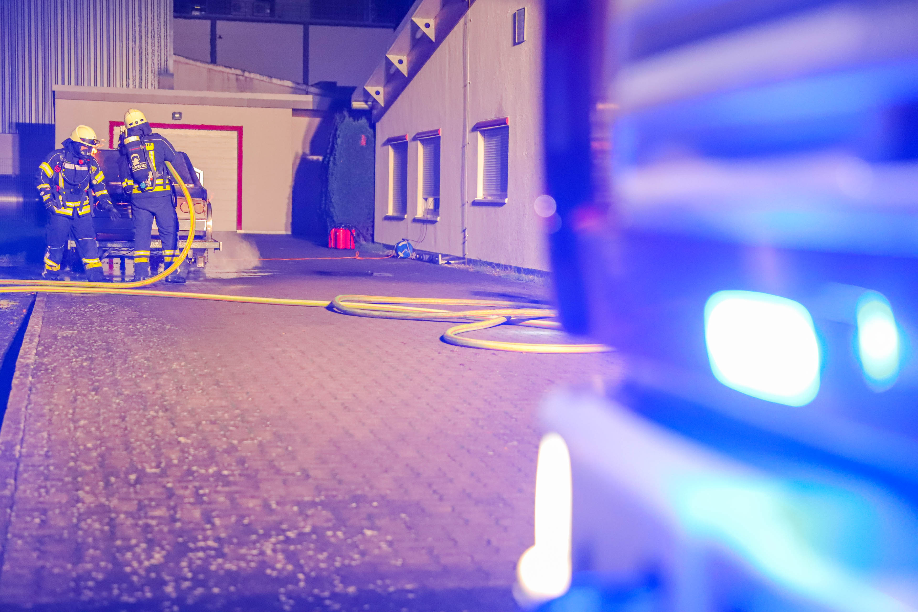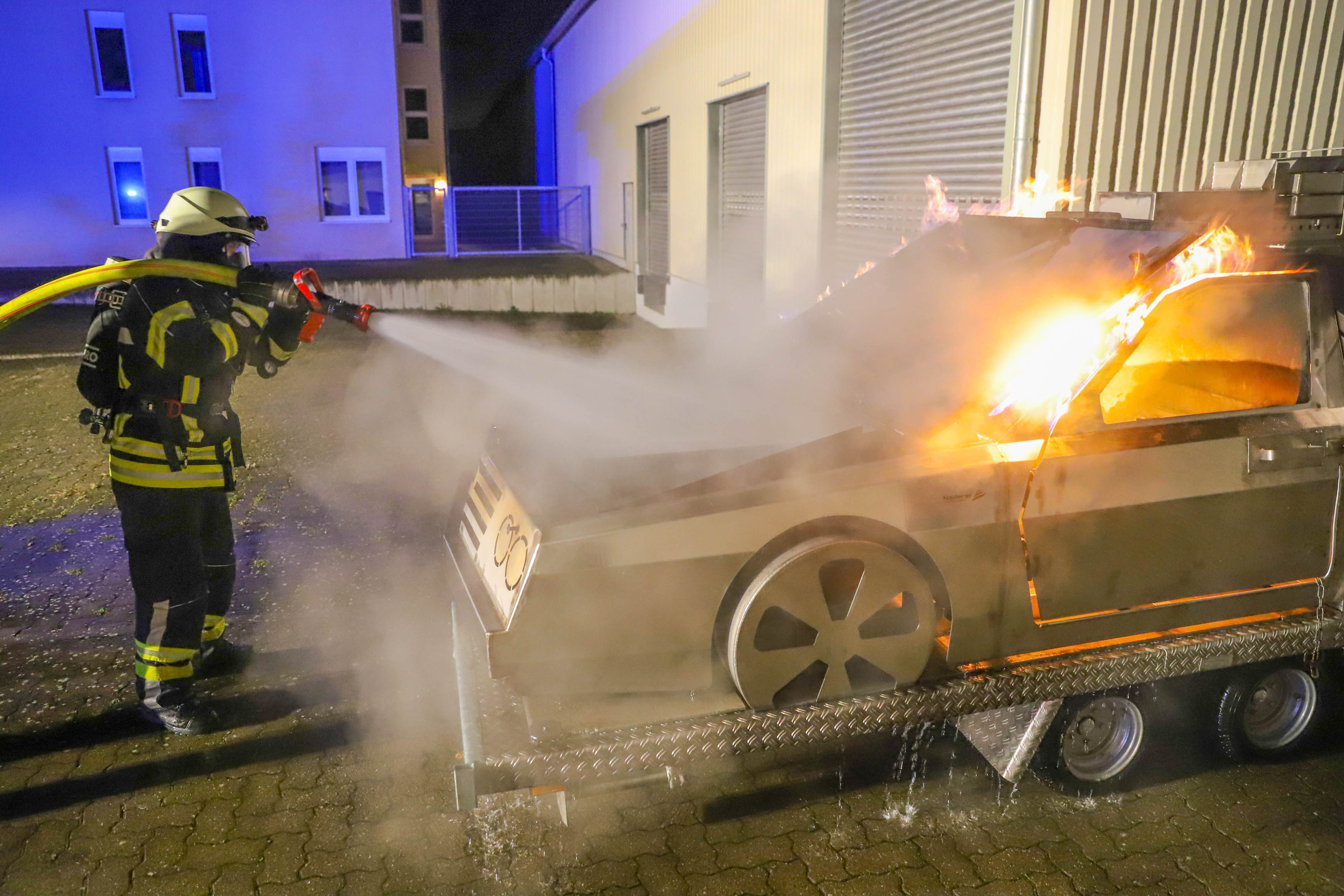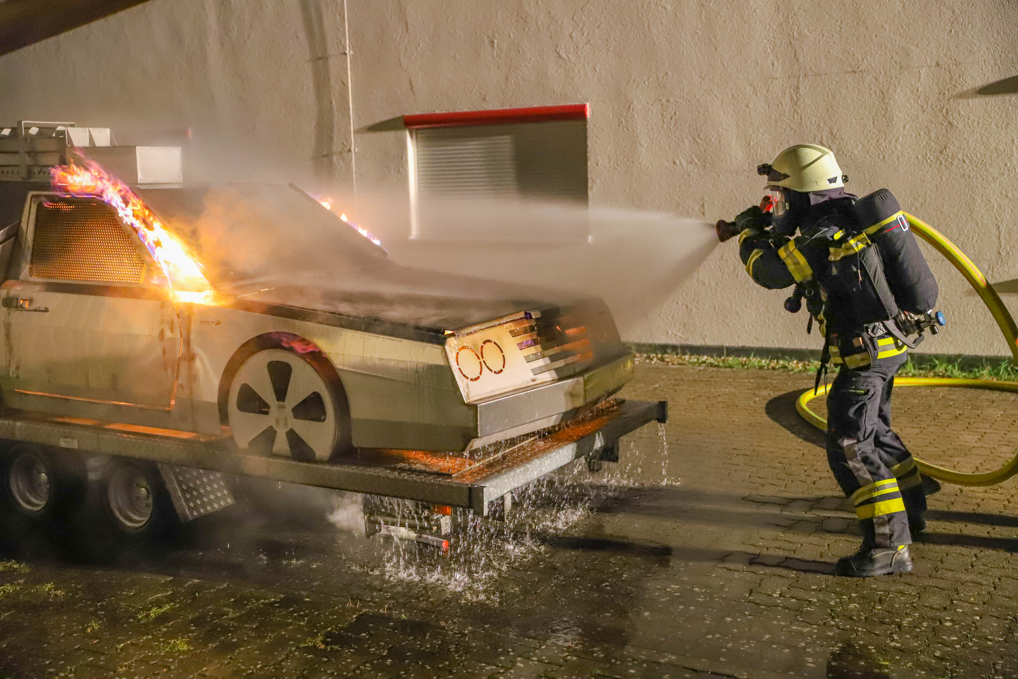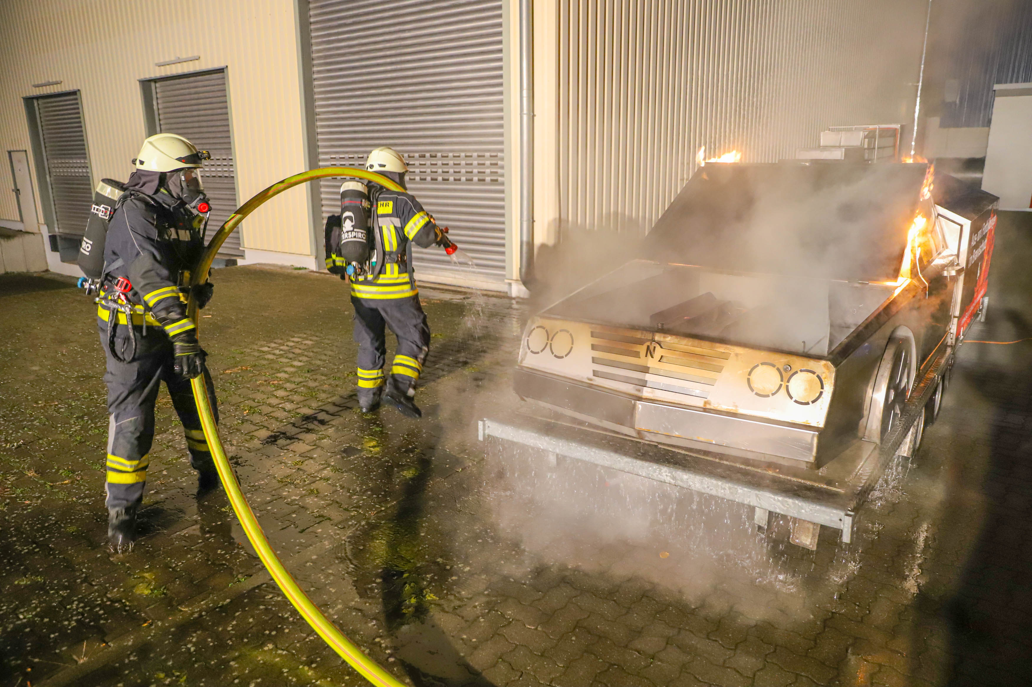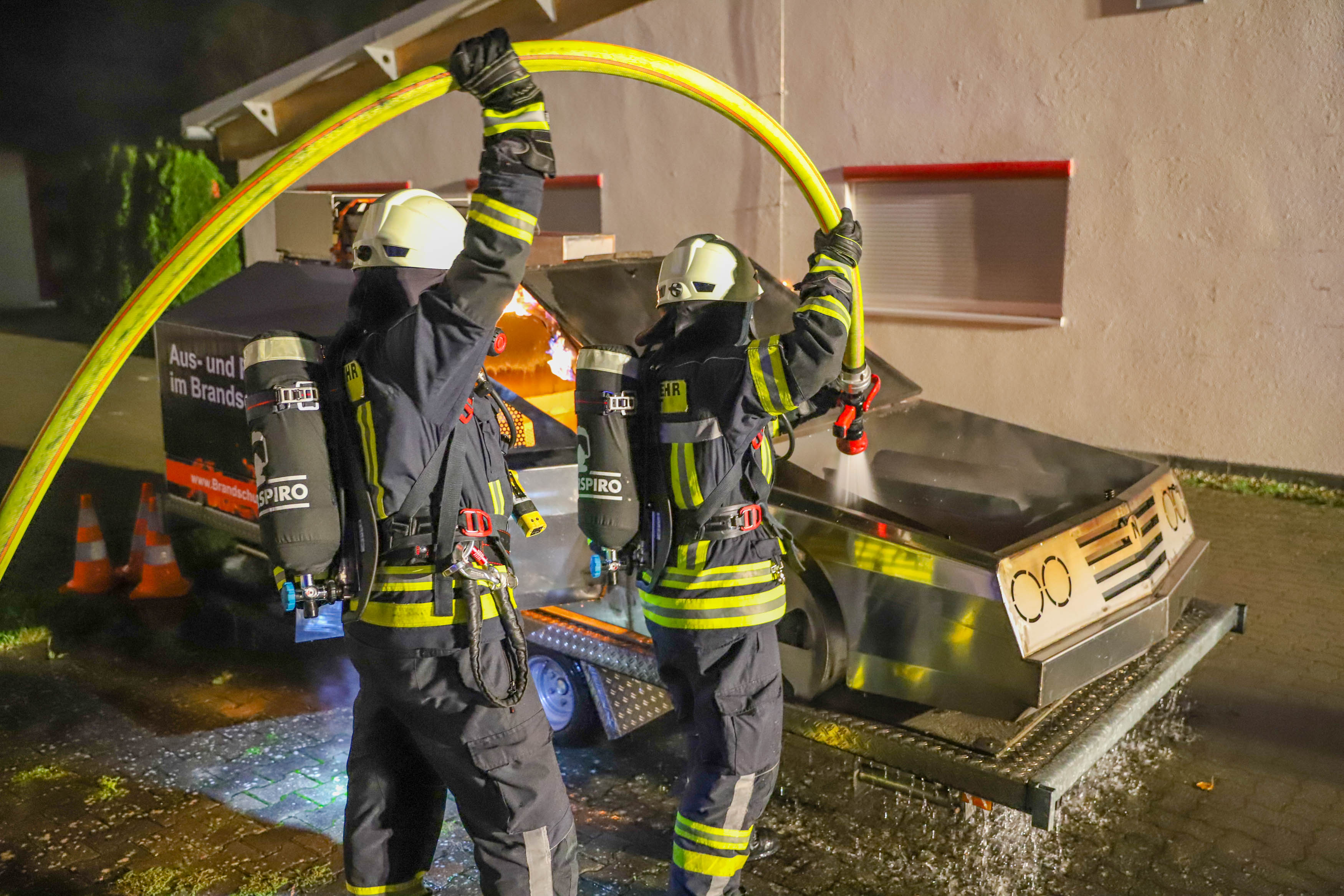 Dort konnten die Atemschutzgeräteträger aber auch die Einsatzmannschaft ohne Atemschutz mit Feuerlöschern einen Fahrzeugbrand – sowohl im Vollbrand, als auch im Entstehungsbrand – bekämpfen und verschiedene Verhaltensweisen im Vorgehen beim Löschangriff trainieren.