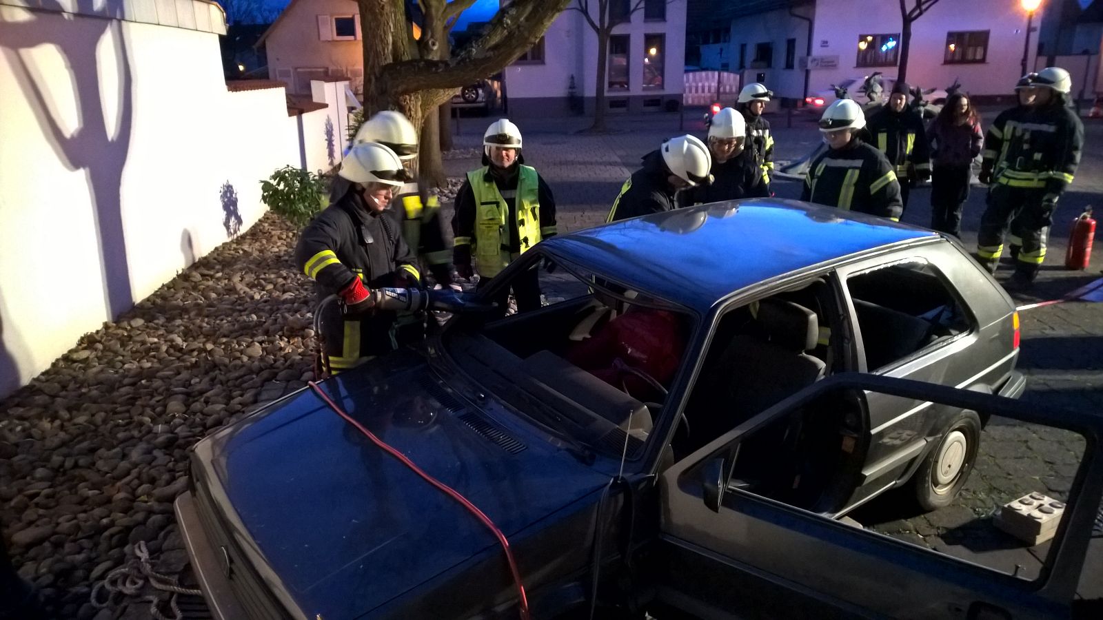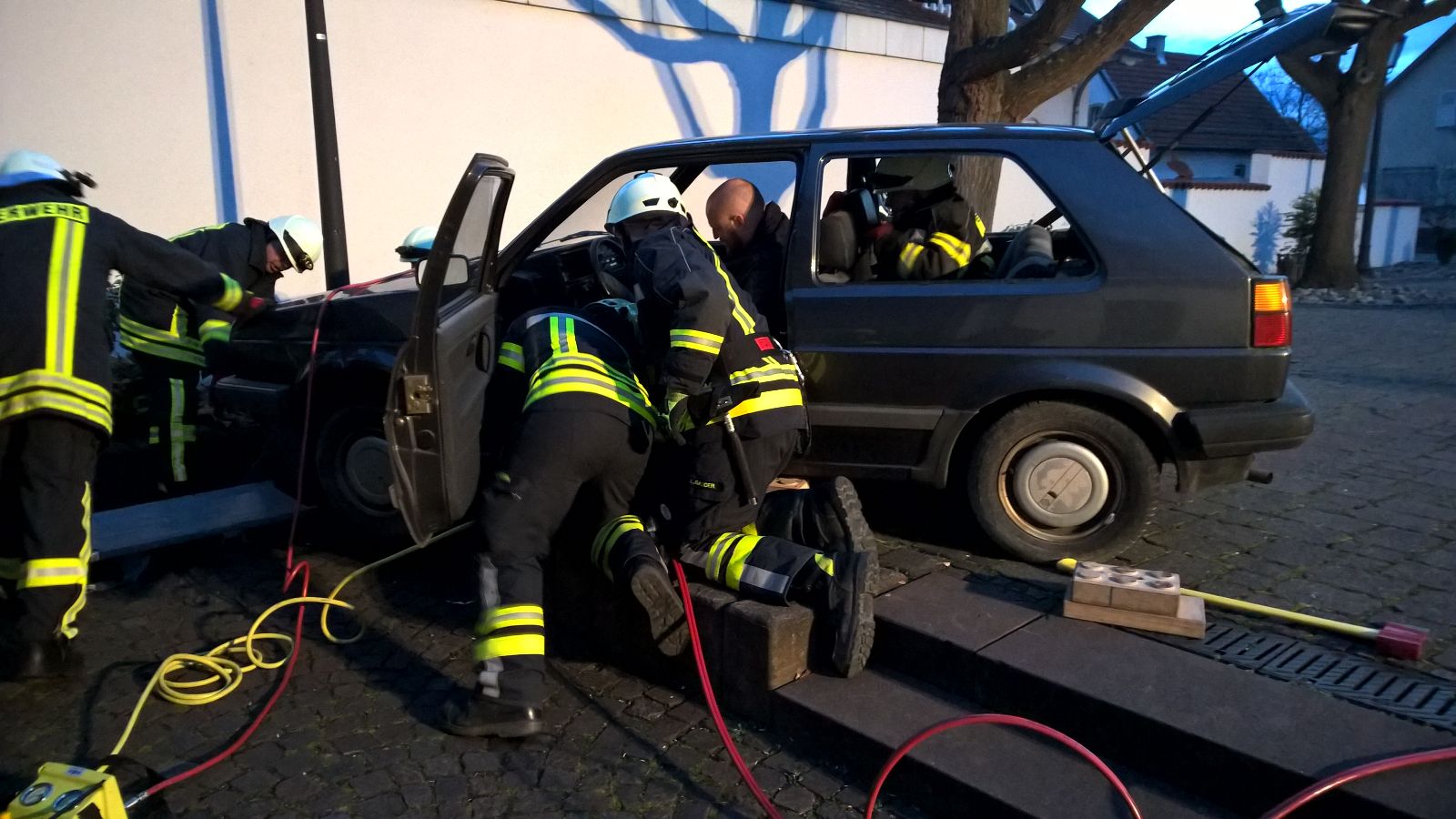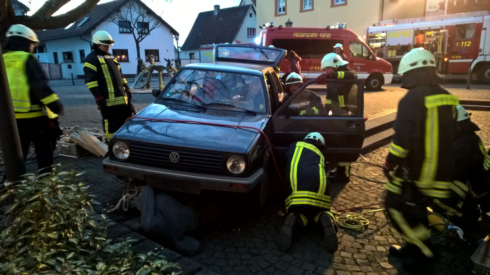 Nachdem die simulierte Lage vor Ort erkundet wurde, begann man mit der Vorbereitung zur Rettung der eingeklemmten Personen. So wurde beispielweise der PKW-Fahrer im Fußbereich eingeklemmt. Hier musste mittels hydraulischem Rettungsgerät die Pedale abgeschnitten werden. Des Weiteren wurde das Dach des verunfallten PKW abgetrennt um die auf der Rückbank sitzende Person schonend mittels Spineboard retten zu können. Um den unter dem Fahrzeug befindlichen Patient befreien zu können wurde das Fahrzeug mittels Hebekissen angehoben und mit Unterbaumaterial gesichert.