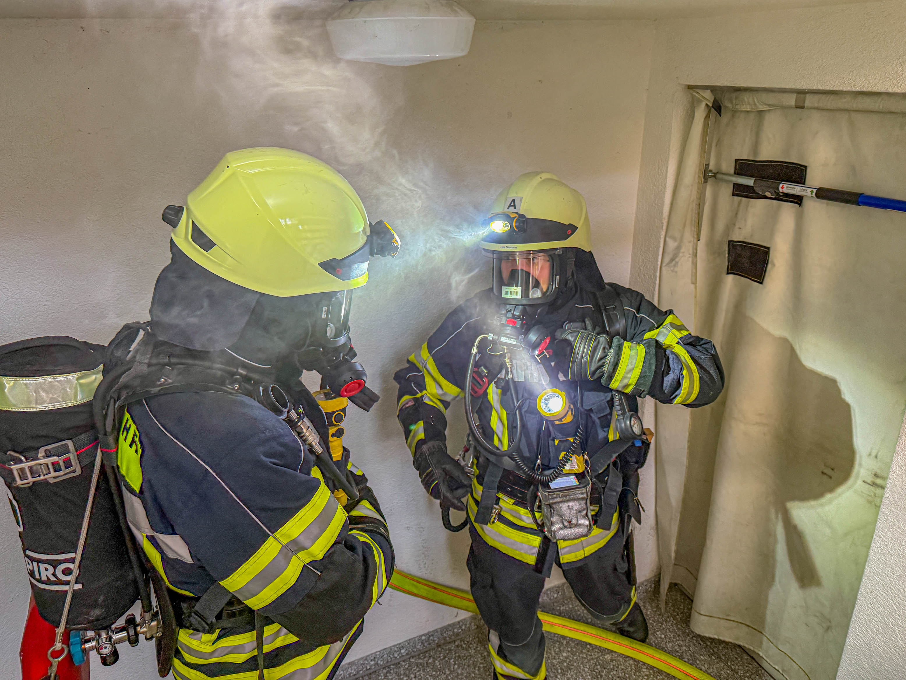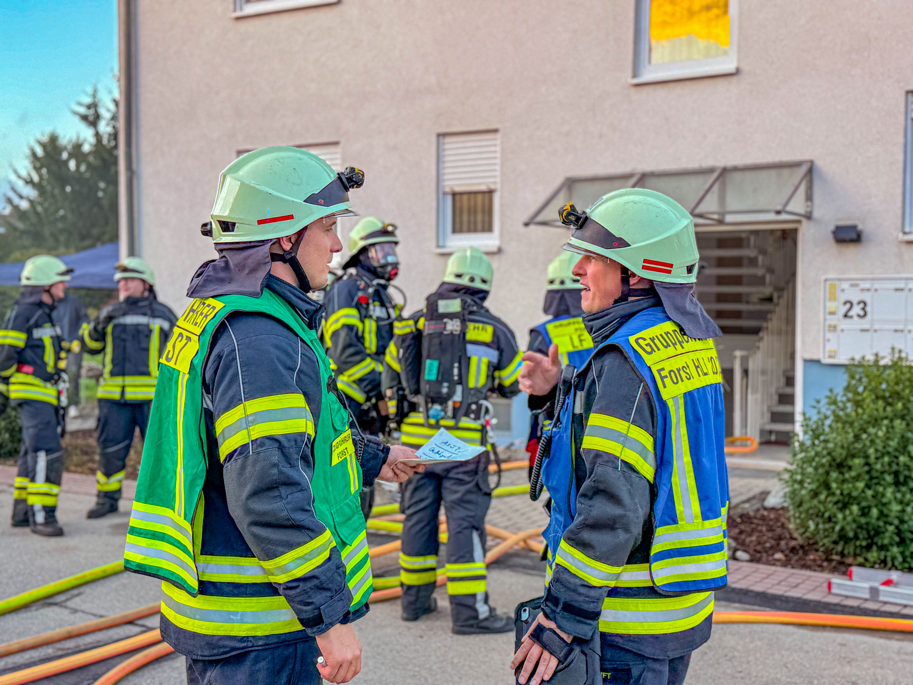 Das Übungsszenario stellte sich als besonders anspruchsvoll heraus, da gleich drei Personen an verschiedenen Orten in akuter Lebensgefahr waren und gleichzeitig eine Brandausbreitung auf das Wohnhaus sowie benachbarte Gebäude verhindert werden musste. Aufgrund der Komplexität wurde das Alarmstichwort fiktiv von „Brand 4“ auf „Brand 5“ erhöht.