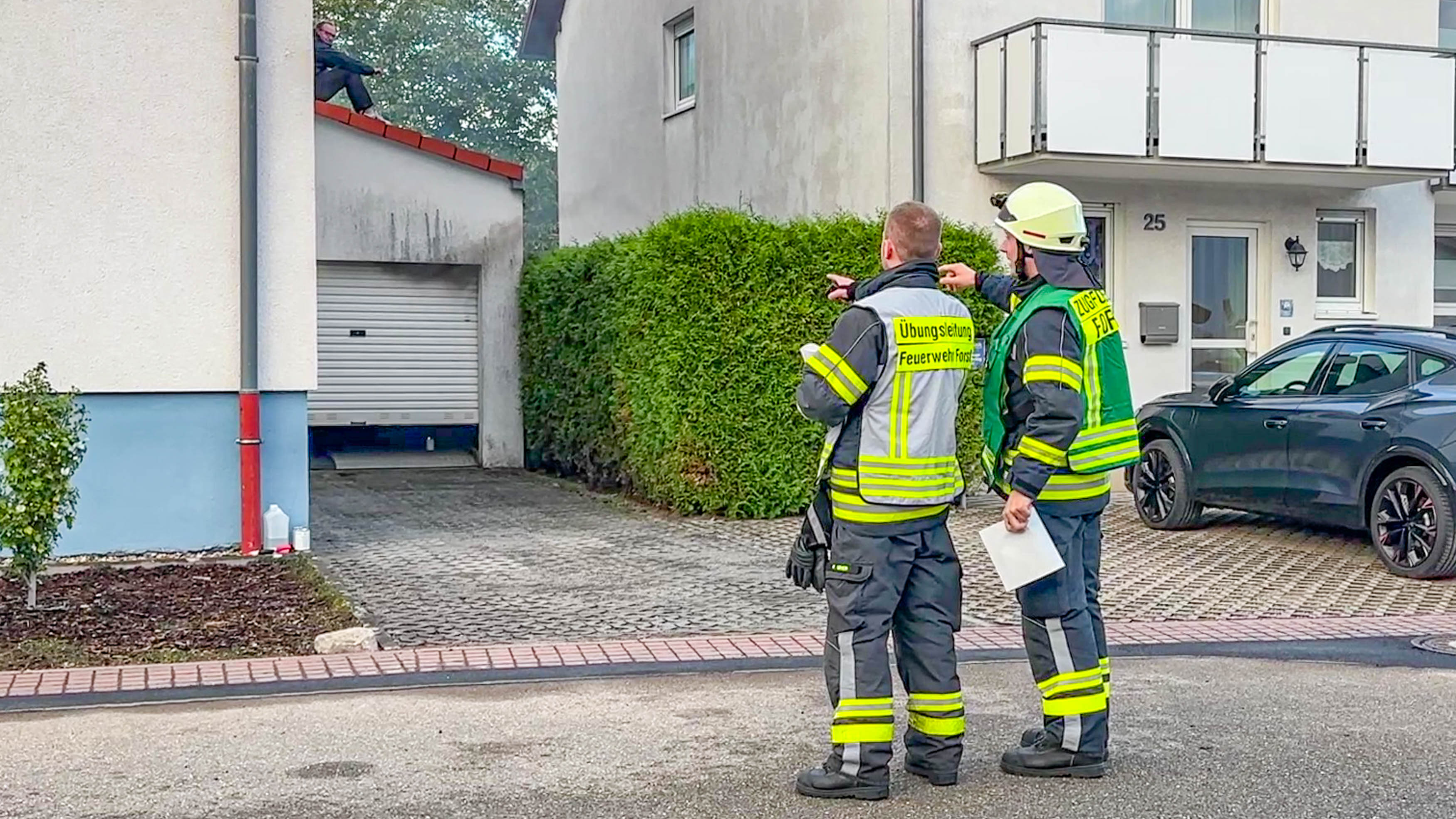 Unter dem Stichwort „Brand 4 – Feuer, Menschenleben in Gefahr“ probten die Einsatzkräfte ein äußerst realitätsnahes Szenario: Nach einer angenommenen Explosion während einer Grillparty stand eine an ein Mehrfamilienhaus angebaute Garage in Vollbrand. Die Flammen hatten bereits über ein Kellerfenster auf die Kellerräume des Hauses übergegriffen, dichter Rauch drang aus mehreren Öffnungen und erschwerte die Orientierung erheblich. Insgesamt mussten drei Personen aus lebensbedrohlichen Situationen gerettet werden – eine Person befand sich auf dem Dach der Garage, eine Übungspuppe wurde in der stark verrauchten Garage vermisst, und eine weitere Person galt im mit Kunstnebel gefüllten Keller als verschollen.