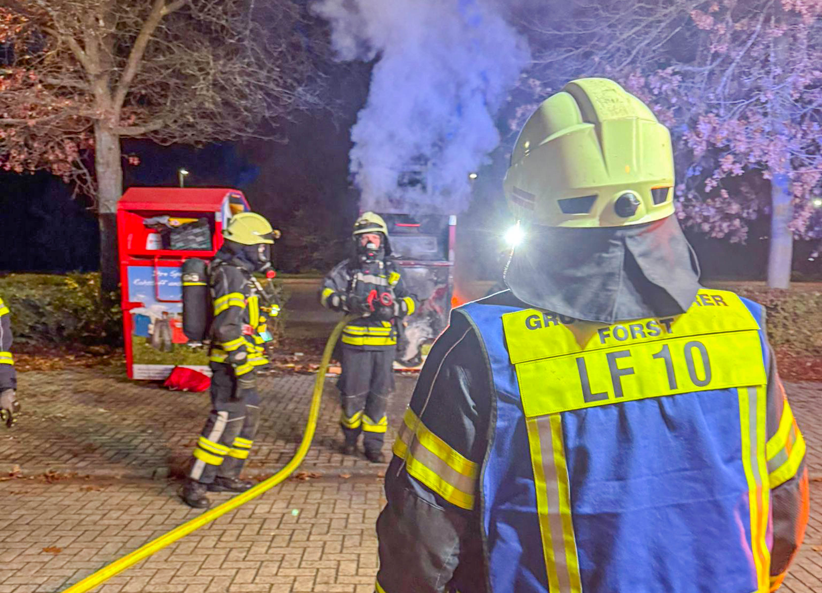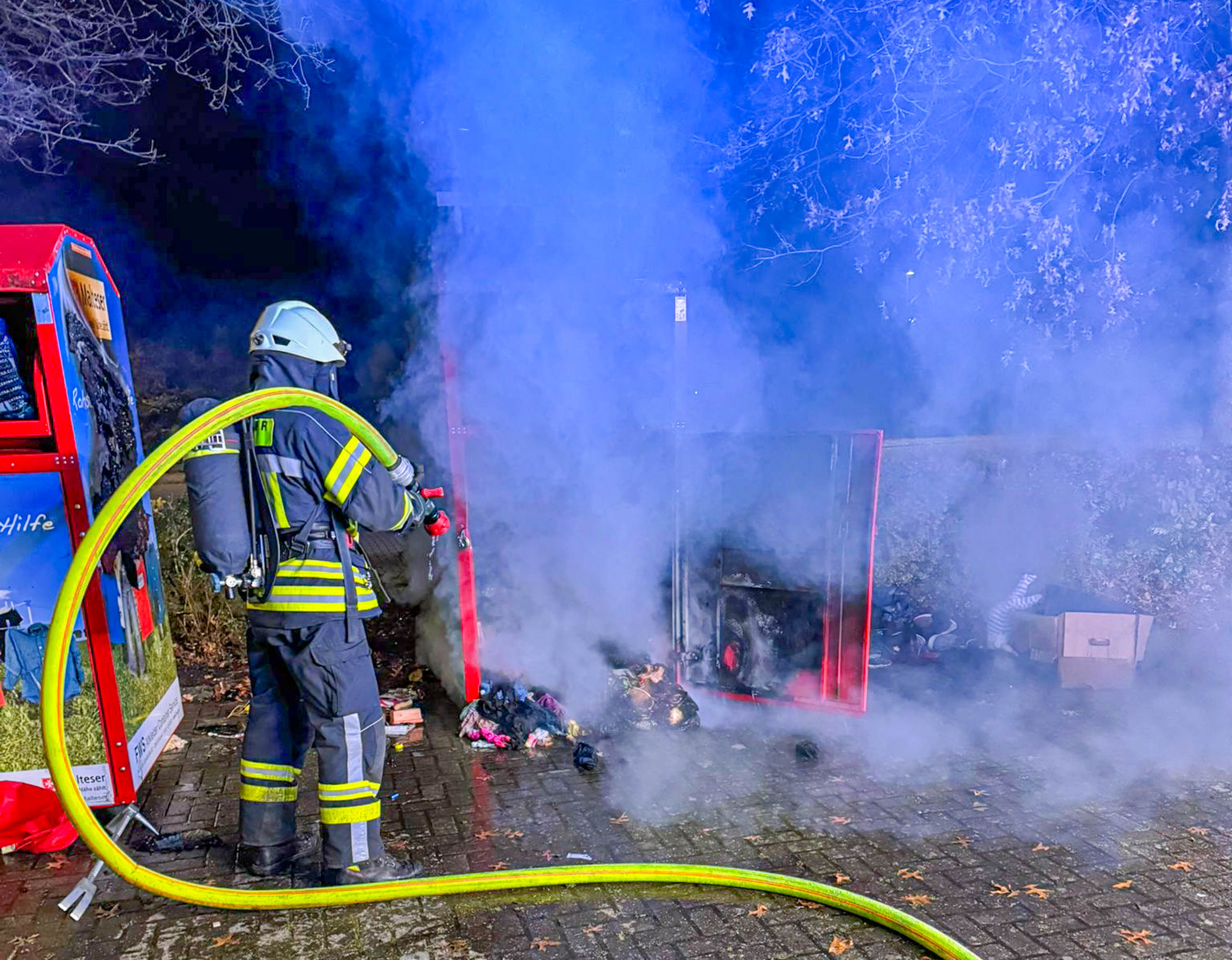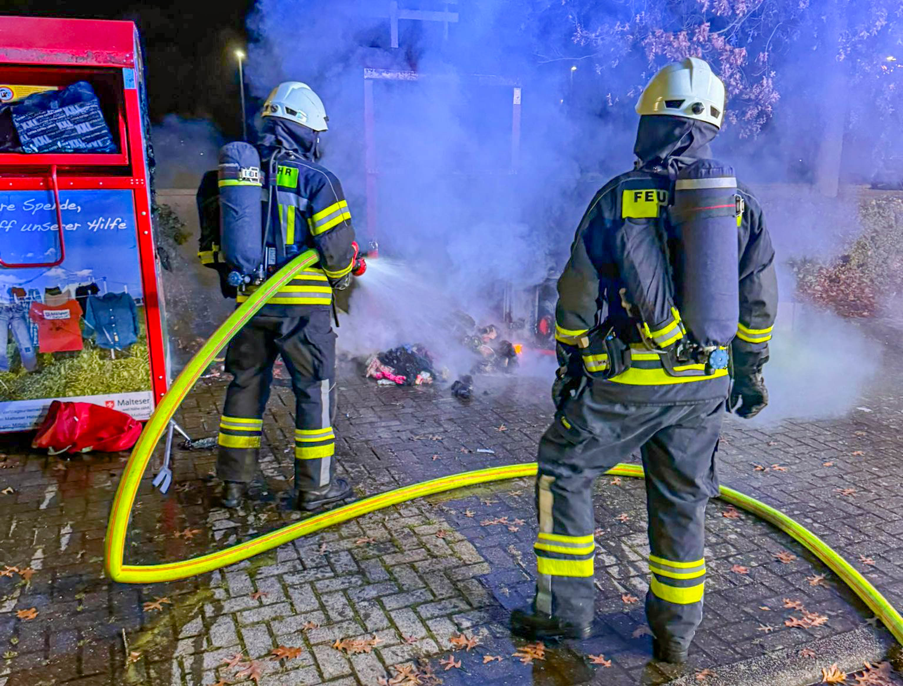 Beim Eintreffen stand ein Altkleidercontainer in Vollbrand. Das Feuer konnte durch einen Trupp unter Atemschutz rasch bekämpft werden. Der Container wurde hierfür aufgebrochen und letzte Glutnester mit der Wärmebildkamera ausfindig gemacht.