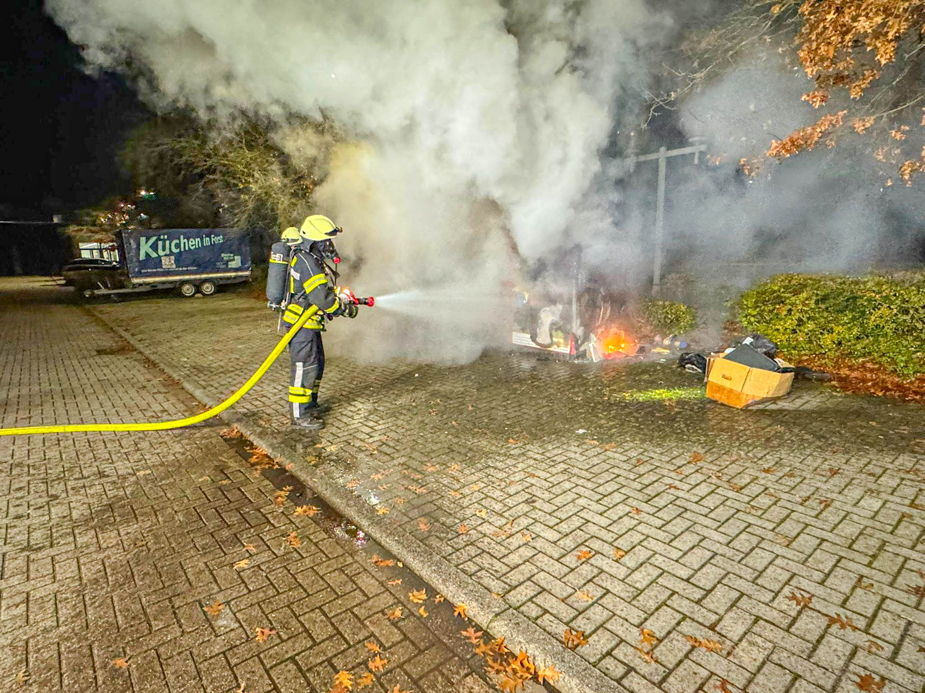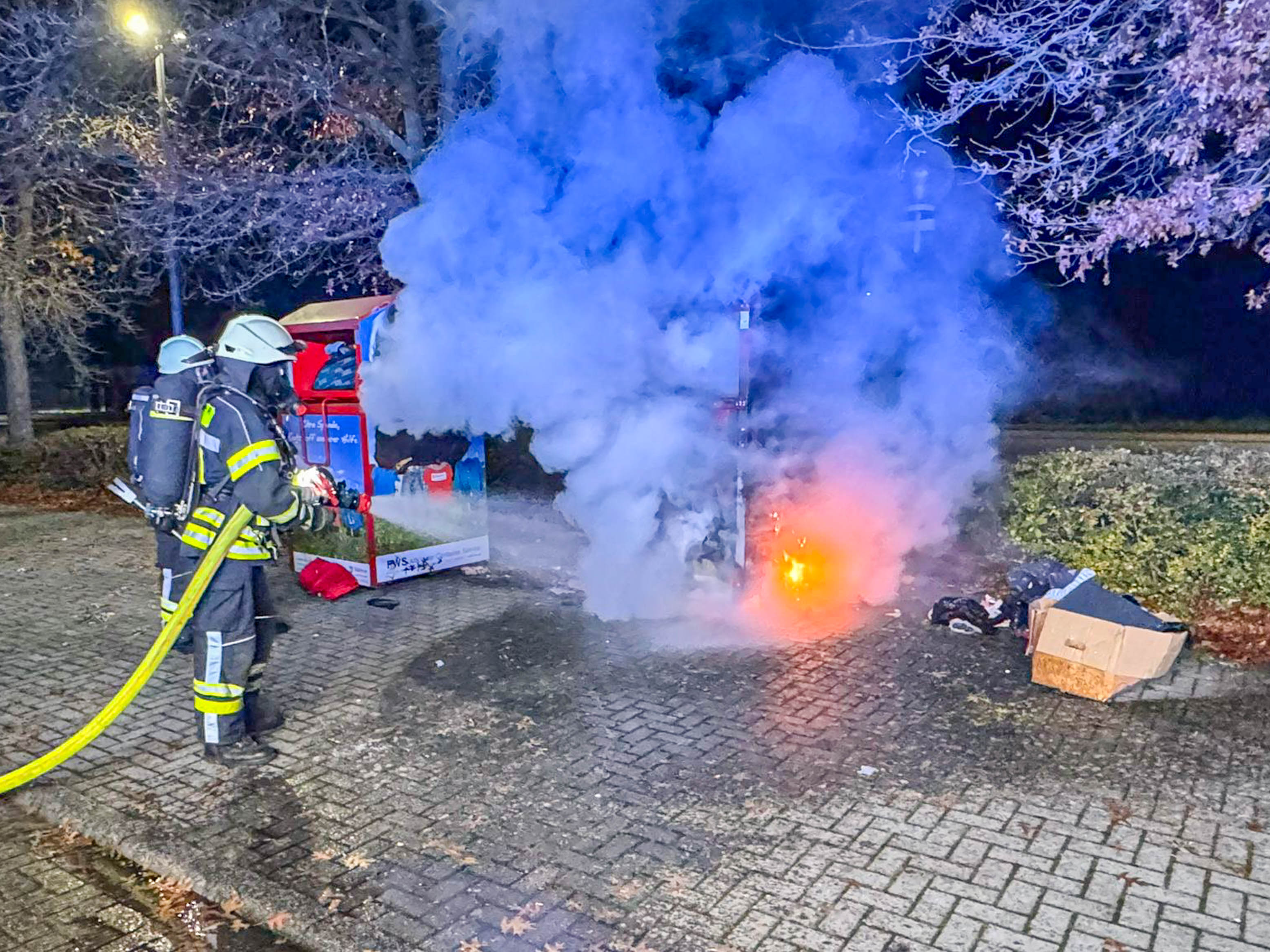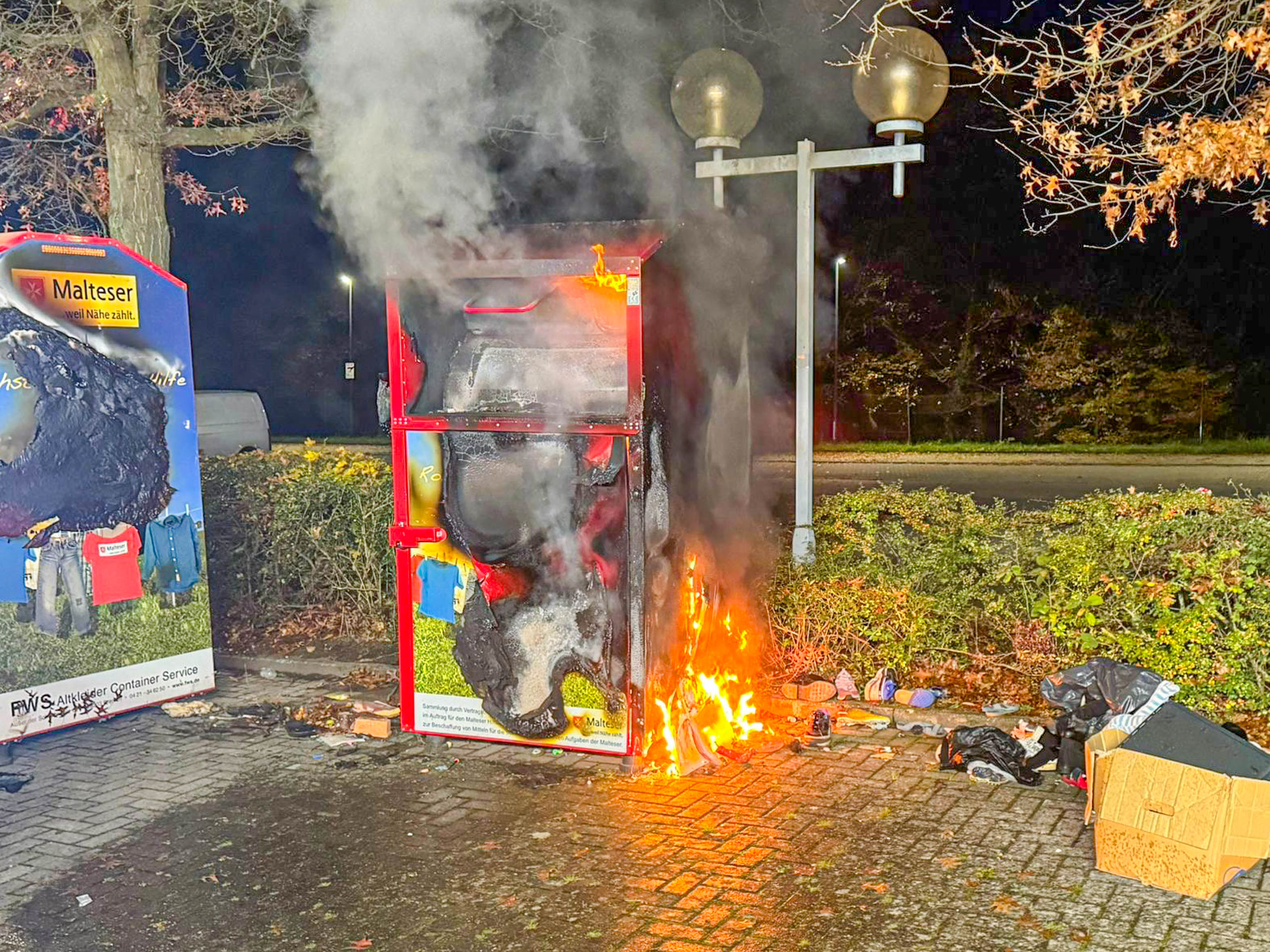 Beim Eintreffen stand ein Altkleidercontainer in Vollbrand. Das Feuer konnte durch einen Trupp unter Atemschutz rasch bekämpft werden. Der Container wurde hierfür aufgebrochen und letzte Glutnester mit der Wärmebildkamera ausfindig gemacht.